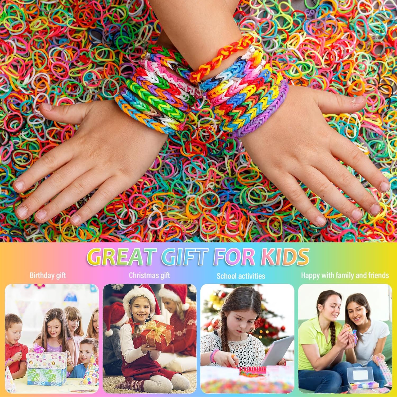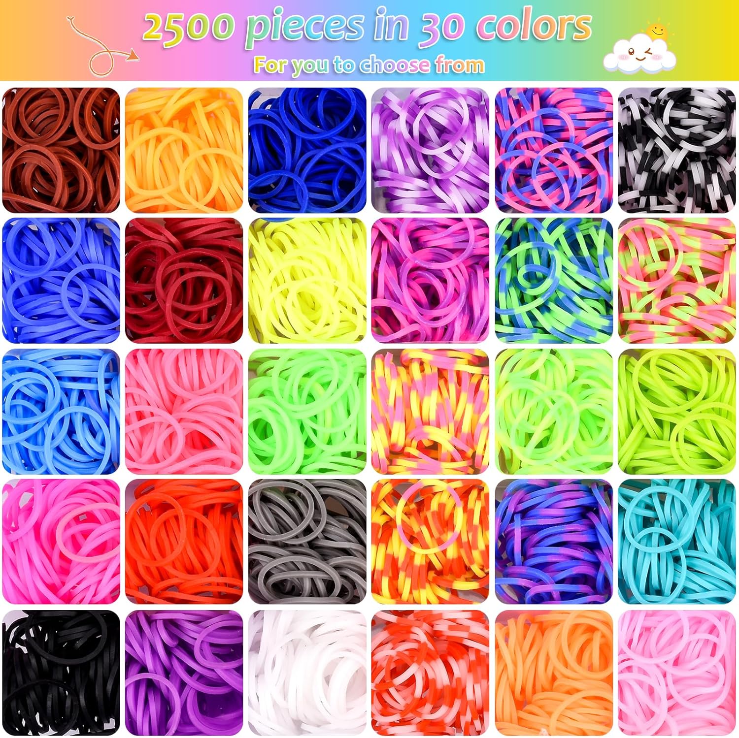 【2500 Kit Braccialetti in Elastico】Tutto ciò di cui hai bisogno per realizzare creazioni, inclusi 2500 elastici colorati di alta qualità, 40 perline dell'alfabeto (26 lettere intere), 15 ciondoli in silicone (colori casuali), circa 30 perline a tubo, circa 15-20 perline di frutta, 3 fionde, 3 ganci, 2 portachiavi, 100 clip a S. 【Materiale Premium】 Realizzato in resina di gomma ecologica di alta qualità, senza lattice, senza piombo e senza ftalati. La gomma dell'anello ha una buona elasticità, morbidezza e durata, non è facile da rompere e riutilizzabile. L'utilizzo da parte dei bambini è garantito in tutta sicurezza! 【Scatena la tua creatività】 Questo kit di braccialetti elastici è disponibile in una varietà di colori che possono creare molte cose divertenti come braccialetti, ciondoli, accessori per borse e altre creazioni relative a Loom! Impedisce a tuo figlio di essere assorbito ogni giorno dai giochi sul cellulare o dai programmi TV e offre ore di divertimento senza dispositivi elettronici. I nastri da telaio possono stimolare la creatività e la manualità dei bambini. 【Facile da trasportare e riporre】 Questo kit di braccialetti elastici viene fornito con un organizer per riporre tutti gli elastici, gli elastici di ogni colore sono posizionati in uno scomparto separato per mantenerli organizzati, questo aiuta anche i bambini a sviluppare l'abitudine di organizzare e classificare i loro oggetti, questo è sicuramente un fantastico kit per creare braccialetti per te. 【Regalo unico】 Questo kit di braccialetti elastici per bambini è un regalo perfetto per i bambini. I bambini possono dare libero sfogo alla loro fantasia e realizzare gioielli unici per se stessi. Nota: a causa delle dimensioni ridotte degli accessori, i bambini sotto i 5 anni dovrebbero essere accompagnati dai genitori per evitare problemi inutili.