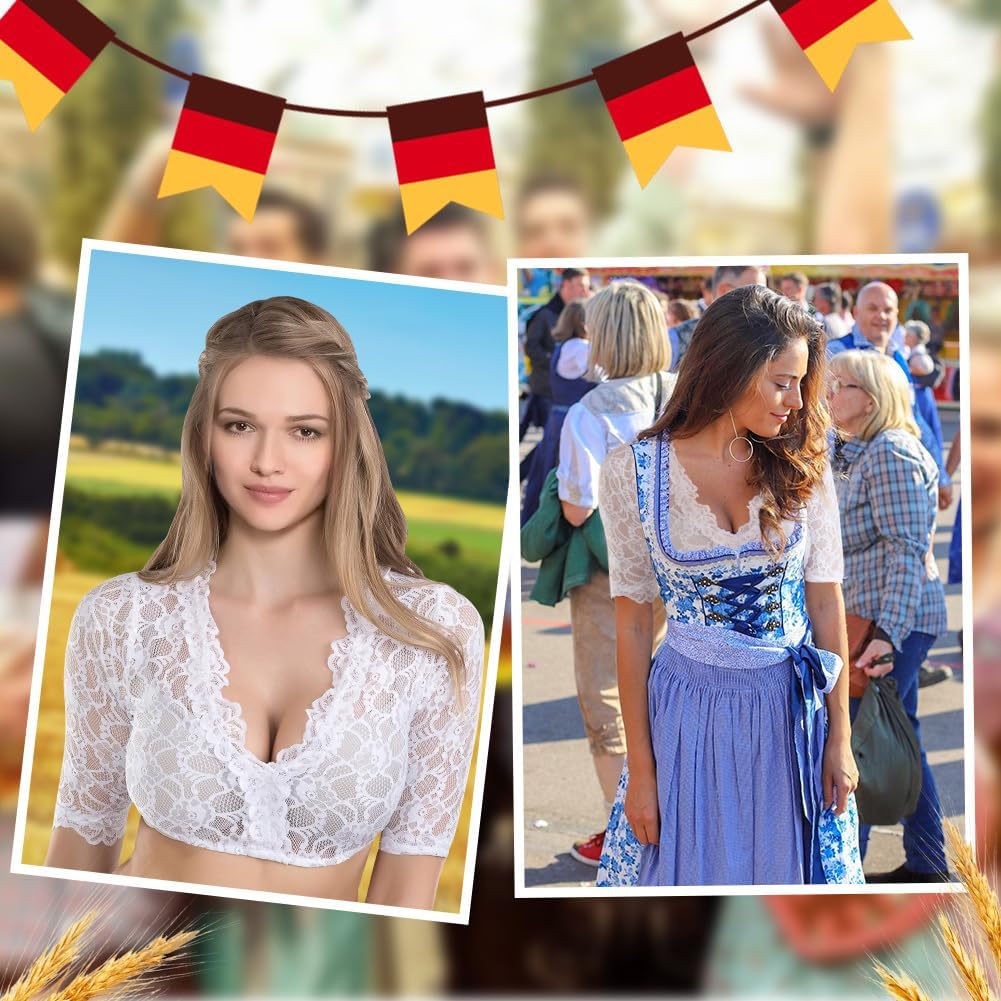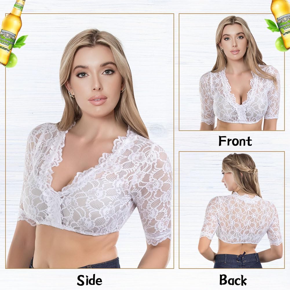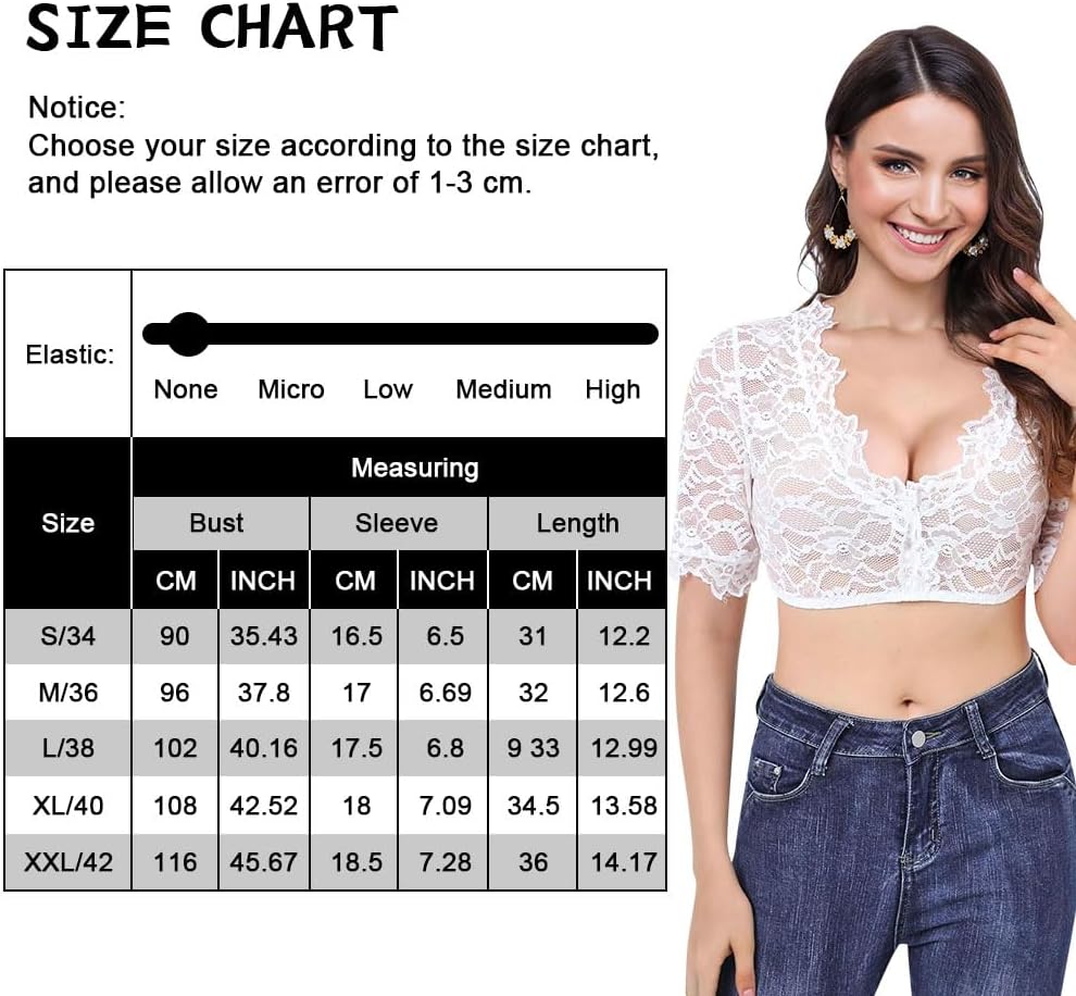 This is one of the most comfortable and best fitting dirndl blouses I've tried. This top has a very pretty floral lace pattern and an elasticated hem to stop it riding up. The very lightweight material is great for hot weather, as dirndls with a thick blouse can become uncomfortable in the heat. I'm size 8-10 and the size small fits me perfectly. Bear in mind the lace is completely see through, so you will need a white or nude coloured bra or vest top underneath.