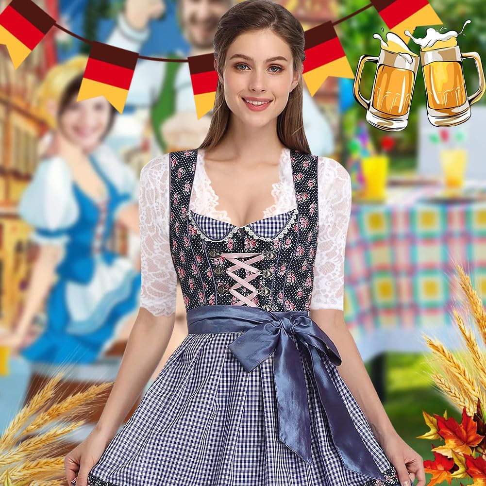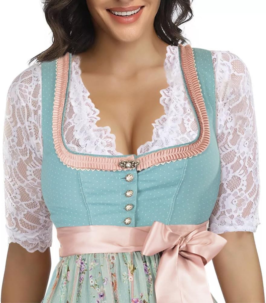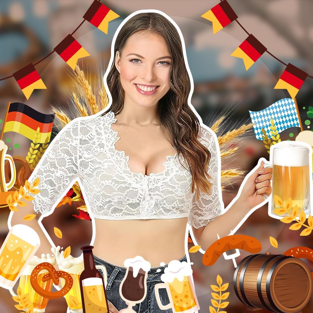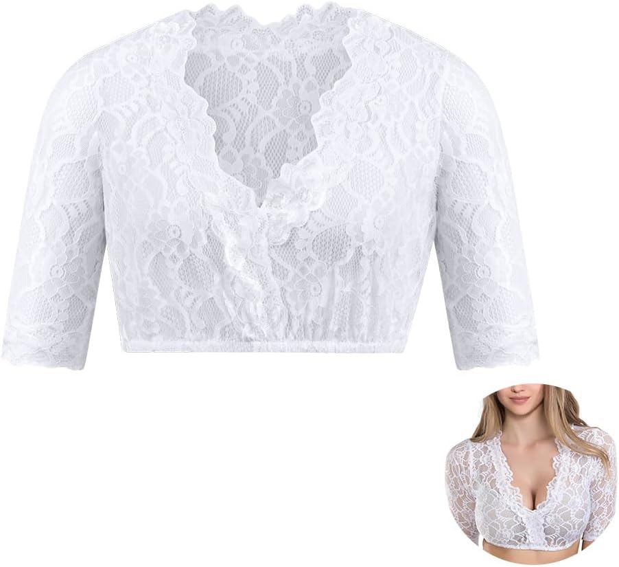 This is one of the most comfortable and best fitting dirndl blouses I've tried. This top has a very pretty floral lace pattern and an elasticated hem to stop it riding up. The very lightweight material is great for hot weather, as dirndls with a thick blouse can become uncomfortable in the heat. I'm size 8-10 and the size small fits me perfectly. Bear in mind the lace is completely see through, so you will need a white or nude coloured bra or vest top underneath.