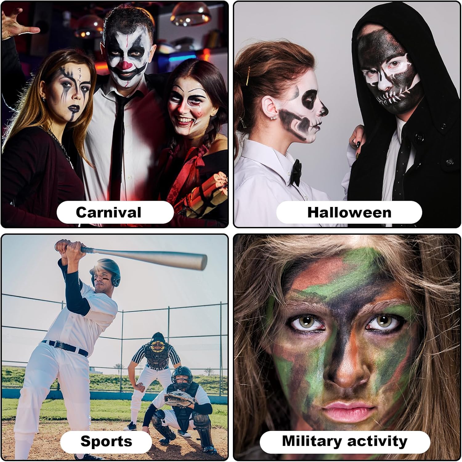【Materiale Sicuro】Camouflage Face Paint Sticks Kit realizzato con materiali di alta qualità, il colore mimetico è delicato e delicato sulla pelle, altamente colorato, non tossico e insapore. Puoi girare il pavimento per aprire e chiudere, niente più mani sporche. Resiste al sudore e alla pioggia e non si strofina facilmente su foglie o altri depositi naturali. 【Facile Da Usare】Camouflage Body Painting Sticks Kit con una copertura impeccabile, può essere facilmente applicato e rimosso con un solo tocco. È perfetto per la caccia, il camuffamento, il cosplay militare e altre attività. Tuttavia, a causa delle differenze individuali nella sensibilità della pelle, si consiglia vivamente di effettuare un test cutaneo su una piccola area prima dell'uso. 【Facile Da Pulire】 Face Paint Stick del viso è particolarmente adatto ai principianti, applicare sulla pelle con una spugna o un pennello o con la punta delle dita, oppure utilizzare salviette detergenti oleose con formula lattiginosa o balsamo detergente professionale ceco, lavare facilmente con uno struccante. 【Ampia Applicazione】 Il bastoncino per Mimetico Trucco Militare Dell'Esercito leggero e portatile è perfetto per il trucco FX di Halloween, come gotico, vampiro, clown, pantomima, zombie, faccia di teschio, pittura di guerra, ecc. Adatto anche per feste in maschera a tema, cosplay, spettacoli teatrali, carnevali, spettacoli di festival musicali. 【Miglior Regalo】 Che tu abbia bisogno di ridurre i riflessi sul set o di creare un look drammatico per il cosplay, questo stick per occhi nero è la scelta perfetta per te. Questo stick per occhi nero è un ottimo regalo per gli appassionati di sport, i cosplayer o chiunque ami esprimersi.