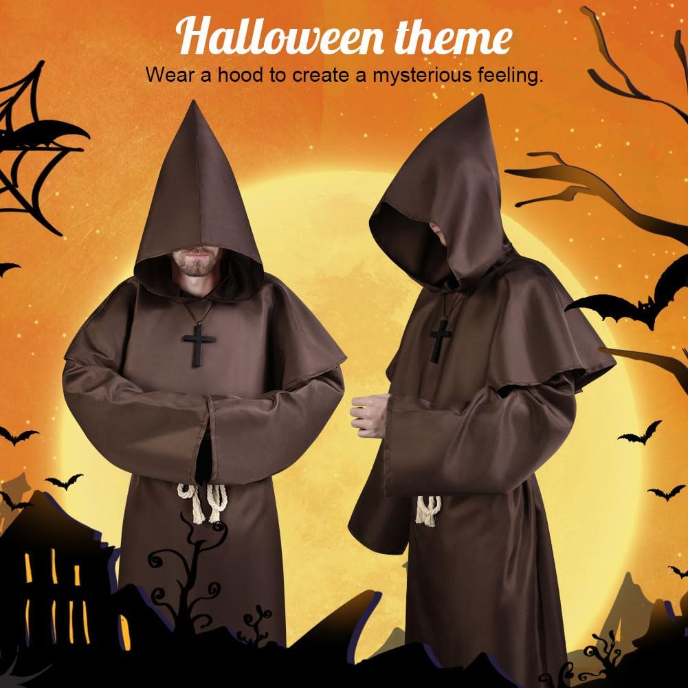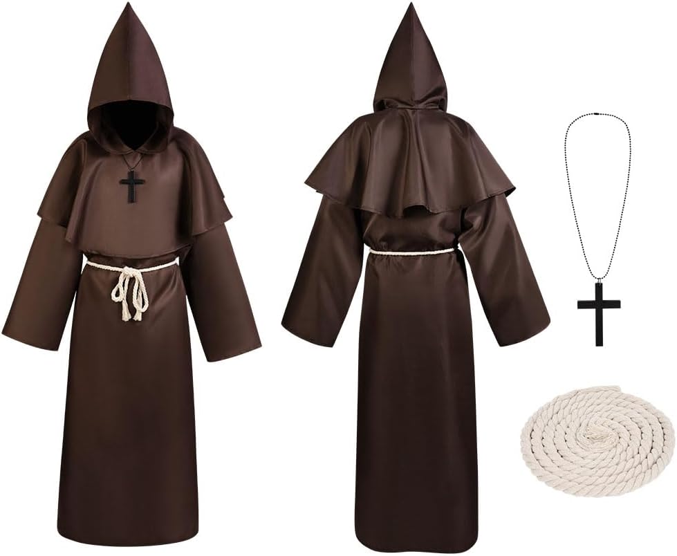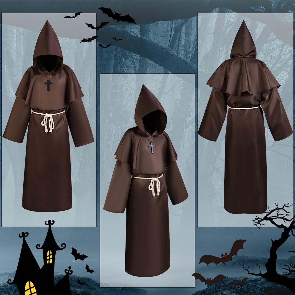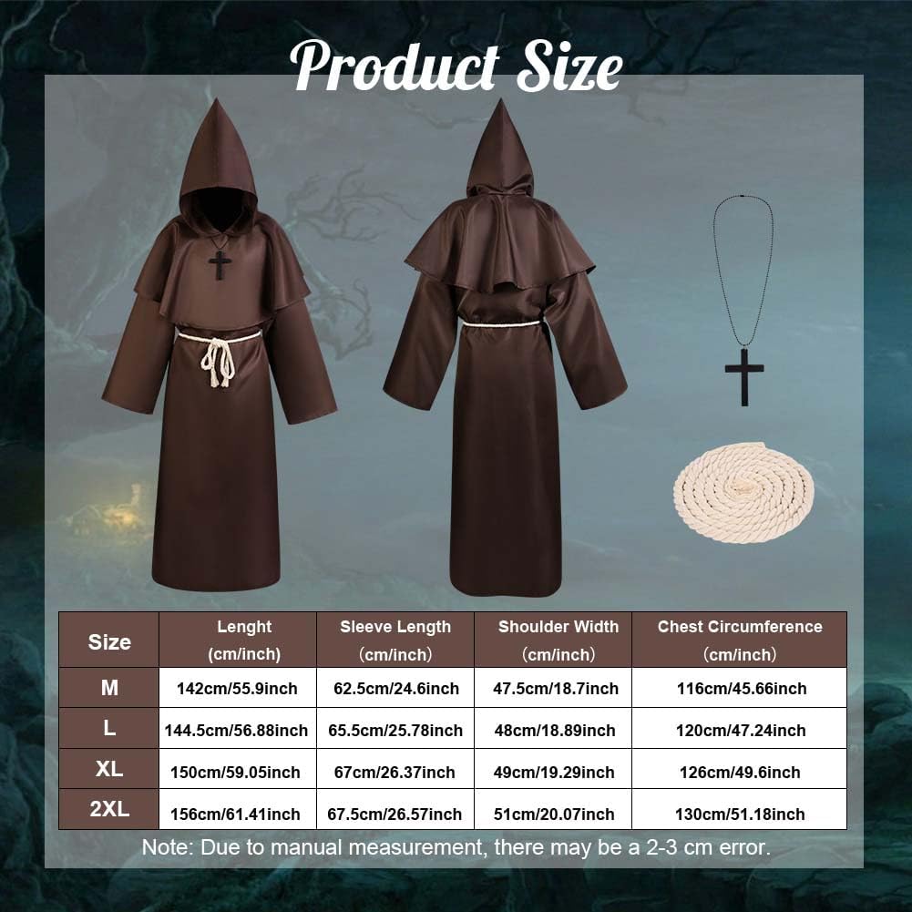 Descrizione Dettagliata Set di disegni per immagini di prete e monaco Un set completo di costumi medievali con cordoncini e colletti è molto adatto per gli amanti del cosplay, se vuoi essere un prete, un mago o un monaco, il nostro costume da prete sarà la scelta più adatta, molto adatto a varie feste a tema. Il mantello è così grande che può essere abbassato per coprire il viso, creando un'atmosfera spettrale, replica lo stile medievale rinascimentale. Il costume da prete per uomo è un accessorio ideale durante la festa. Porta un tocco di pietà alla festa con questo costume da monaco dall'aspetto autentico. Puoi inviarne uno al tuo compagno o vicino. Specifiche dell'imballaggio: 31 * 22 * 3,2 cm Quantità: 4 pezzi (1*corda+1*collana a croce+1*vestito+1*cappuccio) Taglia:XL/2XL Materiale: 100% poliestere Colore: marrone/nero