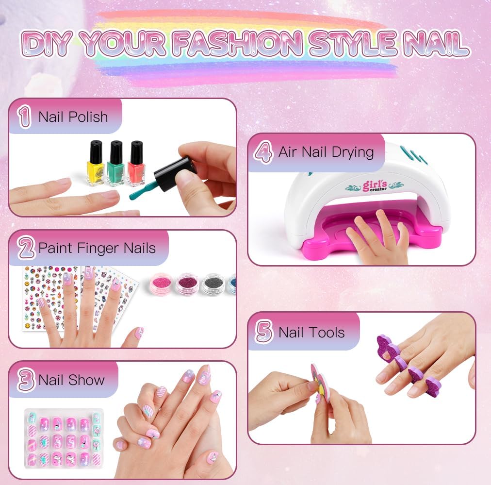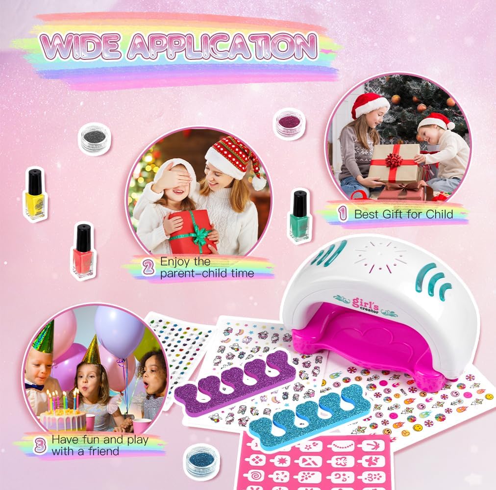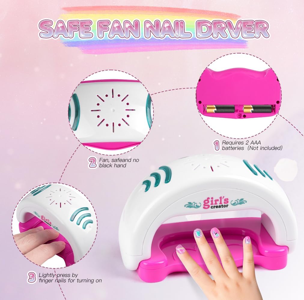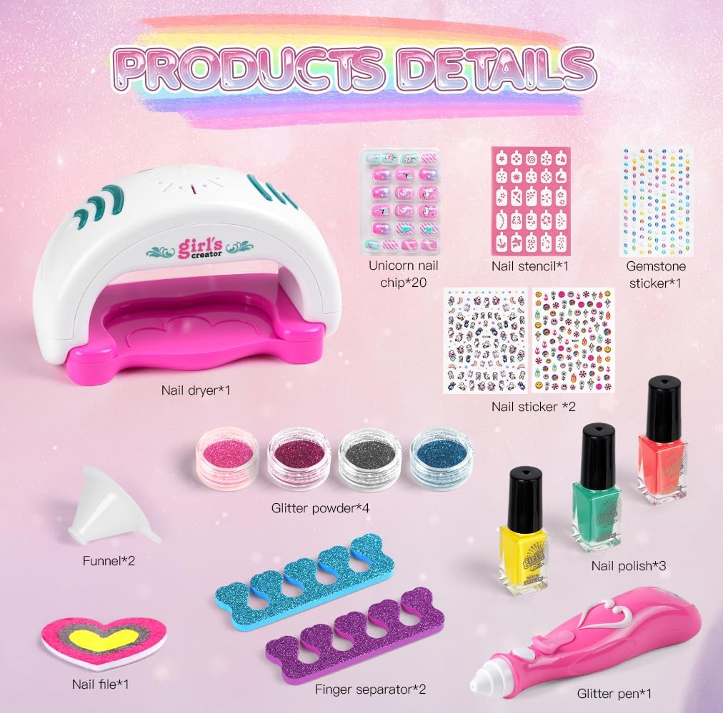 🩰KIT SMALTO PER UNGHIE PER RAGAZZE: Il nostro set manicure per bambini include: 1 * asciuga unghie, 3 * smalto per unghie, 4 * polvere glitterata, 1 * adesivo per nail art con gemme di cristallo, 20 * foglio per unghie unicorno, 2 * separatori per dita, 1 * modello per unghie, 2 * adesivi per unghie, 1 lima per unghie, 2 imbuti, 1 penna glitterata. Gli accessori per kit nail art abbondanti possono essere progettati molto di stili di nail art. 🎨SICURO E NON TOSSICO: Il nostro set di smalti per ragazze è disponibile in 3 colori con colori vivaci, sono realizzati con materiali sicuri, non tossici, facili da staccare e pulire, ad asciugatura rapida, realizzati appositamente per I bambini, perfetti per I bambini fare la propria manicure. L'asciuga unghie e la penna glitterata sono realizzati in materiale pp, robusto e durevole. 💖FACILE DA USARE: Il nostro asciuga unghie basta installare la batteria, mettere il dito sul tampone per asciugare le unghie appena sotto l'asciugacapelli, premerlo delicatamente e l'asciugatrice può iniziare a funzionare. Devi solo installare la batteria nella penna glitter, versarvi la polvere glitter con l'aiuto di un imbuto e premere il pulsante per iniziare a spruzzare la polvere. nota: L'asciugacapelli e la penna glitterata richiedono 2 batterie AAA, che devono essere acquistate da soli. 🎀SVILUPPO CREATIVITÀ E MANUALITÀ: Kit artistico per smalti per unghie per bambini, è un elegante kit di design fai-da-te per ragazze dai 5 anni in su, un gioco che non solo diverte ma stimola anche la creatività e la manualità delle bambine. Con gli smalti per unghie e polvere glitter le piccole artiste possono esprimere la loro creatività e affinare le loro abilità artistiche in modo divertente e originale. 🎁IL REGALO PERFETTO PER LE RAGAZZE: Il set di smalti per unghie è perfetto per le ragazze dai 5 ai 12 anni, regalo perfetto per natale, halloween, pasqua e feste di compleanno. I ricchi set per manicure consentono alle ragazze di sviluppare la propria estetica e creare la propria nail art.