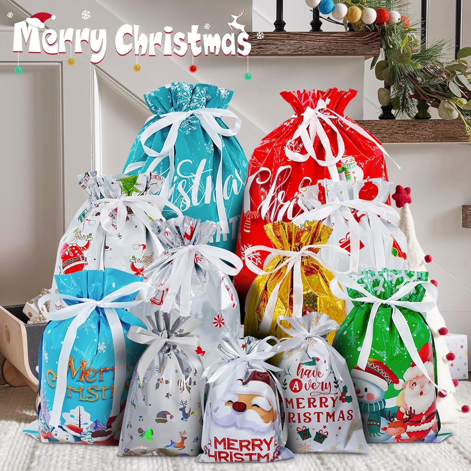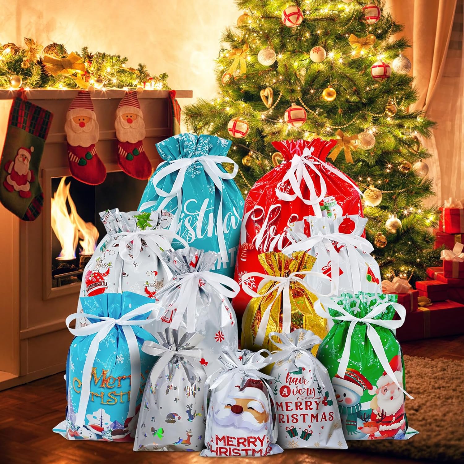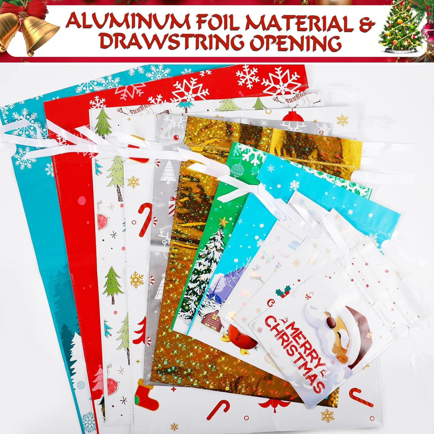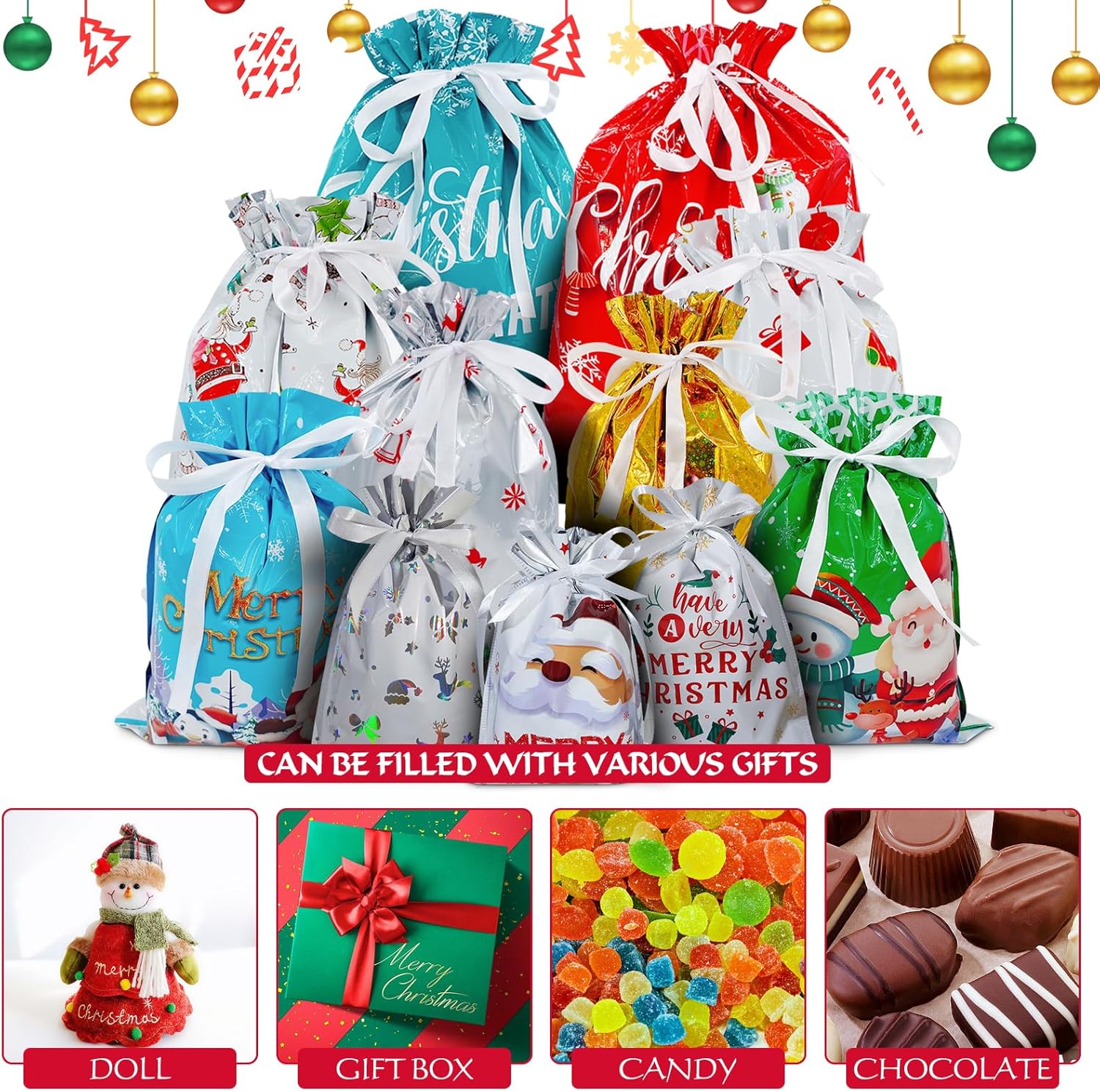 【Sacchetto regalo di Natale con coulisse】:- Ci sono 24 set di sacchetti regalo di Natale in totale. 2 sacchetti regalo extra grandi da 57 x 44 cm, 2 sacchetti regalo grandi da 51 x 39 cm, 4 sacchetti regalo medi da 43 x 29 cm, 4 sacchetti regalo piccoli da 32 x 24 cm, 12 sacchetti regalo mini da 24 x 16 cm. Sono disponibili 5 dimensioni di sacchetti regalo tra cui scegliere per soddisfare le diverse esigenze. 【Materiali di alta qualità】: i sacchetti di caramelle natalizie sono realizzati con un foglio di alluminio di alta qualità. Durevole, non facile da rompere e riutilizzabile. Il sacchetto regalo è opaco e i regali possono essere facilmente nascosti al suo interno, dando ai bambini un senso di mistero e sorpresa. 【Design unico】: 11 modelli di motivi natalizi pieni di atmosfera natalizia, adatti a persone di tutte le età e generi. Il design con coulisse semplifica l'imballaggio di vari regali, risparmiando tempo e comodità. 【Ampia gamma di applicazioni】: I sacchetti per imballaggio natalizi in foglio di alluminio sono adatti per decorazioni natalizie, confezioni regalo natalizie, aule scolastiche, regali per feste, alberi di Natale, regali natalizi, ecc. Crea un'atmosfera vacanziera speciale. 【Borsa regalo di Natale】 I sacchetti regalo con coulisse possono contenere caramelle, cioccolatini, biscotti, giocattoli, scatole regalo, bambole o altri oggetti. Le borse possono essere facilmente utilizzate per confezionare regali di grandi dimensioni o conservare piccoli oggetti. Regalatelo alla vostra famiglia, ai vostri amici e ai vostri compagni di classe, rimarranno sicuramente sorpresi.
