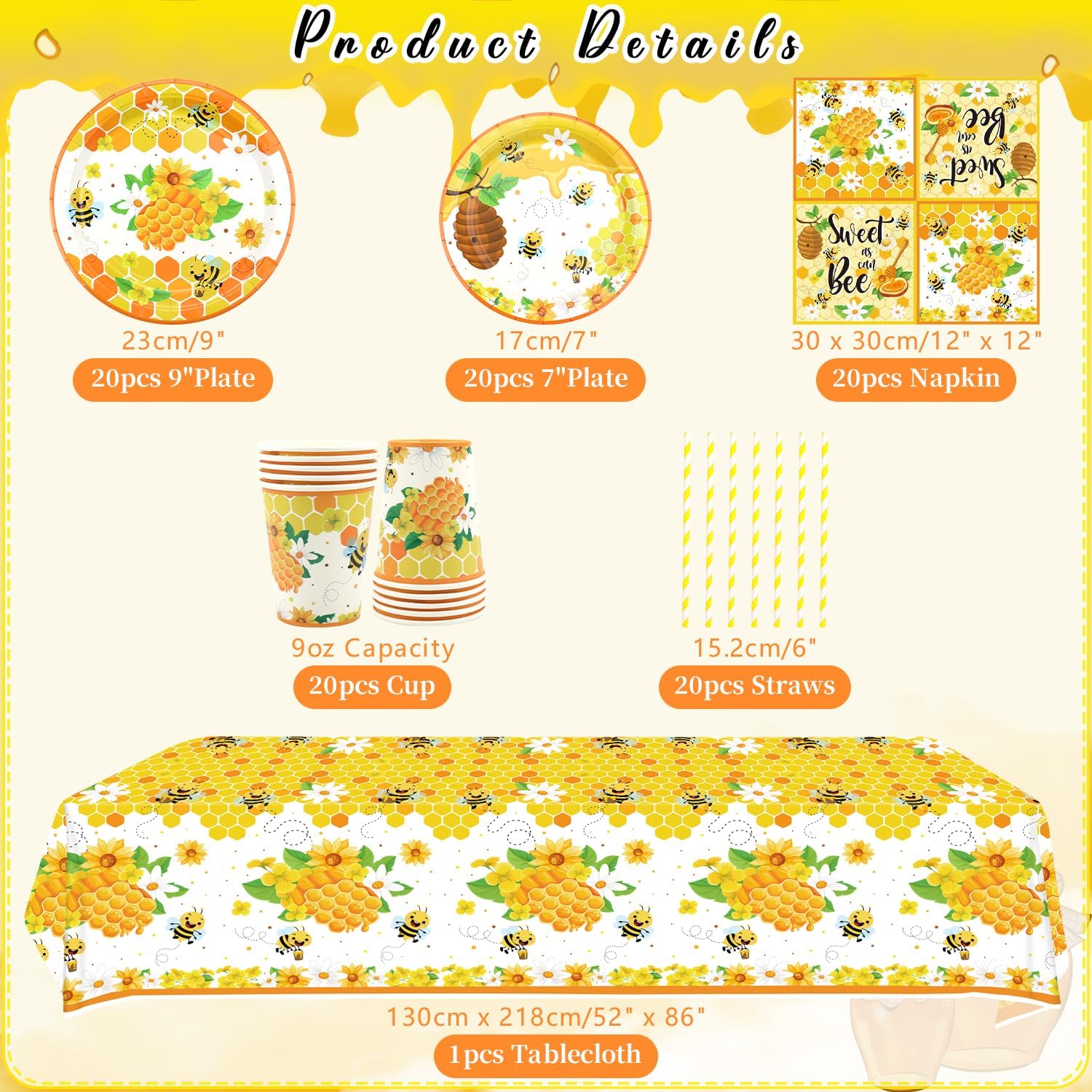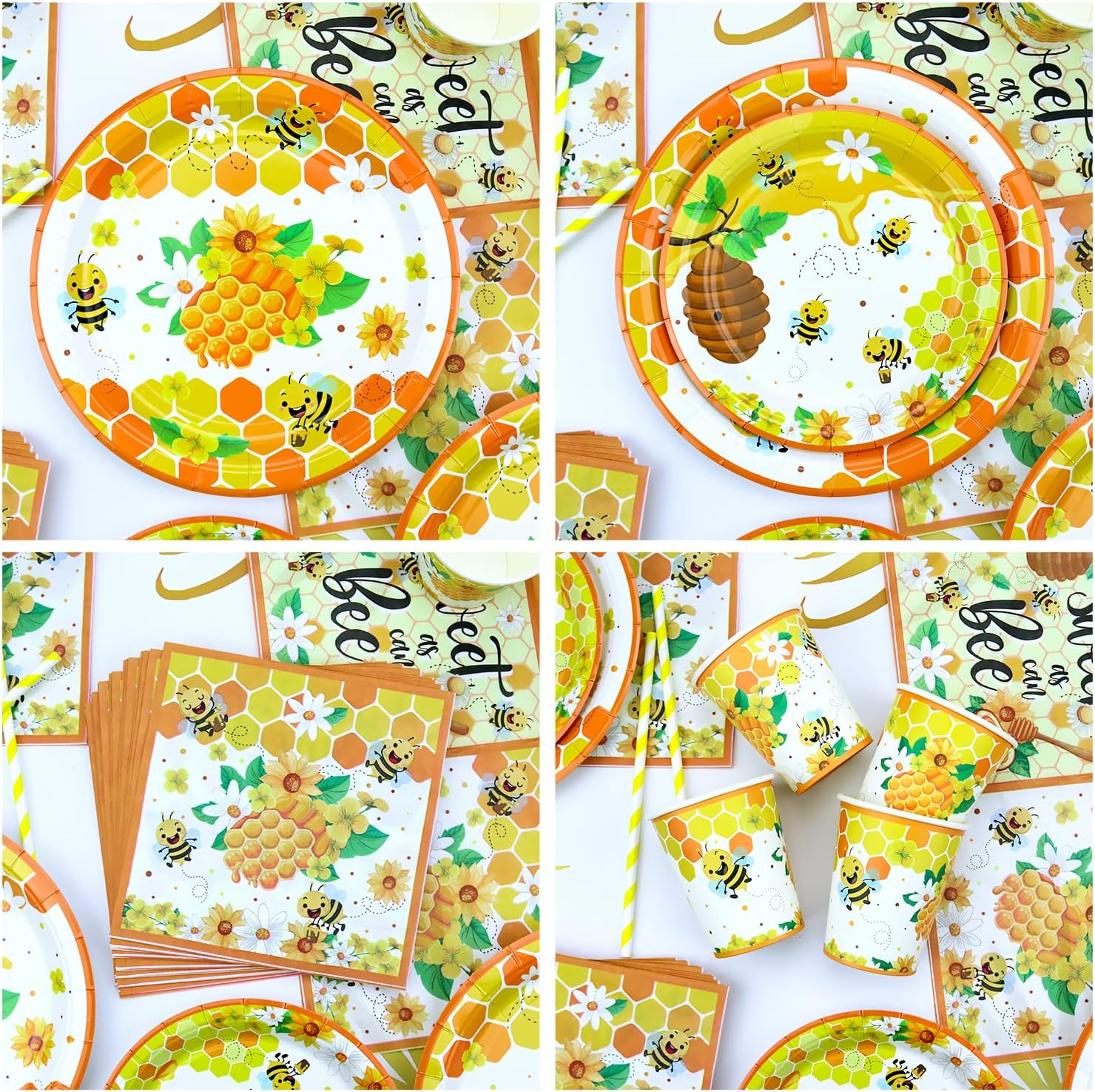 Set di stoviglie per festa delle api: riceverai 20 pezzi piatti da 9 pollici + 20 pezzi piatti da dessert da 7 pollici + 20 bicchieri di carta da 9 once + 20 tovaglioli + 20 pezzi cannucce + 1 tovaglia. Lavorazione di alta qualità: il set di stoviglie per feste con api è realizzato in cartone spesso, resistente a pieghe, strappi e rotture. (Nota: si prega di non mettere i piatti e le tazze nel forno a microonde.) Design unico: il design unico delle api con motivi chiari e colori vivaci renderà la tua festa qualcosa di speciale e crea una fantastica atmosfera da festa. Facile da pulire, consente di risparmiare tempo: con questo kit puoi facilmente organizzare un'impressionante festa di compleanno delle api per i tuoi ospiti. Dopo l'evento, puoi gettare tutti gli oggetti direttamente nella spazzatura e avere più tempo per goderti la festa e prenderti cura della tua famiglia, degli amici e degli ospiti. Adatto per: le decorazioni a tema ape sono adatte per feste di compleanno per bambini, feste a tema ape, primi compleanni, feste in parco, cene aziendali, picnic e altre occasioni.