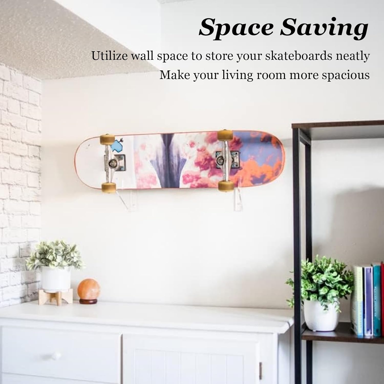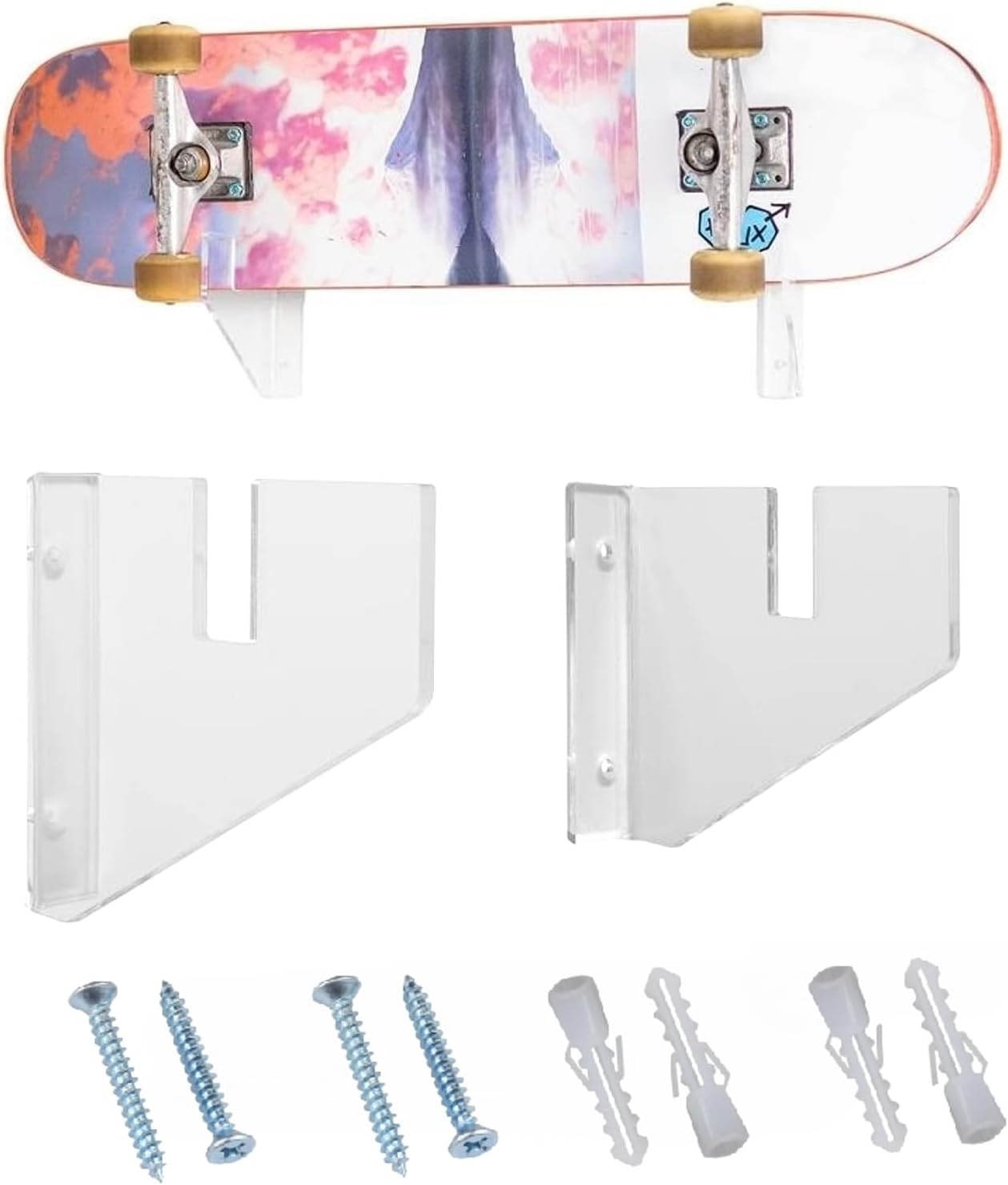 SUPPORTO FORTE: il supporto da parete per skateboard fornisce uno straordinario effetto fluttuante per la tua tavola da skateboard sul muro. Può tenere gli skateboard in modo sicuro, prevenire cadute accidentali, organizzare gli skateboard in modo ordinato e mantenere l'area di stoccaggio pulita e ordinata. MATERIALE PREMIUM: il supporto a parete per skateboard è realizzato in materiale acrilico durevole ad alta resistenza, durevole e antiruggine, garantendo che non si deformi o si danneggi dopo un uso a lungo termine. Secondo i nostri test interni, non ci sono problemi con la qualità del prodotto. STOCCAGGIO SALVASPAZIO: il supporto da parete per skateboard può essere installato in soggiorno, camera da letto, patio o garage, il che non solo decora la stanza ma consente anche di risparmiare spazio e liberare spazio prezioso sul pavimento. Se hai anziani e bambini in casa Uno skateboard a parete può impedire loro di inciampare sugli skateboard e dare tranquillità alla tua famiglia COMPATIBILITÀ VERSATILE: Progettato per adattarsi alla maggior parte dei tipi e dimensioni di skateboard, questo ripiano in acrilico è adatto a vari ponti tra cui longboard e tavole da crociera. I bracci di supporto flessibili abbracciano il manico di qualsiasi chitarra, sci o skateboard per una presa sicura. Mostra i tuoi skateboard sul muro INSTALLAZIONE FACILE: il nostro supporto da parete per skateboard ha 2 fori per le viti per una migliore stabilità. Le viti di montaggio e i tubi di prolunga sono inclusi nella consegna. Con il suo design umanizzato, puoi installare facilmente la mensola da skateboard sul muro con il minimo sforzo