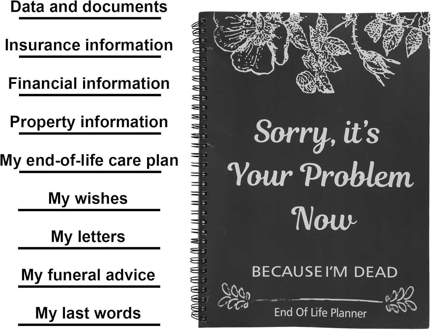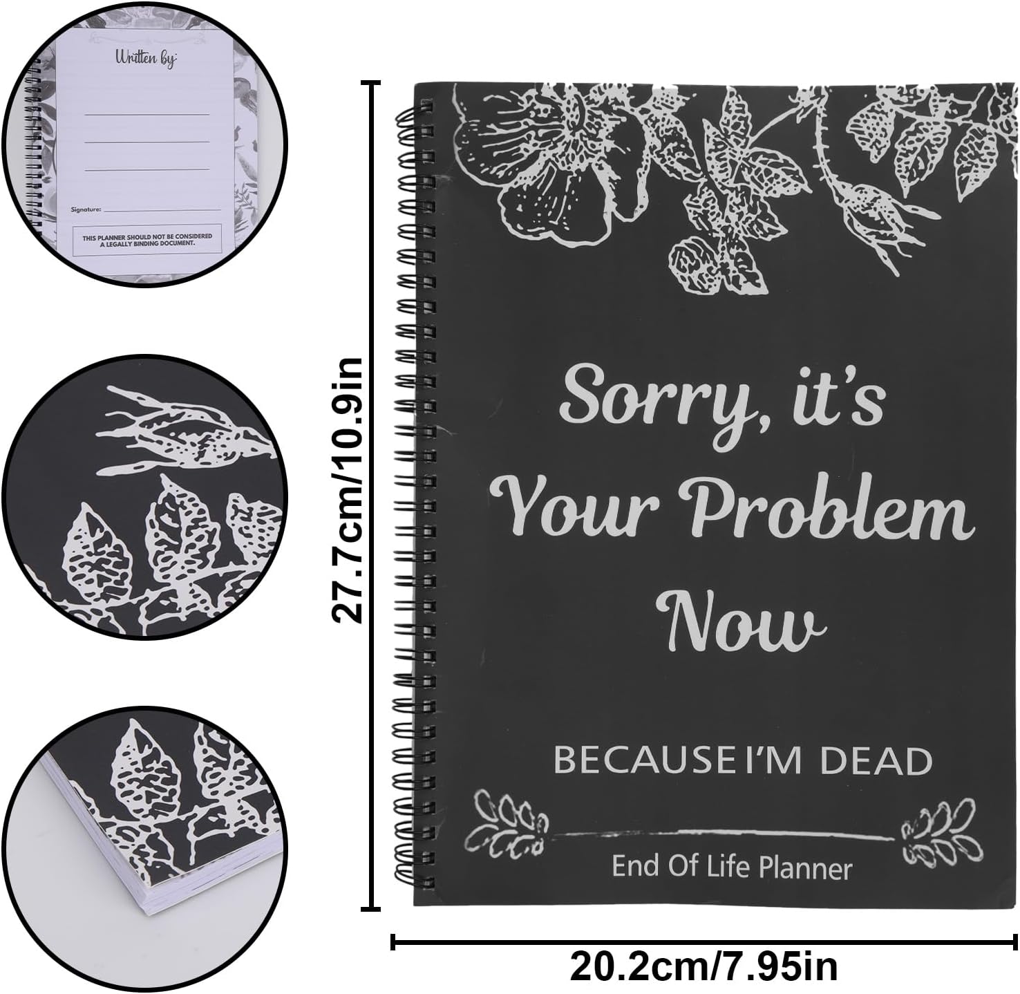 Divertente ma funzionale: "Mi dispiace, ora è un tuo problema perché sono morto" è un pianificatore di fine vita divertente ma pratico progettato per aiutarti a mettere in ordine i tuoi affari con una dose di umorismo. Rende un argomento difficile un po’ più facile da trattare. Organizzazione completa: questo taccuino organizer include sezioni per tutte le informazioni importanti, rendendo facile trovare tutto ciò di cui hanno bisogno, comprese informazioni sull'assicurazione, testamenti, informazioni finanziarie, informazioni sulla proprietà, desideri di morte, ultime parole, consigli funebri e altro ancora. Durevole: realizzato in carta, resistente ed elegante, non facilmente danneggiabile o sbiadito, può essere conservato a lungo. Compatto: con un elegante design tascabile, questo notebook in stile business si adatta facilmente al cassetto della scrivania o allo schedario. Ideale per uffici domestici, kit di pianificazione patrimoniale o come aggiunta leggera a conversazioni serie. Comunica chiaramente le ultime volontà: registra le tue preferenze in materia di cure di fine vita, i contatti decisionali, le note legali e tutti i messaggi personali. Assicurati che la tua voce sia ascoltata e che i tuoi desideri siano rispettati e seguiti.