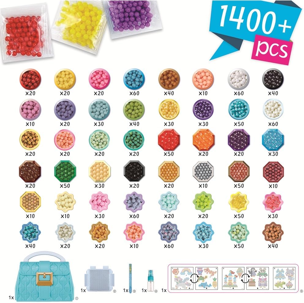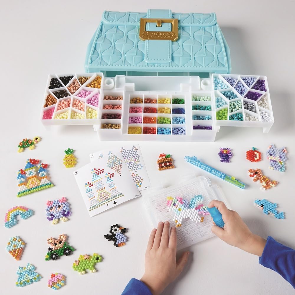 | Componenti inclusi | 1400 Beads in 48 colors ( 20x Classic, 5x Jewel, 8x Polygon, 15x Star), 1x Carry Case with Bead Palette, 1x Pop-Up tray, 1x Double-sided Aquabeads Pen, 1x sprayer, 3x template sheet, 1x instruction manual |
