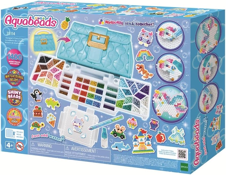 Questo set completo comprende 1400 perline in 48 colori, valigetta con tavolozza di perline, vassoio pop-up, penna Aquabeads bifacciale, spruzzino, foglio di riferimento e istruzioni. I modelli includono unicorno, mostro, gatto, dinosauro e altri motivi che possono essere realizzati inserendo nel vassoio le perline acquerello, stella, classiche e gioiello incluse. Include perline classiche, perline gioiello, perline poligonali, perline a stella in 48 colori, comprese le nuove perline acquerello. Create altri progetti di perline con le ricariche Aquabeads vendute separatamente. Aquabeads è adatto ai bambini dai 4 anni in su. Non adatto a bambini di età inferiore ai 3 anni a causa delle piccole parti.