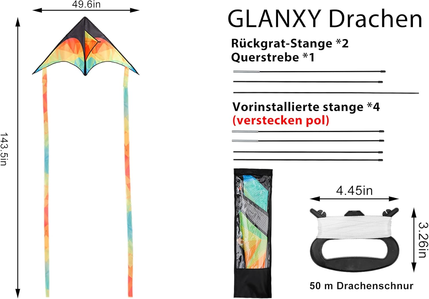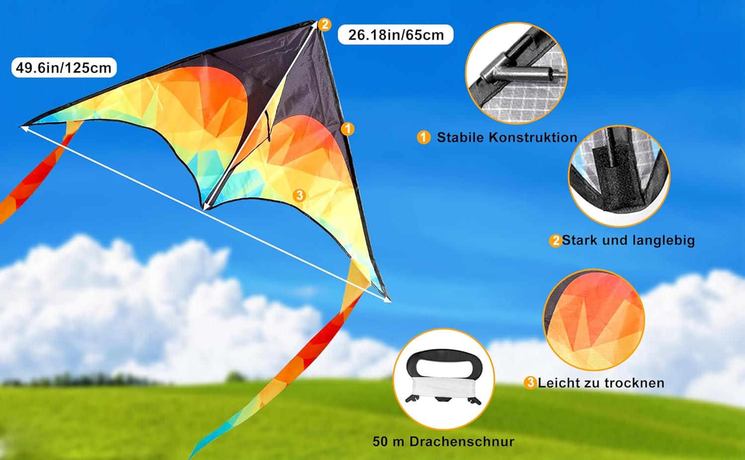 Facile da usare e divertente da far volare: questo colorato aquilone triangolare non colpisce solo per il suo design unico e la struttura stabile, ma anche per il suo telaio leggero che consente sia ai bambini che agli adulti di controllarlo senza sforzo. Garantisce un'esperienza di volo gioiosa, in modo che anche i principianti possano scoprire rapidamente il divertimento del deltaplano. Regalo ideale per i bambini - L'aquilone colorato è il compagno perfetto per i bambini durante le attività all'aperto. Non solo promuove le capacità di coordinazione dei bambini, ma rafforza anche il legame tra genitori e figli attraverso risate e gioia condivise. Sia in spiaggia che al parco, questo aquilone porta divertimento in ogni momento della famiglia. Materiali di alta qualità e design durevole - L'aquilone è realizzato in nylon antistrappo e un robusto telaio in fibra di vetro che garantisce leggerezza e durata. Vola stabilmente con velocità del vento da 6 km/h a venti forti di 28 km/h, adattandosi alle diverse condizioni del vento. (Per iniziare sono necessari almeno 2 Bft.) Conservazione pratica e design accurato - Grazie al suo design pieghevole, l'aquilone può essere riposto per risparmiare spazio. Le dimensioni compatte della confezione lo rendono facile da portare con te nello zaino o nella valigia. Le lunghe code elegantemente svolazzanti danzano nel vento e invitano i bambini a esplorare i segreti della natura. Contenuto della confezione: il drago triangolare ha una dimensione di 125 x 65 cm e viene fornito con 4 code colorate abbinate lunghe 105 cm. Il set comprende anche una linea per kite lunga 50 m e un manuale di istruzioni. Il design colorato assicura che l'aquilone sia chiaramente visibile anche ad alta quota. Il momento in cui l'aquilone decolla è indimenticabile per i bambini.