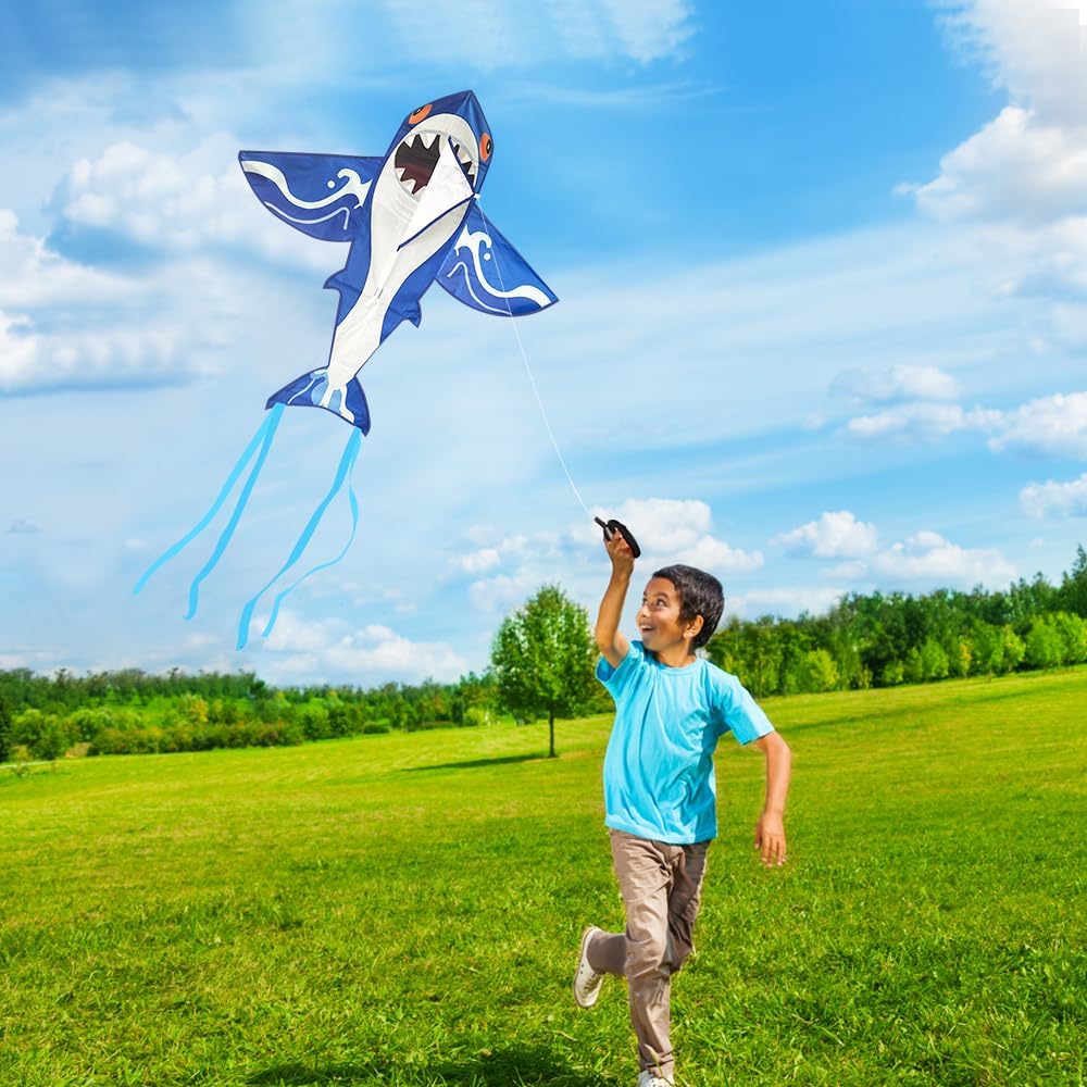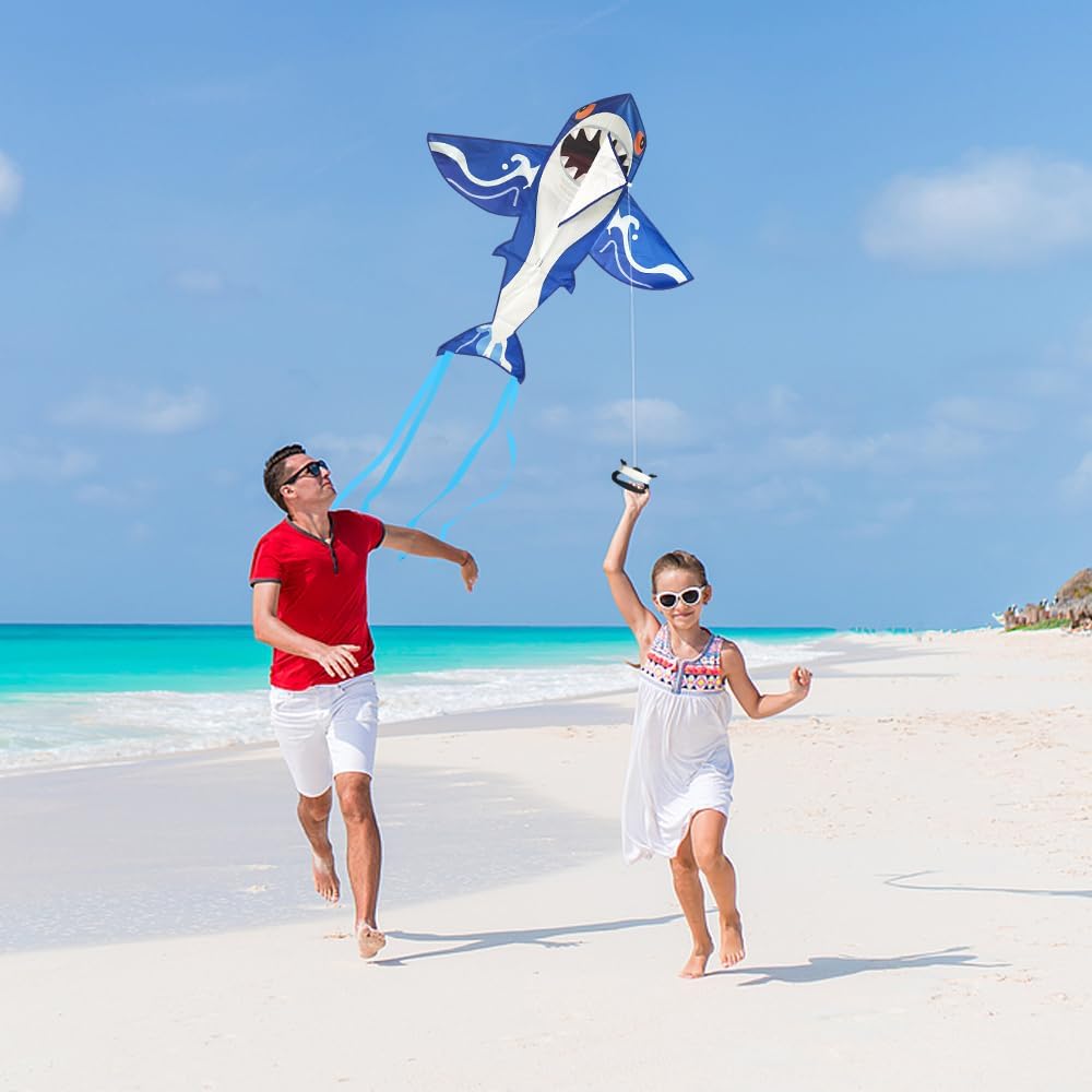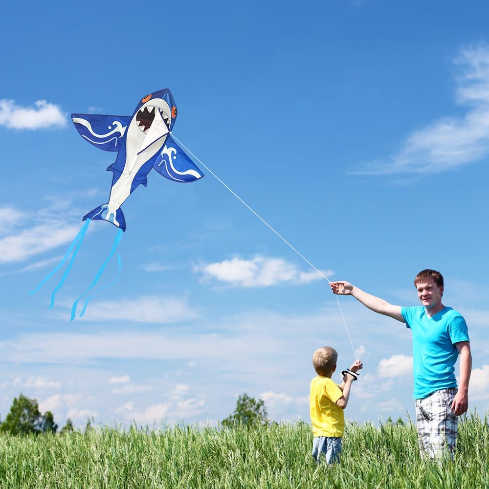 Drago Squalo: ha la forma vivace e interessante di un grande squalo con la bocca aperta e lunghe ali di squalo. Quando oscilla nel vento, sembra un vero squalo e offre divertimento e fantasia senza fine per le attività all'aperto dei bambini. Facile da configurare e far volare: l'aquilone è semplice e facile da configurare e molto facile da usare (i video di installazione possono essere trovati sulla home page del prodotto). Grazie al cavo lungo 50 m è possibile controllare facilmente l'altezza e la direzione dell'aquilone e il decollo e l'atterraggio sono un gioco da ragazzi. Facile da trasportare: l'aquilone dello squalo misura 80 x 82 cm, è leggero e compatto e può essere facilmente ripiegato e riposto in uno zaino o in una valigia. Ciò significa che può essere trasportato e riposto comodamente e occupando poco spazio. Materiali di alta qualità: l'aquilone per bambini è realizzato in tessuto di poliestere leggero e robusto ed è dotato di un'asta in fibra di vetro infrangibile che impedisce che l'aquilone venga danneggiato durante il volo. Rimane stabile anche in caso di vento forte, così i bambini possono divertirsi molto facendo volare l'aquilone. Versatile: gli aquiloni Shark sono adatti per volare su prati, spiagge, parchi e altre aree aperte. Sono ideali anche per laboratori negli asili e nelle scuole, creano un'atmosfera allegra in varie occasioni e offrono molto divertimento quando si fa volare l'aquilone all'aperto con la famiglia e gli amici