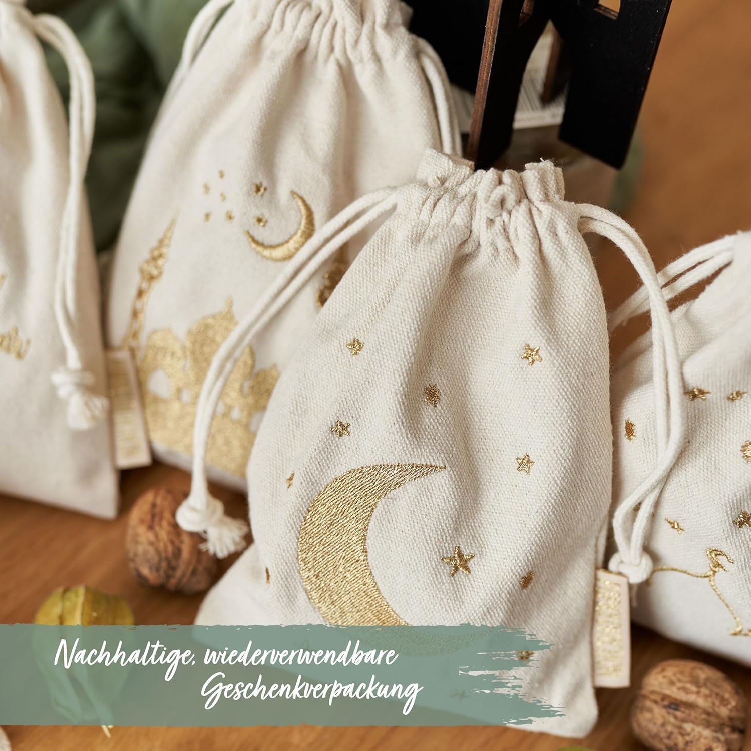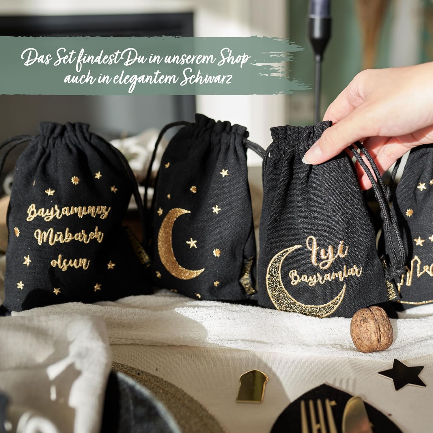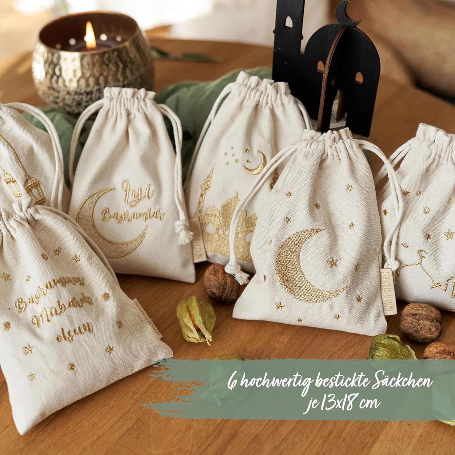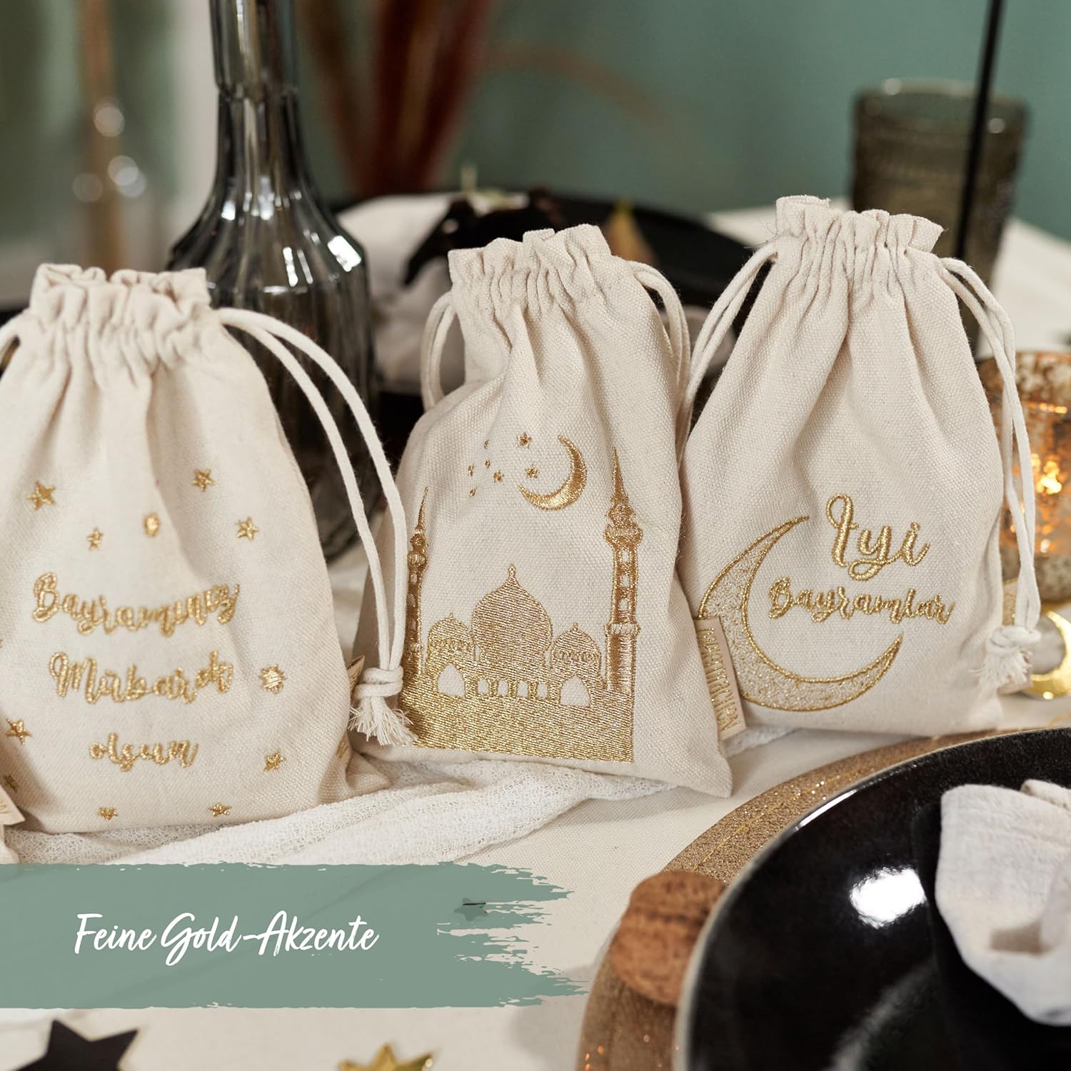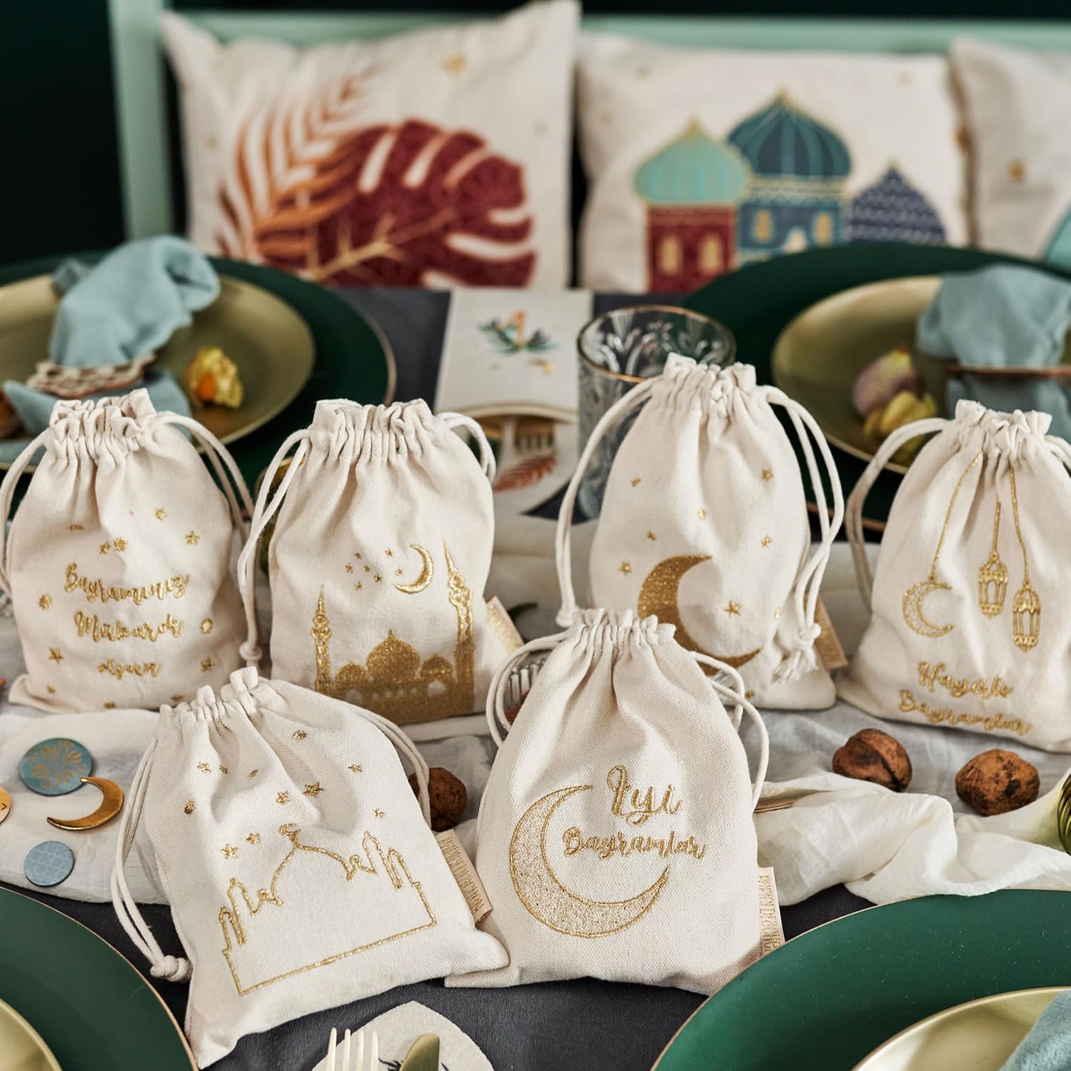 Design autentico: ogni borsa è decorata con la tradizionale scrittura turca, evidenziando la ricchezza culturale e il significato del Ramadan e del Festival dello zucchero. Materiale naturale: realizzate con materiali naturali ed ecologici, queste borse offrono un'alternativa rispettosa dell'ambiente agli imballaggi in plastica. Dimensioni perfette: con una dimensione ideale di 13x18 cm per piccoli regali e dolcetti, queste borse sono perfette per diffondere gioia e festività. Riutilizzabili: La solida lavorazione garantisce un utilizzo duraturo e la possibilità di riutilizzare le borse per feste future. ALTRE DECORAZIONI PER LA FESTA DELLO ZUCCHERO: Da noi troverai anche fantastici sacchetti regalo, calendari Ramadan, portatovaglioli, sacchetti porta soldi, federe, portaposate, quaderni con disegni orientali, sacchetti regalo e decorazioni legate al Ramadan