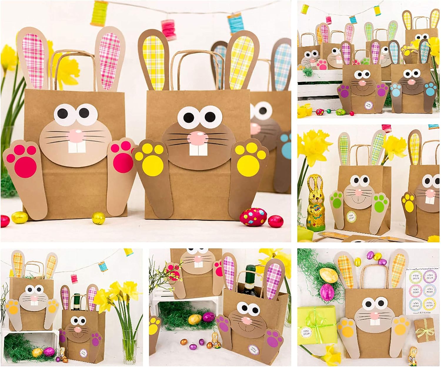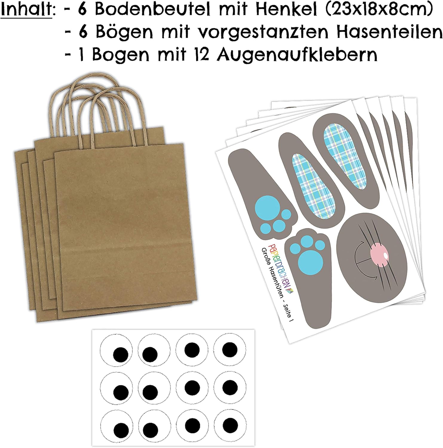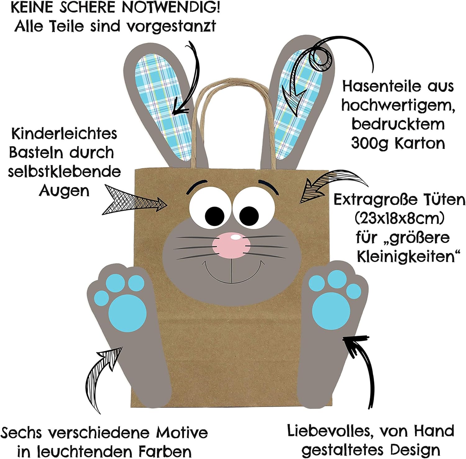 EXTRA LARGE: sacchetti regalo XXL fai da te per Pasqua con coniglietti pasquali colorati da riempire (dimensioni 18 cm x 22,5 cm x 8 cm) - per confezionare regali per bambini e adulti PACCHETTO COMPLETO: riceverai 6 sacchetti di carta extra grandi per piccoli oggetti più grandi - in carta kraft marrone, più 12 adesivi per gli occhi e 6 pagine DIN A4 pretagliate con graziosi coniglietti pasquali colorati - (cartone artigianale da 300 g) per una facile rimozione NON sono necessarie FORBICI grazie alle parti pretagliate in cartone artigianale: hai solo bisogno di una colla stick, così avrai in un batter d'occhio una fantastica decorazione pasquale. OTTIMA IDEA REGALO: Grazie alla pratica maniglia, le borse sono anche facili da trasportare - ideali per ospiti o gruppi di scuole materne, classi di scuola primaria e club MADE IN GERMANY: questo articolo è prodotto in Germania con l'aiuto di un laboratorio per persone con disabilità. I materiali selezionati e di alta qualità garantiscono ancora più divertimento durante il fai da te