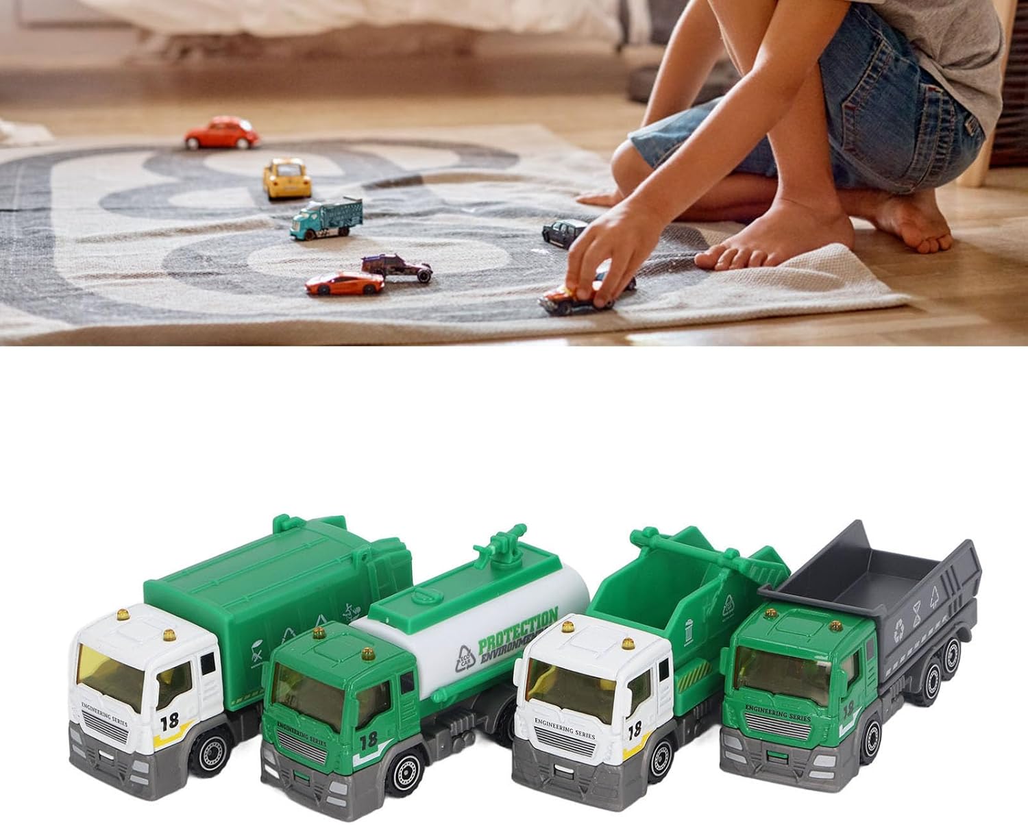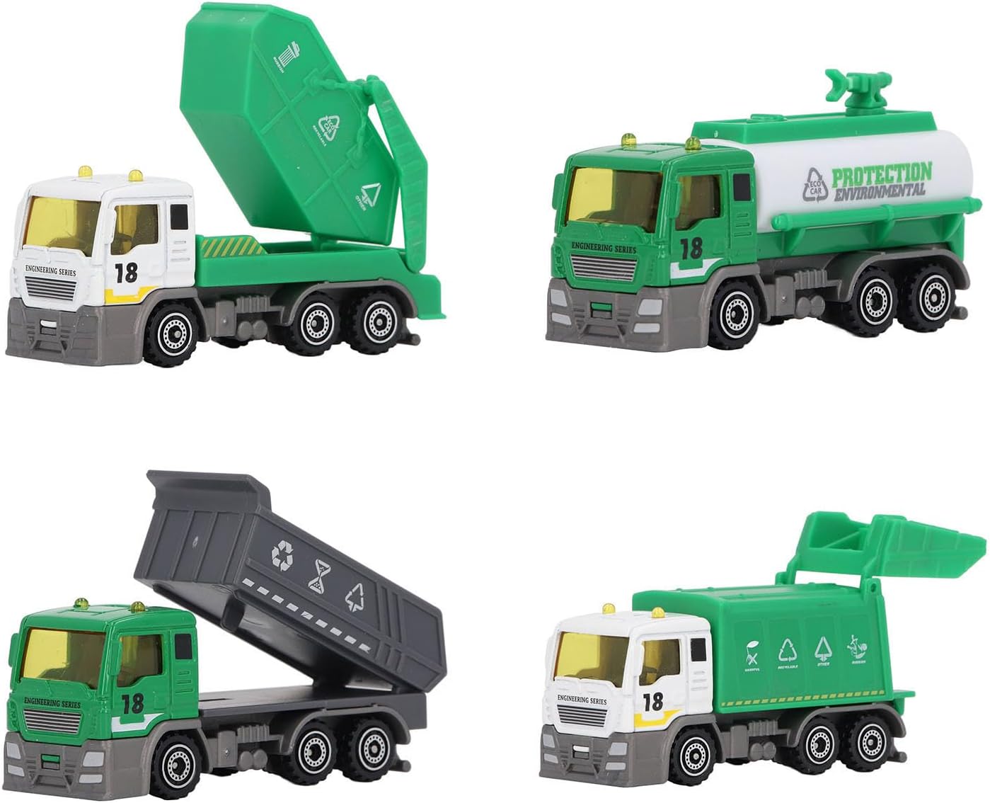 [SIMULAZIONE IN SCALA 1:32] Goditi un'esperienza realistica con questo giocattolo del camion della spazzatura che replica perfettamente le caratteristiche di un veicolo igienico-sanitario. [SET DI 4 MODELLI UNICI] Fornisci intrattenimento senza fine con quattro diversi veicoli igienico-sanitari, adatti a vari scenari di gioco e incoraggiando la creatività. [GIOCO EDUCATIVO] Promuovi le abilità e il pensiero logico nei bambini con questo giocattolo che simula operazioni e scenari reali. [ROBUSTO E AFFIDABILE] La resistente struttura in plastica e lega del modello di camion della spazzatura garantisce gioco e divertimento duraturi per i bambini. [SICURO ED ECOLOGICO] Sentiti a tuo agio con questo giocattolo del camion della spazzatura realizzato con materiali ecologici, garantendo un ambiente di gioco sicuro per i bambini.
