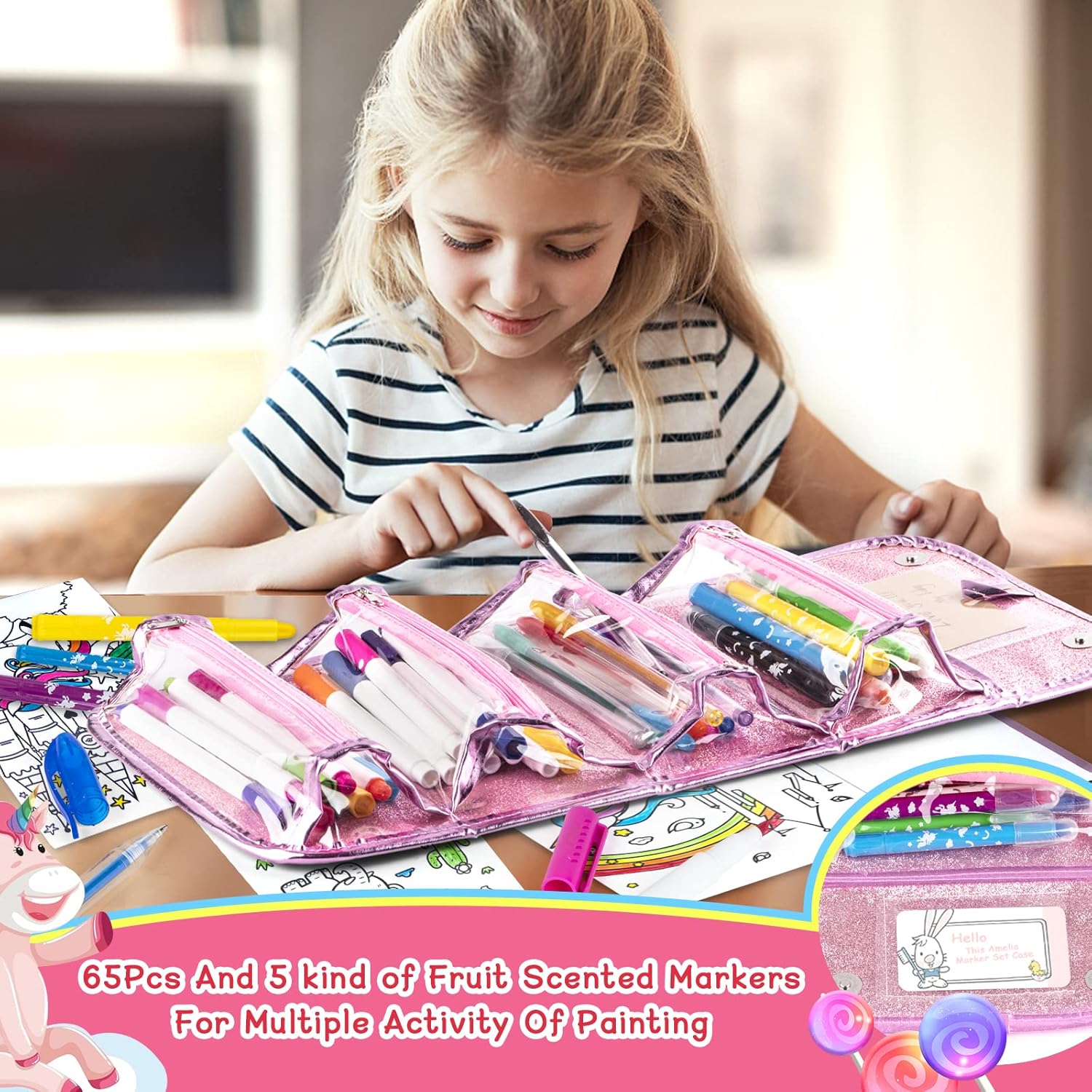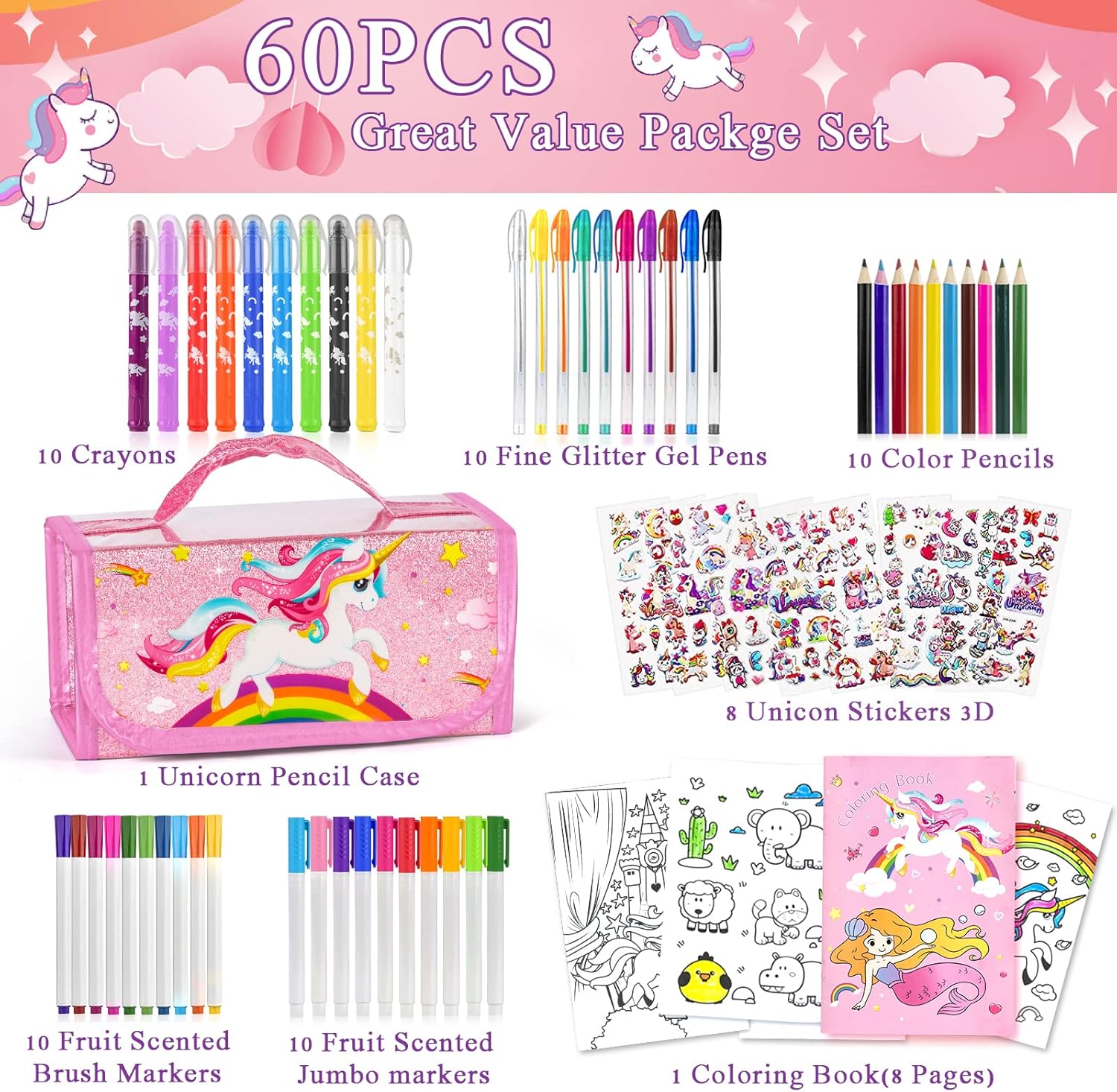 ღ【REGALI UNICORNO PER RAGAZZE】È un giocattolo STEM ideale per le bambine di 3 4 5 6 7 8 anni e anche una grande idea per i regali di unicorno, i regali di compleanno, i regali per la festa dei bambini, i giocattoli di Pasqua e le forniture di cancelleria per il ritorno. specialmente per i bambini che amano scarabocchiare o che vogliono ispirarsi e godere della gioia della pittura.Mescolateli e abbinateli quando scrivete, disegnate, colorate o scarabocchiate per creare effetti diversi. ღ【SET DA 60 PACCHETTI DI GRANDE VALORE】Il grande set di pennarelli Unicorno include 1 astuccio per matite Unicorno, 10 penne gel finemente glitterate, 10 pennarelli a pennello al profumo di frutta, 10 pennarelli Jumbo al profumo di frutta, 10 pastelli, 10 matite colorate, 8 adesivi Unicorno, 1 libro da colorare (8 pagine). Assortimento di materiale artistico per bambine di età compresa tra 3 e 10 anni. ღ【NON TOSSICO E DI ALTA QUALITÀ】Kit artistici sicuri da utilizzare per qualsiasi livello di artista, kit artistici per bambini adatti, set artistici e kit di forniture artistiche. La sicurezza è la nostra prima preoccupazione, tutte le matite e i pennarelli sono realizzati con materiali atossici. Potete essere certi che le bambine si divertano a dipingere con questo set artistico di unicorni di buona qualità. ღ【DESIGN ERGONOMICO】L'astuccio per unicorno, compatto, ordinato e portatile, contiene quattro scomparti con cerniera, che consentono alla bambina di organizzare le penne e di trasportarle rapidamente. Le penne ad inchiostro gel acquerellabili per bambini sono sicure e adatte per disegnare, dipingere, annotare, scarabocchiare, ecc. Per mantenere il vostro piccolo appassionato d'arte felice e impegnato. ღ【TEMA UNICORNO ROSA DIVERTENTE E DA SOGNO】Astuccio perfetto per colorare e disegnare. Tutti i simpatici per matite sono organizzati in un astuccio per matite unicorno premium, Le vostre bambine saranno felicissime quando riceveranno questo kit di materiale artistico con unicorno. Abbiamo scelto il rosa come tema principale di questo set di matite, perché il rosa rappresenta l'immaginazione carina e romantica. Ispira la creatività della tua bambina con questo simpatico set di penne!