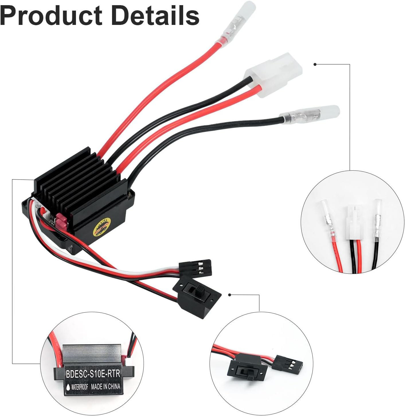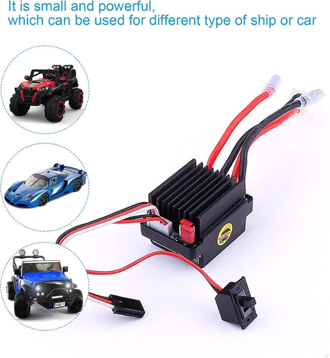 Corrente 320 A: fornisce corrente 320 A quando collegato al motore, può fornire una corrente motore continua fino a 320 A (avanti) o 160 A (indietro). Funzione di regolazione fine: regola automaticamente la posizione centrale del pedale dell'acceleratore per migliorare la guida dell'auto o della barca con telecomando. Dimensioni perfette: la dimensione del controller bidirezionale spazzolato impermeabile è 43 mm x 29 mm x 27 mm, compatto e raffinato, piccolo e potente. Applicazioni: questo controller per motore con spazzole da 320 A può essere utilizzato per il controllo remoto di auto/barche, che possono controllare bene i motori e proteggere il tipo di utilizzo a lungo termine delle auto telecomandate. Promemoria: questo controller di velocità del motore della spazzola ha 3S (12V), non più di 380 motori, 2S (8,4V) e non più di 540 motori.