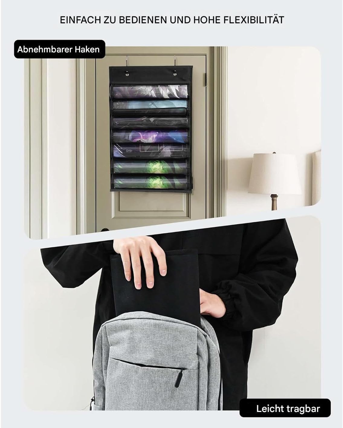 Spazio sufficiente: dotato di un sistema di separazione multistrato, assicura che i tappetini siano conservati in modo sicuro, protetti dalla polvere e tenuti puliti per fornire tutte le tue esigenze di gioco per uno spazio considerevole Design user-friendly: con un design a slot trasparente, questo supporto garantisce il riconoscimento rapido dei tappetini da gioco e allo stesso tempo supporta diverse dimensioni MAT per ottimizzare in modo efficiente il processo di configurazione Installazione senza sforzo: il supporto per tappetini da gioco a sospensione veloce si installa facilmente su porte, pareti o armadi, senza bisogno di strumenti complessi per garantire un'esperienza facile per tutti gli utenti Uso efficace dello spazio Questa borsa per tappetini da gioco creata fino all'ultimo: realizzata con materiali compositi e rinforzi stabili e offre una memoria affidabile senza deformazioni