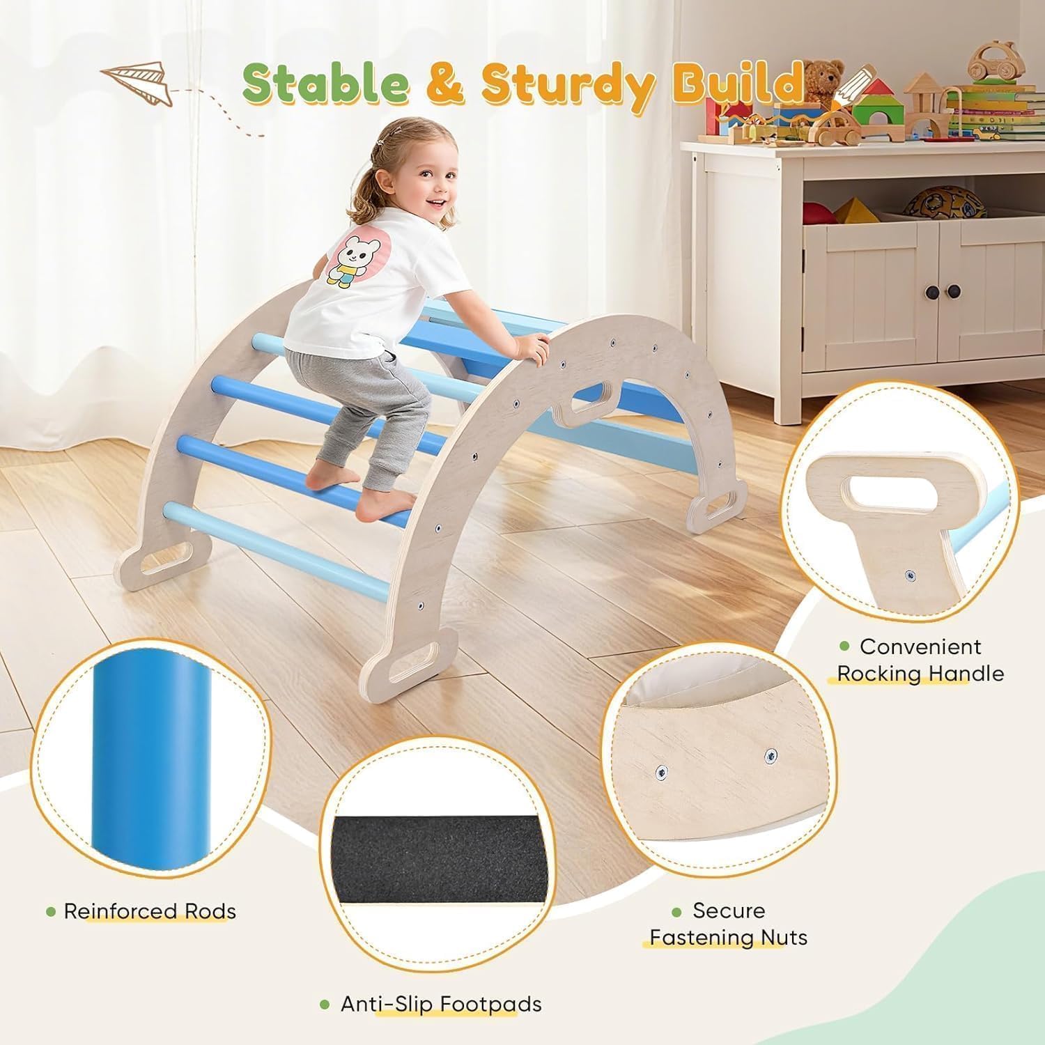 1. Set di archi da arrampicata 2 in 1: questo versatile telaio da arrampicata per bambini con gradini colorati e tappetino morbido può essere convertito in una scala da arrampicata, sedia a dondolo, cestino per giocattoli o tunnel per gattonare, offrendo ai bambini infinite possibilità di gioco incoraggiando la loro creatività. 2. Design sicuro e stabile: con connessioni forti, barre più larghe e viti nascoste, questo arco da arrampicata garantisce una stabilità affidabile. Manici facili da impugnare e imbottitura antiscivolo mantengono i più piccoli al sicuro in ogni avventura. 3. Legno naturale di alta qualità: la struttura da arrampicata per bambini è realizzata in legno massello di alta qualità e presenta una superficie liscia e lucida, bordi arrotondati e una classica venatura del legno per una maggiore durata e una sensazione adatta ai bambini. 4. Comoda altalena con cuscino: con un cuscino spesso imbottito con morbido cotone e cinghie facili da fissare per una vestibilità sicura, offre un posto comodo per leggere, rilassarsi o dondolare delicatamente. 5. Facile da montare e versatile: con strumenti di montaggio, istruzioni dettagliate (lingua italiana non garantita) e guanti protettivi per un montaggio rapido. Questo set di telaio da arrampicata è perfetto per la casa, l'asilo nido, il parco giochi o il giardino.