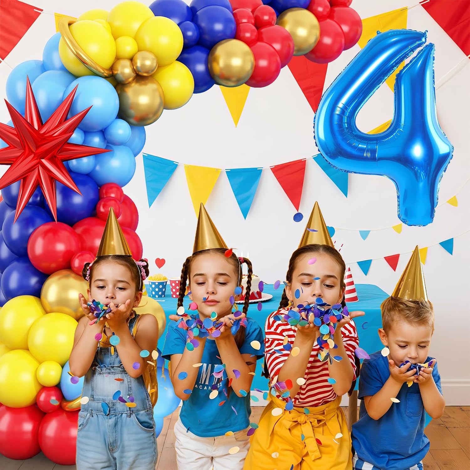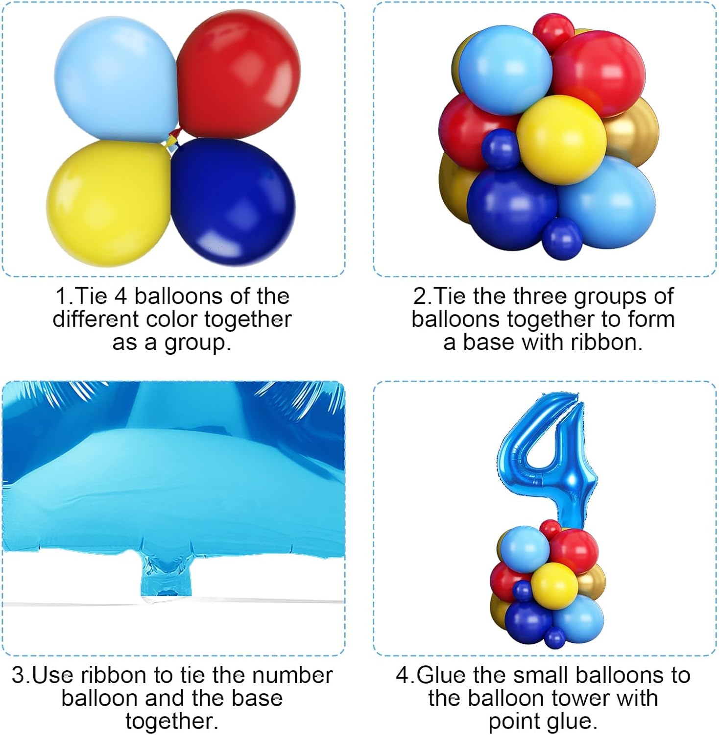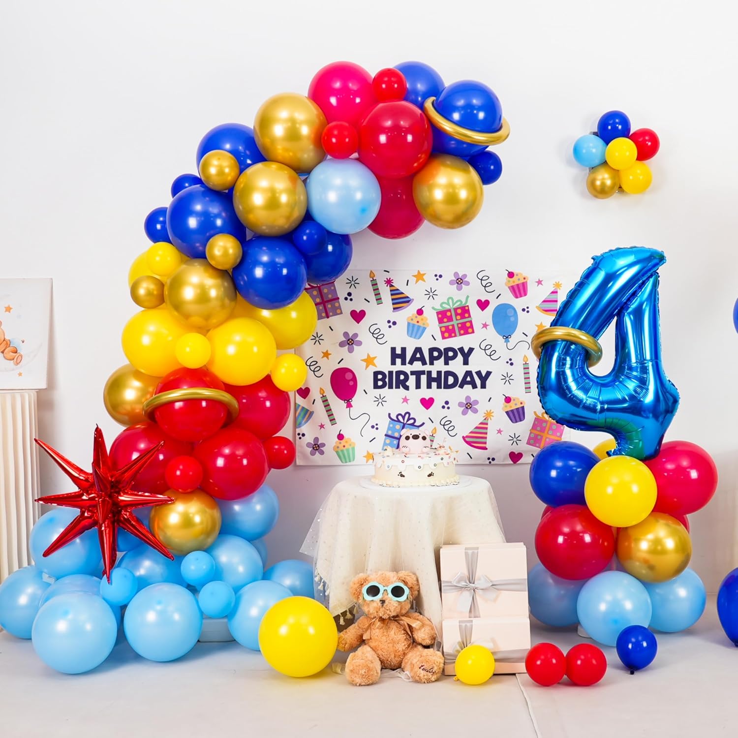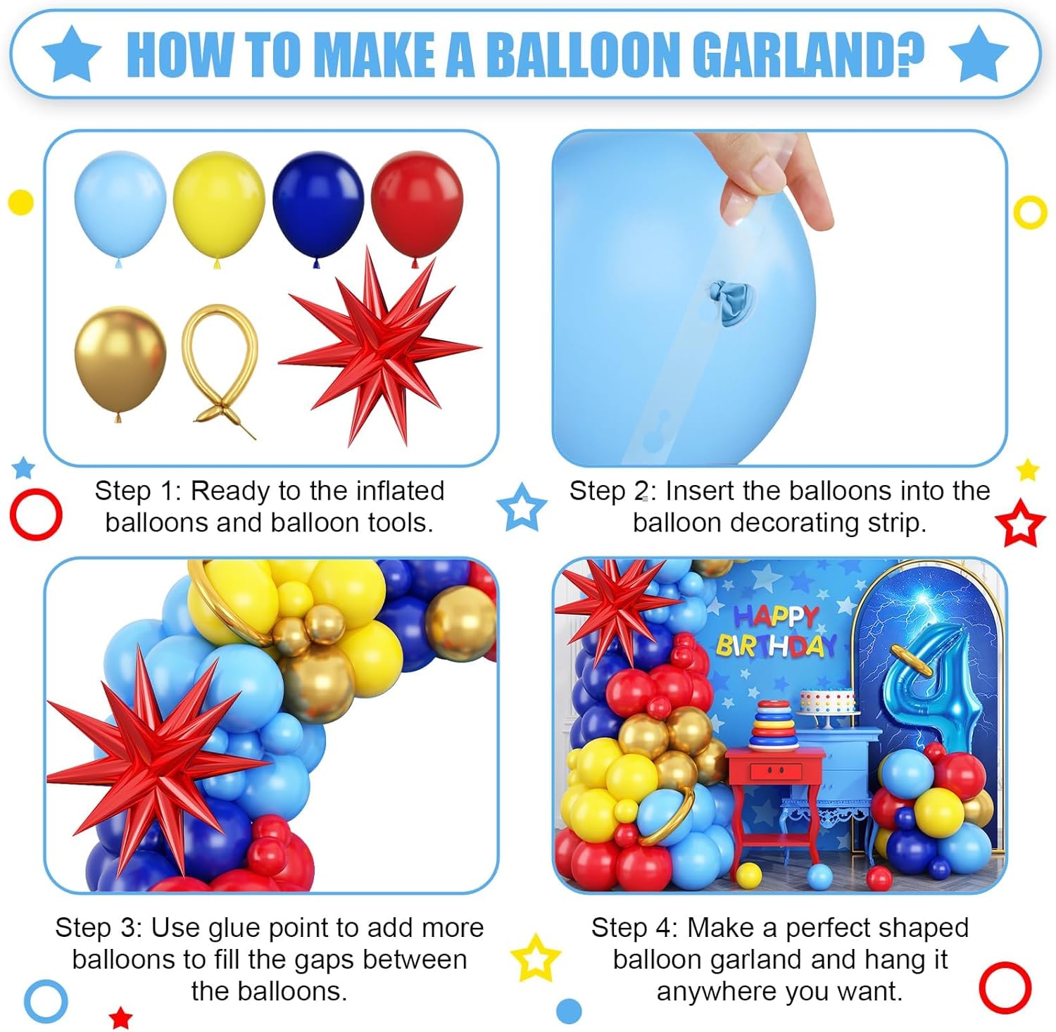 Kit arco di palloncini per il 4° compleanno a tema Circo Carnevale: 1 palloncino blu numero 4 da 32", 1 palloncino con esplosione di stella, palloncini gialli (10" x 15", palloncini 5 x 5"), 5 palloncini blu (10 x 15", 5") 15", 5" x 5), palloncini oro metallizzato (10" x 8", 5" x 5), 3 strisce di palloncini oro metallizzato, 1 striscia di palloncini bianchi, 60 x Punti adesivi per palloncini, 1 x Nastro. La combinazione di colori soddisfa tutta la tua immaginazione per la festa. Materiale premium: i palloncini rossi, blu e gialli sono ben selezionati, senza odore forte, sicuri per bambini e adulti. Si prega di evitare scottature, surriscaldamento, oggetti troppo gonfiati, oggetti appuntiti e attrito eccessivo bella aggiunta alla decorazione della tua festa. Gonfia semplicemente i palloncini, allaccia i nodi e inseriscili nei fori della catena dell'arco di palloncini. Puoi appendere l'arca su alberi, pareti, finestre, porte, tavoli da pranzo o ovunque tu voglia. Goditi un divertente progetto fai-da-te in famiglia mentre armeggia con i tuoi cari. Il kit ghirlanda di palloncini blu e gialli è ideale per feste a tema, baby shower, decorazioni di compleanno, anniversari, feste di carnevale, feste di laurea, feste per rivelare il genere, festa dei bambini, Capodanno. Attenzione: se hai qualche problema con le decorazioni della festa del 4° compleanno, non esitare a contattarci. Ci impegniamo a fornire una soluzione che soddisfi le tue esigenze e renda piacevole la tua esperienza.