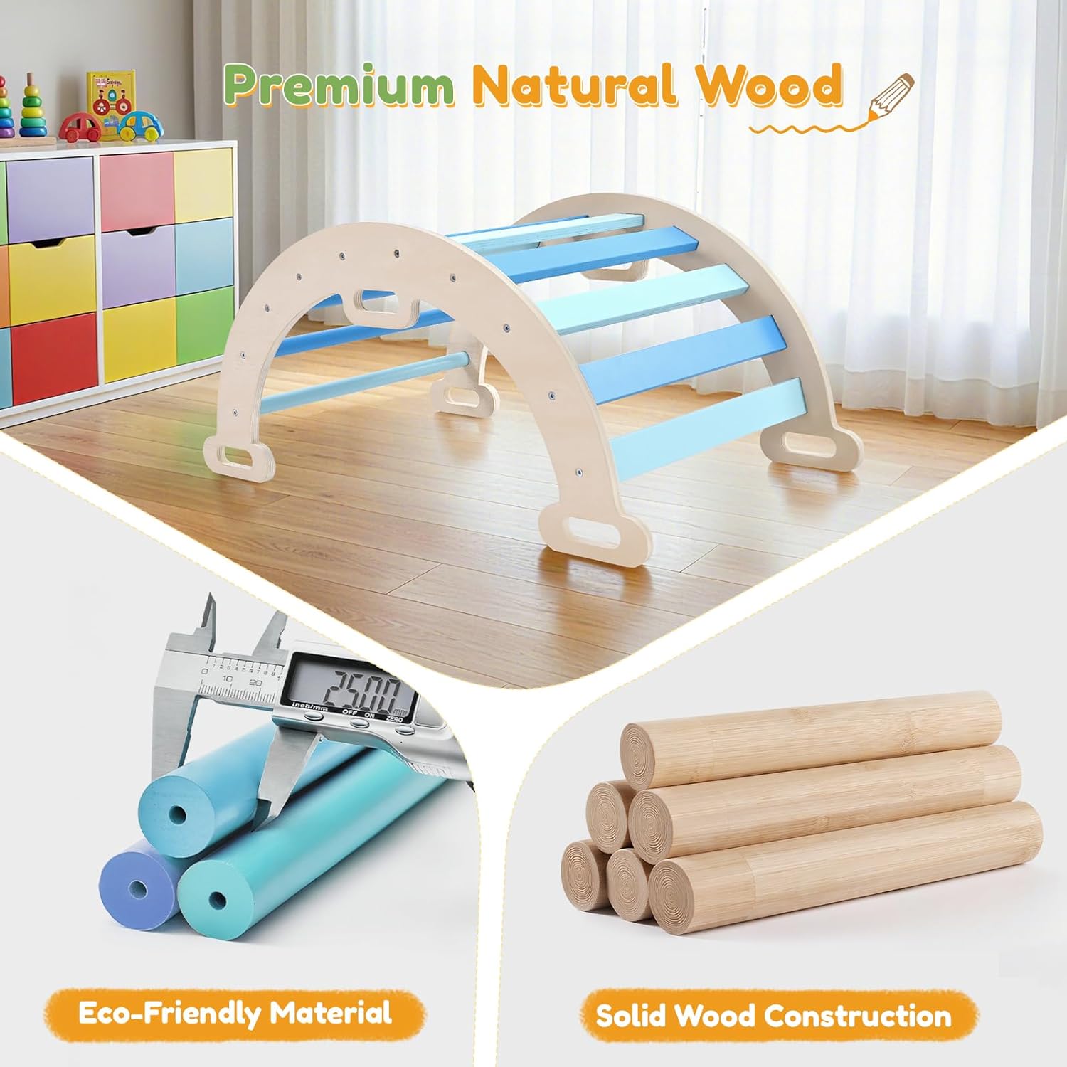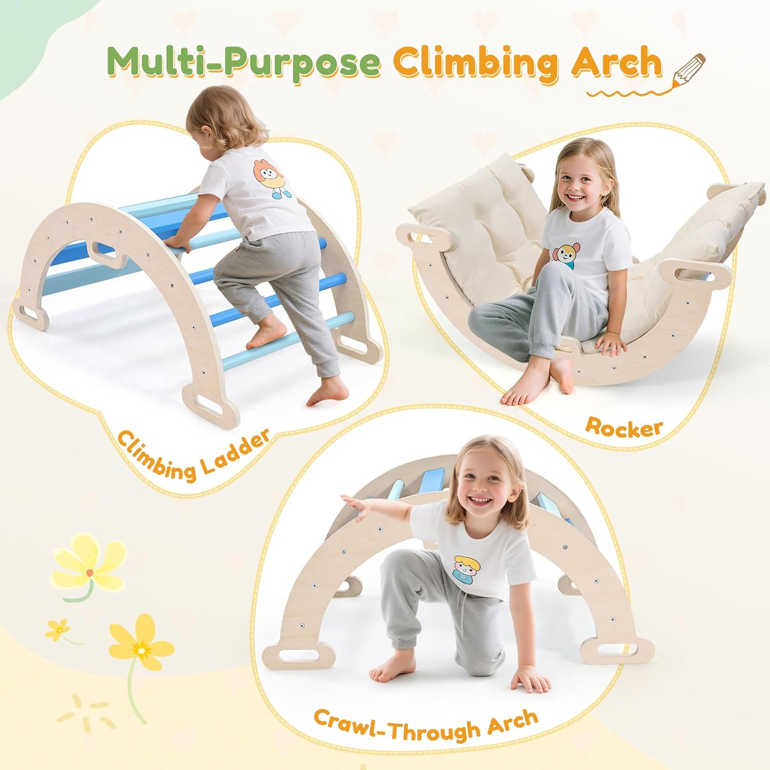 【Materiale 100% naturale e lavorazione artigianale di pregio】 Rispetto al legno giuntato, i nostri due lati sono realizzati in legno massello, che offre maggiore stabilità e durata e non si allenta o si deforma facilmente. Questo set da gioco per arrampicata ad arco 2 in 1 è realizzato in legno naturale al 100% e le nostre aste rotonde sono realizzate in legno di faggio, abbastanza resistente da resistere alla prova del tempo. 【Diventa un piccolo avventuriero!】 Progettato con una struttura ad arco, il nostro set di giochi da arrampicata Montessori offre un'eccellente stabilità e sicurezza, ideale per i bambini che desiderano sviluppare le proprie capacità motorie in modo naturale ed esplorare i propri limiti di apprendimento. Carico massimo 50 kg. Inoltre, la struttura da arrampicata è dotata di un tappetino aggiuntivo, utilizzabile con la scaletta. 【Cuscino comodo e dettagli ben fatti】 Quando viene utilizzato come dondolo in legno, è più comodo con i cuscini. Il cuscino è realizzato in tela di cotone e imbottito con uno spesso e morbido cotone PP per offrire un'esperienza d'uso confortevole quando ci si sdraia. Il design circolare della maniglia con superficie liscia, angoli arrotondati e viti nascoste protegge i bambini dai graffi durante il gioco. 【Regalo di gioco perfetto per lo sviluppo dei più piccoli】 Inoltre, l'arco non è solo uno strumento da arrampicata, ma anche un dondolo, ed è incluso un comodo cuscino per sedersi o sdraiarsi comodamente. Così i bambini possono scegliere quale usare a piacimento. Lascia che i bambini sviluppino le loro capacità motorie in modo naturale ed esplorino i propri limiti di apprendimento in modo sicuro. È il regalo perfetto per compleanni, Natale e ogni tipo di festa. 【Facile montaggio e manutenzione】 Con istruzioni dettagliate e l'hardware necessario, questa scala da arrampicata per bambini è facile e veloce da montare. La superficie impermeabile facilita la pulizia della struttura e può essere utilizzata all'interno o all'esterno in base alle proprie esigenze. È un fantastico giocattolo per lo sviluppo dei più piccoli, adatto a casa, all'asilo nido, al parco divertimenti per bambini, alla scuola materna e così via.