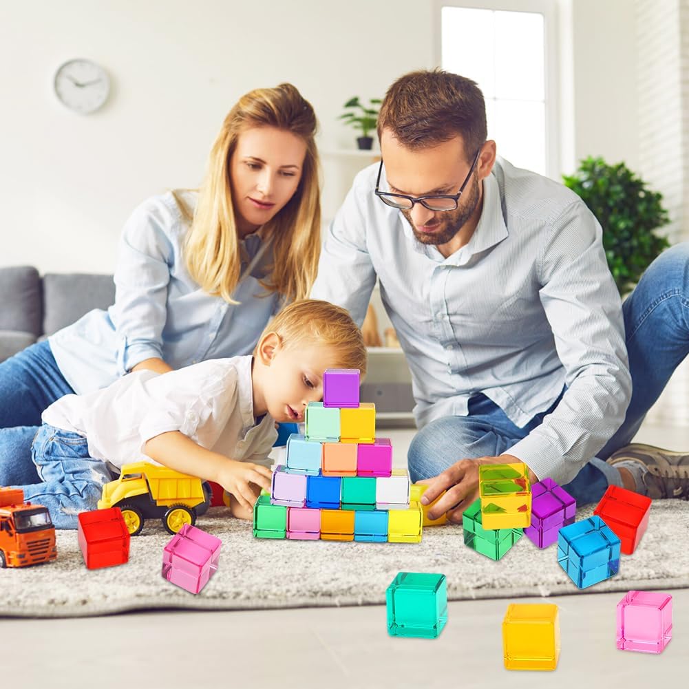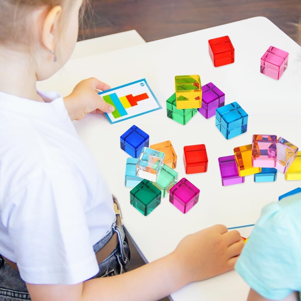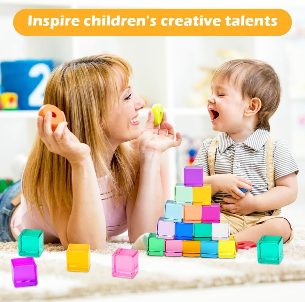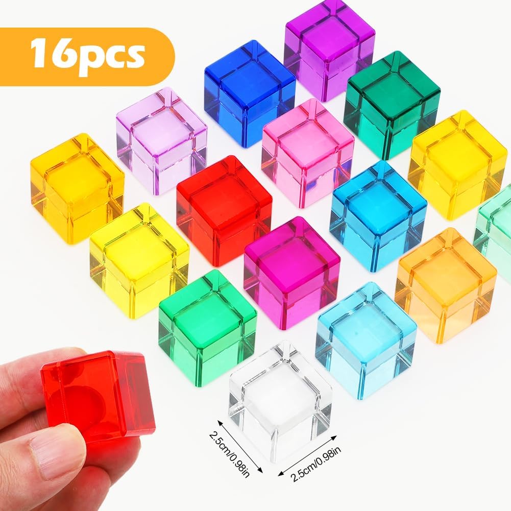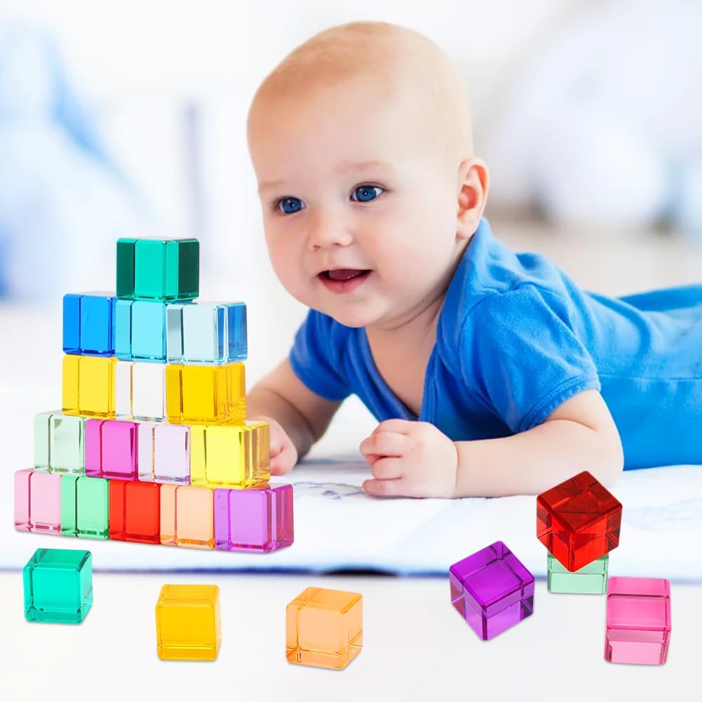 Sicurezza e durata: il set di mattoncini arcobaleno è realizzato in materiale acrilico di alta qualità ed è assolutamente sicuro per la pelle sensibile dei bambini. Il materiale robusto garantisce una lunga durata e la rende la scelta perfetta per i giocattoli educativi sensoriali. Sviluppo cognitivo: forme geometriche di base (16 pezzi in totale) supportano giochi di impilamento, costruzione e classificazione dei colori. Sotto la luce naturale o artificiale, riflettono effetti di luce magici. Le molteplici combinazioni di colori favoriscono la percezione di colori, forme e luce nei bambini. Promuove la coordinazione occhio-mano e il pensiero spaziale. Giocattolo sensoriale: i cubi acrilici color arcobaleno attirano l'attenzione dei bambini e garantiscono ore di divertimento. L'impilamento incoraggia le capacità motorie, la creatività e la comprensione spaziale. Promuove la coordinazione occhio-mano e il pensiero spaziale ed è ideale per l'esplorazione sensoriale. Colori brillanti: l'esclusivo design trasparente brilla alla luce del sole. I bambini possono impilarli in strutture spettacolari che sono sia belle che creative. Durante il giorno, possono essere utilizzati come giocattoli educativi, la sera possono essere combinati con una torcia per proiettare luce e ombra sul muro. Bellissimo regalo: questo giocattolo sensoriale divertente e unico è un ottimo regalo per i bambini in età prescolare. Il suo design unico lo rende accattivante che è divertente e promuove lo sviluppo cognitivo. Il giocattolo impilabile misura 2,5 cm x 2,5 cm, leggero e facile da trasportare e adatto ai bambini. Puoi portarlo con te quando vuoi, sia in viaggio che a casa.