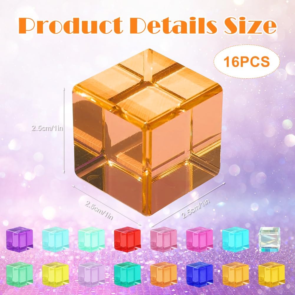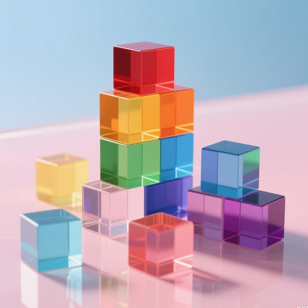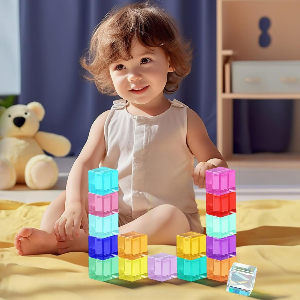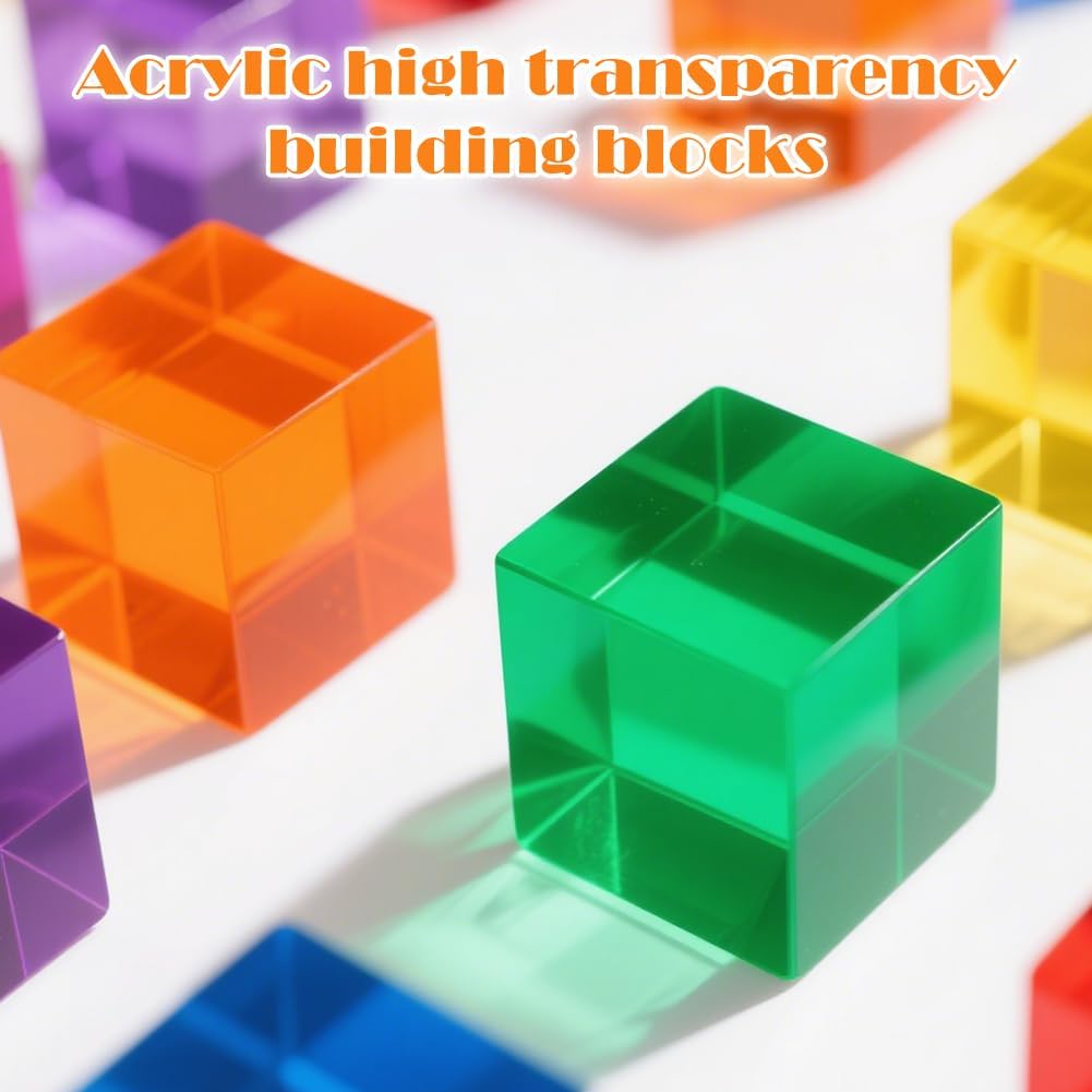Materiale di alta qualità: il set di mattoncini arcobaleno è realizzato in materiale acrilico di alta qualità, ma è anche assolutamente sicuro per la pelle sensibile dei bambini. Il materiale robusto garantisce una lunga durata, rendendolo la scelta perfetta per i giocattoli educativi sensoriali. Sviluppo cognitivo: forme geometriche di base (16 pezzi in totale) supportano giochi di impilamento, costruzione e classificazione dei colori. Promuove la coordinazione occhio-mano e il pensiero spaziale. Un giocattolo educativo di giorno, utilizzabile di notte con torcia per proiezioni di luce sulla parete. Per i piccoli giochi del mondo: perfetto per giochi di ruolo fantasiosi e piccoli mondi creativi che ispirano i bambini a scoprire e giocare. Perfetto per un'attività di gruppo, è un fantastico giocattolo per bambini in età prescolare e bambini in età scolare, giocattolo per bambini di età compresa tra 1 e 2 anni, giocattolo educativo STEM per ragazzi di 2-4 anni Colori vivaci e vivaci: contiene 16 cubi acrilici colorati (2,5 cm x 2,5 cm ciascuno). Con design unico trasparente sotto la luce del sole. I bambini possono impilarli in strutture spettacolari che sono sia visivamente attraenti che creativamente stimolanti. Blocchi ideali: questo è un giocattolo aperto che cresce insieme al tuo bambino. I colori vivaci e le diverse forme dei mattoncini da costruzione sono perfetti per i vostri bambini per sviluppare una conoscenza di base dei colori e della geometria della stanza. Mentre si divertono e sono creativi, i bambini usano anche l'impilamento di mattoncini per sviluppare abilità legate alla STEM.