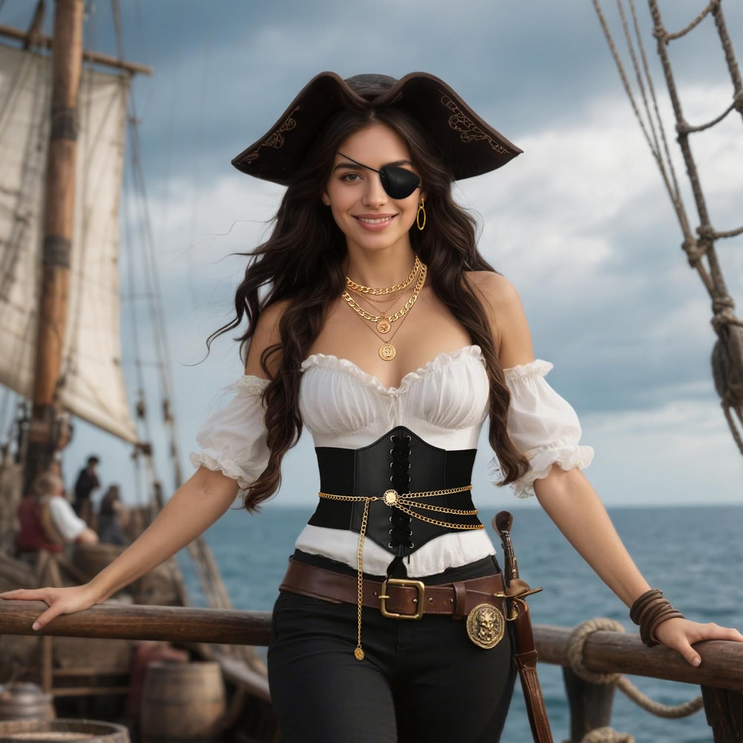 Nettes Piratenset für Frauen mit allem, was man braucht: Augenklappe, Hals- und Taillenkette, Ohrring, Kopftuch und breiter Taillengürtel. Der Gürtel ist dehnbar und wird am Rücken mit Klettverschluss geschlossen – dieser könnte allerdings etwas besser befestigt sein. Der Ohrring (Klipsverschluss) besteht aus billig anmutendem goldenen Kunststoff, während die Ketten aus Metall gefertigt sind, was positiv auffällt. Auch die Augenklappe ist aus starrem Kunststoff statt Filz, wodurch sie steifer wirkt. Trotzdem ein Set (ich teste es für Amazon) mit gutem Preis-Leistungs-Verhältnis (12,99 Euro, Stand 06.10.2025) – perfekt für Halloween oder Mottopartys.