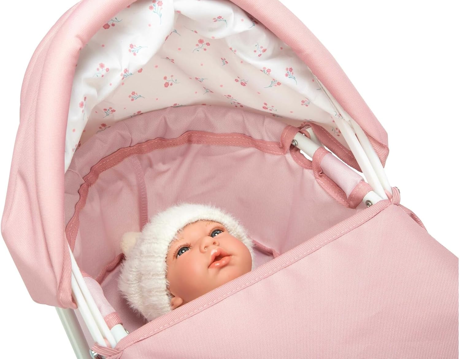 Questo carrello con stampa floreale rosa e bianco è perfetto per una passeggiata nel parco con la tua bambola preferita. È stato realizzato con tessuti e materiali di alta qualità che garantiscono la lunga durata del prodotto. Inoltre, la struttura solida è pieghevole per facilitarne la conservazione. La sua capacità è rimovibile e adatta per polsi fino a 45 cm.