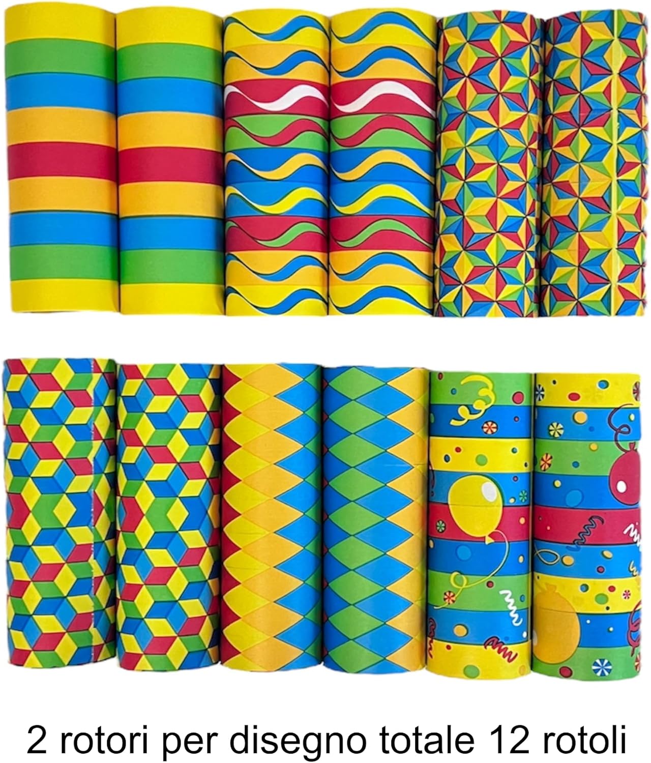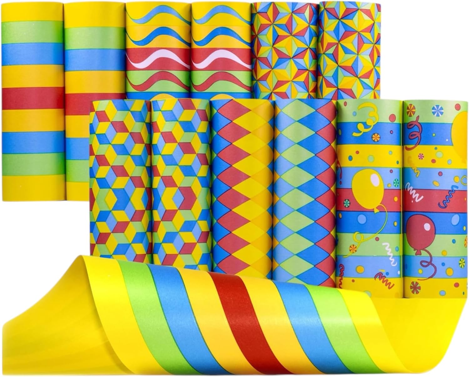 DESIGN FESTIVO: Rotoli di stelle filanti in colori vivaci con vari motivi geometrici - perfetti per feste e celebrazioni VARI MODELLI: Include strisce, onde, forme geometriche e motivi festivi di palloncini in blu, giallo, rosso e verde MATERIALE DI QUALITÀ: Realizzato in carta robusta e resistente agli strappi per decorazioni di lunga durata durante tutta la celebrazione DIMENSIONE PRATICA: Ogni rotolo ha le dimensioni ottimali per appenderlo facilmente e ottenere il massimo effetto decorativo USO UNIVERSALE: Ideale per compleanni, feste di carnevale, feste all'asilo e altre occasioni festive