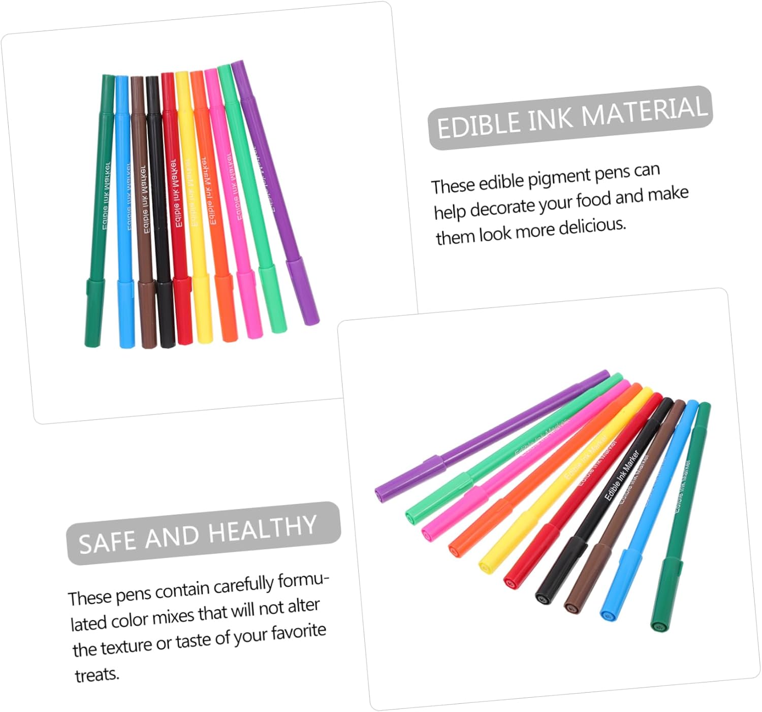 Strumenti per disegnare il cibo: questi prodotti sono progettati per essere leggeri e portatili, facili da usare e riporre, penne di plastica Penne di plastica pratiche: questi prodotti sono progettati in uno stile leggero e pratico, adatti a vari scenari, forniture per la cottura Penne per biscotti: sono progettate in uno stile semplice con una copertura per penna, ovvero igienico-sanitaria, forniture per la cottura portatili Pennarelli per biscotti: con questi pennarelli commestibili puoi incoraggiare i tuoi bambini a interessarsi cibo. utili pennarelli per torte fondente. Marcatori per torte in pasta di zucchero: sebbene il design di questi prodotti sia semplice, sono molto pratici quando li usi, marcatori per torte