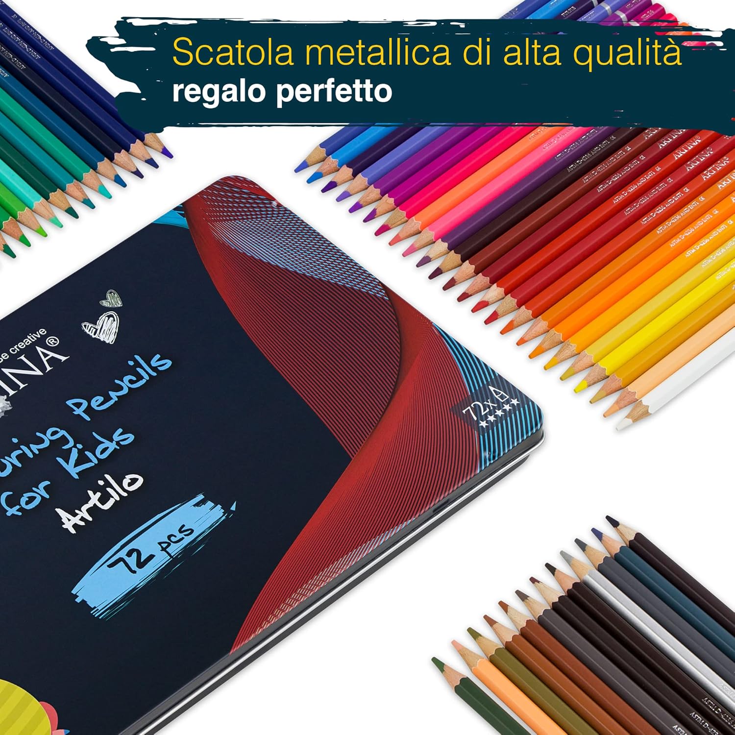 𝐒𝐄𝐓 𝐃𝐈 𝐌𝐀𝐓𝐈𝐓𝐄 𝐏𝐄𝐑 𝐁𝐀𝐌𝐁𝐈𝐍𝐈: I nostri pastelli da pittura e da disegno già preaffilati hanno una mina di 3,3 mm per linee lisce - principianti e bambini possono spiccare il volo in modo artistico con le nostre matite. Le matite non devono essere usate prima dei 4 anni. 𝐌𝐀𝐓𝐈𝐓𝐄 𝐒𝐓𝐀𝐁𝐈𝐋𝐈 𝐄 𝐑𝐄𝐒𝐈𝐒𝐓𝐄𝐍𝐓𝐈: Il set di matite viene fornito con una scatola di metallo in modo da avere sempre con sé uno spazio per riporre le stesse. Che le portiate da amici, al lavoro o a scuola: tutte le matite colorate sono al sicuro! 𝐌𝐀𝐓𝐈𝐓𝐄 𝐏𝐄𝐑 𝐒𝐂𝐔𝐎𝐋𝐀: le matite per disegnare e colorare per bambini, scolari, principianti e gruppi di bambini sono rivestite con la tonalità del colore, in modo da poter scegliere immediatamente il colore giusto. Le matite di legno FSC sono state prodotte da foreste gestite in modo sostenibile! 𝐌𝐀𝐓𝐈𝐓𝐄 𝐃𝐈 𝐀𝐋𝐓𝐀 𝐐𝐔𝐀𝐋𝐈𝐓𝐀': Set di matite colorate di alta qualità Artilo: Matite colorate forti, pigmentate e splendide - Molti colori, senza duplicati, tra cui blu, rosso, giallo, verde, viola, arancione, nero, bianco e molti altri ancora 𝐔𝐍 𝐍𝐔𝐌𝐄𝐑𝐎 𝐒𝐕𝐀𝐑𝐈𝐀𝐓𝐎 𝐃𝐈 𝐔𝐓𝐈𝐋𝐈𝐙𝐙𝐈: Le matite Artina sono perfette per dipingere, scrivere, disegnare, colorare, ombreggiare, mescolare, evidenziare e molto altro ancora! Le matite per bambini sono ideali per disegnare e colorare a scuola
