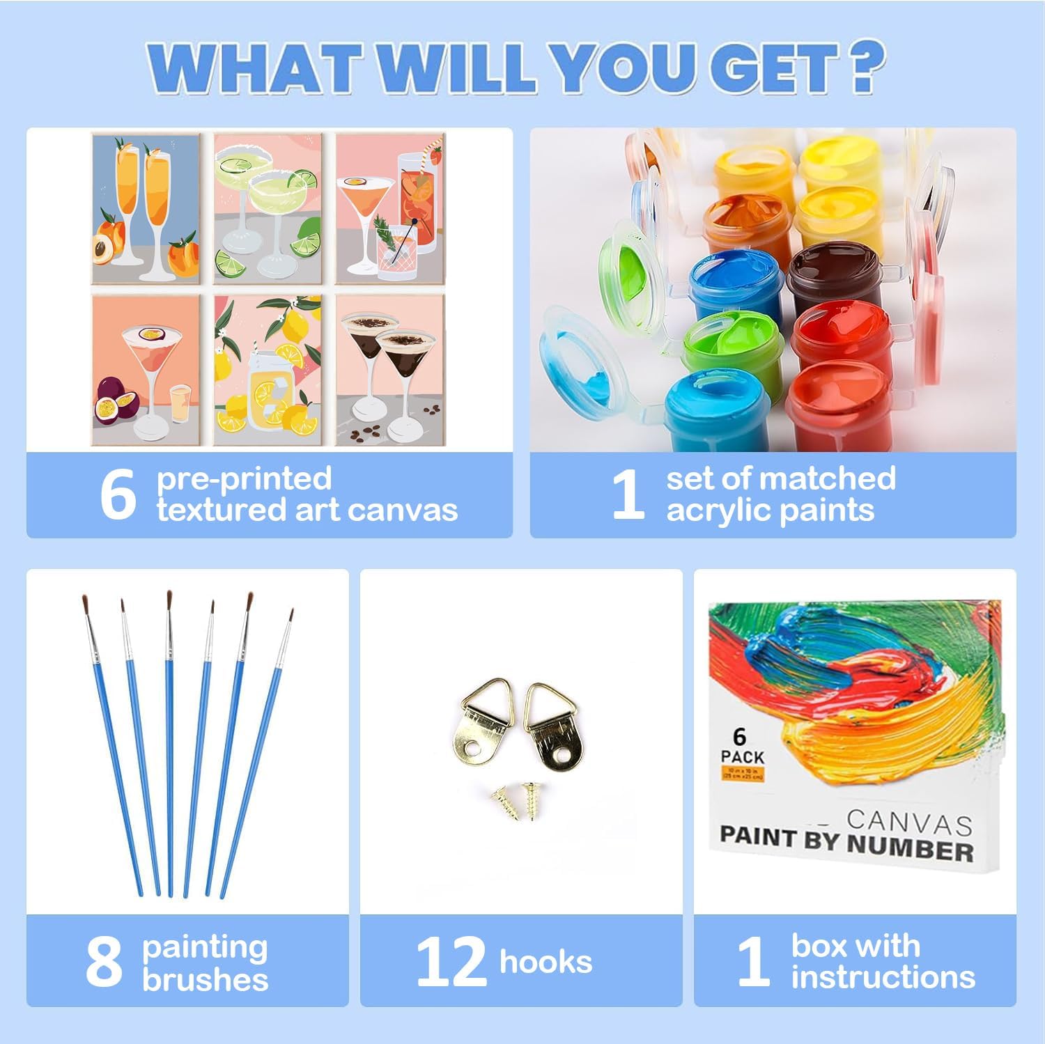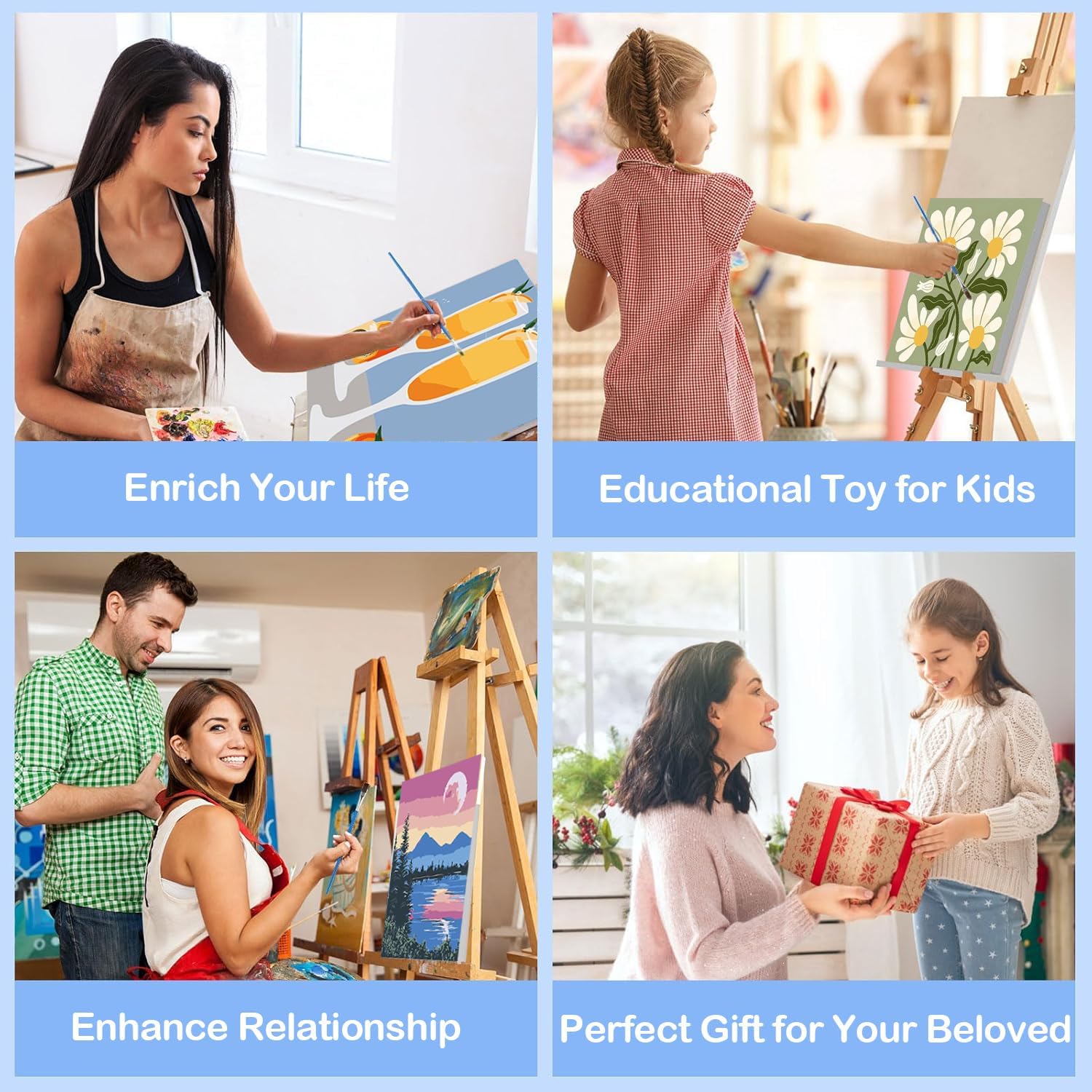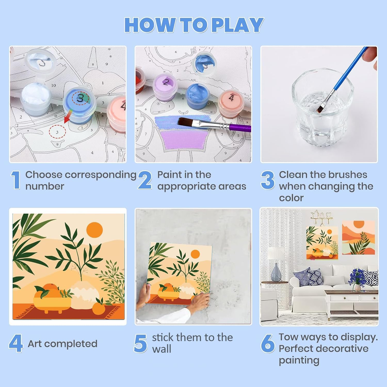 Includi 6 tele dipinte con numeri adulti con cornice opzionale, 8 pennelli professionali, 12 ganci adattivi e pigmenti acrilici a lunga durata—tutto il necessario per iniziare immediatamente senza attrezzi extra. I kit di Dipingere con i Numeri sono progettati per semplificare il processo, perfetti per principianti e artisti di tutti i livelli Le tele in tessuto sono stampate con numeri chiari corrispondenti ai colori acrilici, facilitando l'applicazione e riducendo l'affaticamento occhiale. Ideal per Paint by Numbers enthusiasts, ogni tela garantisce una copertura uniforme e una finitura professionale, anche per chi non ha esperienza in pittura I colori acrilici non tossici e ad alta opacità offrono toni vivaci che resistono al fading, mentre la tela di alta qualità e le stampe digitali nitide garantiscono una esperienza di pittura fluida. Questo Kit di Pittura a Olio con Numeri (effetto olio con tecnica acrilica) è adatto a adulti, anziani e bambini a partire dai 8 anni Usalo per rilassarti nel tempo libero, sviluppare la pazienza o condividere momenti creative con la famiglia. Completare i dipinti con numeri migliora il senso di realizzazione, riduce lo stress e aggiunge un tocco artistico alla tua casa—un'attività versatilesuitable per tutti gli occasionisti Perfecto come regalo per compleanni, San Valentino, Natale, Festa della Mamma o any special occasion. Il Dipingi con Numeri kit combina practicalità e arte, offrendo un'esperienza creativa che lascerà un segno. Incluso supporto per cornice (non inclusa) per una decorazione finale professionale