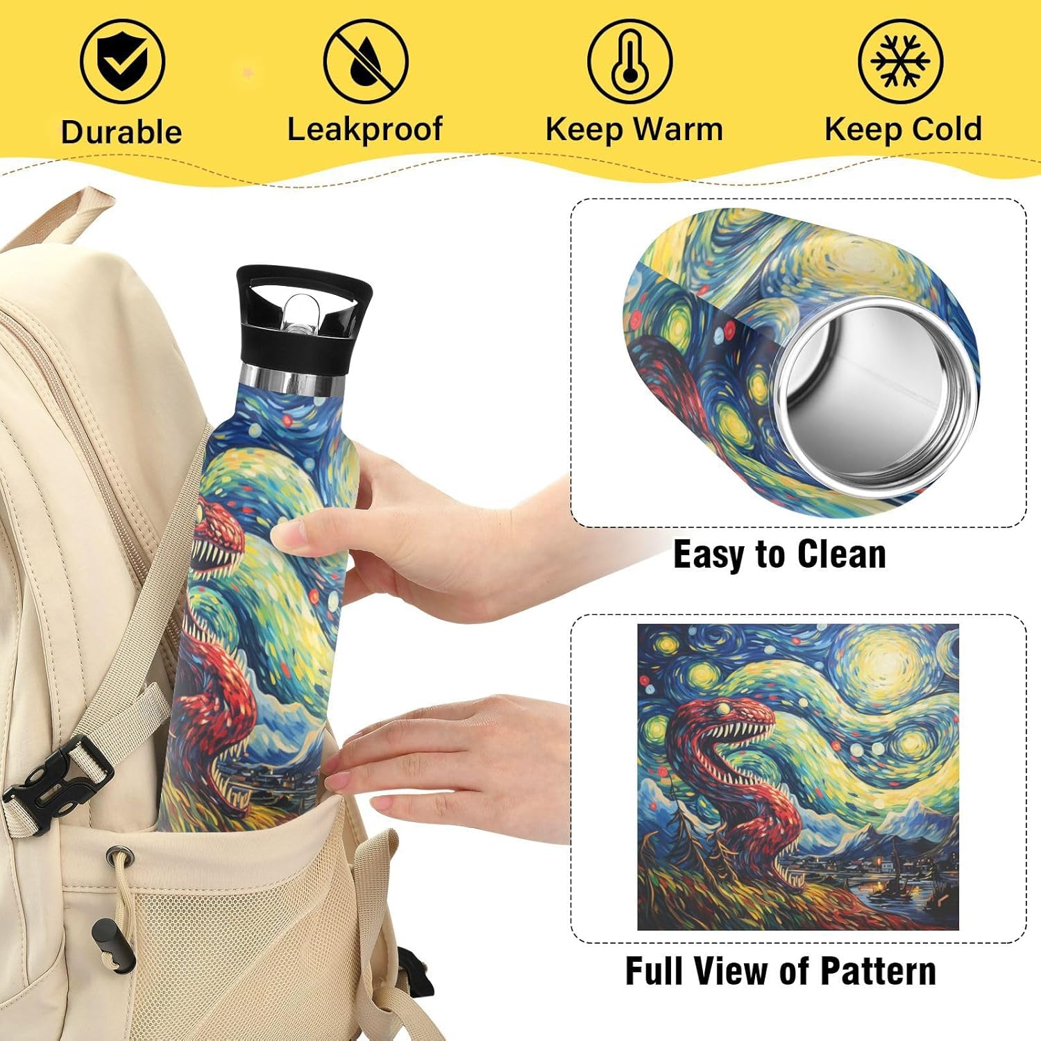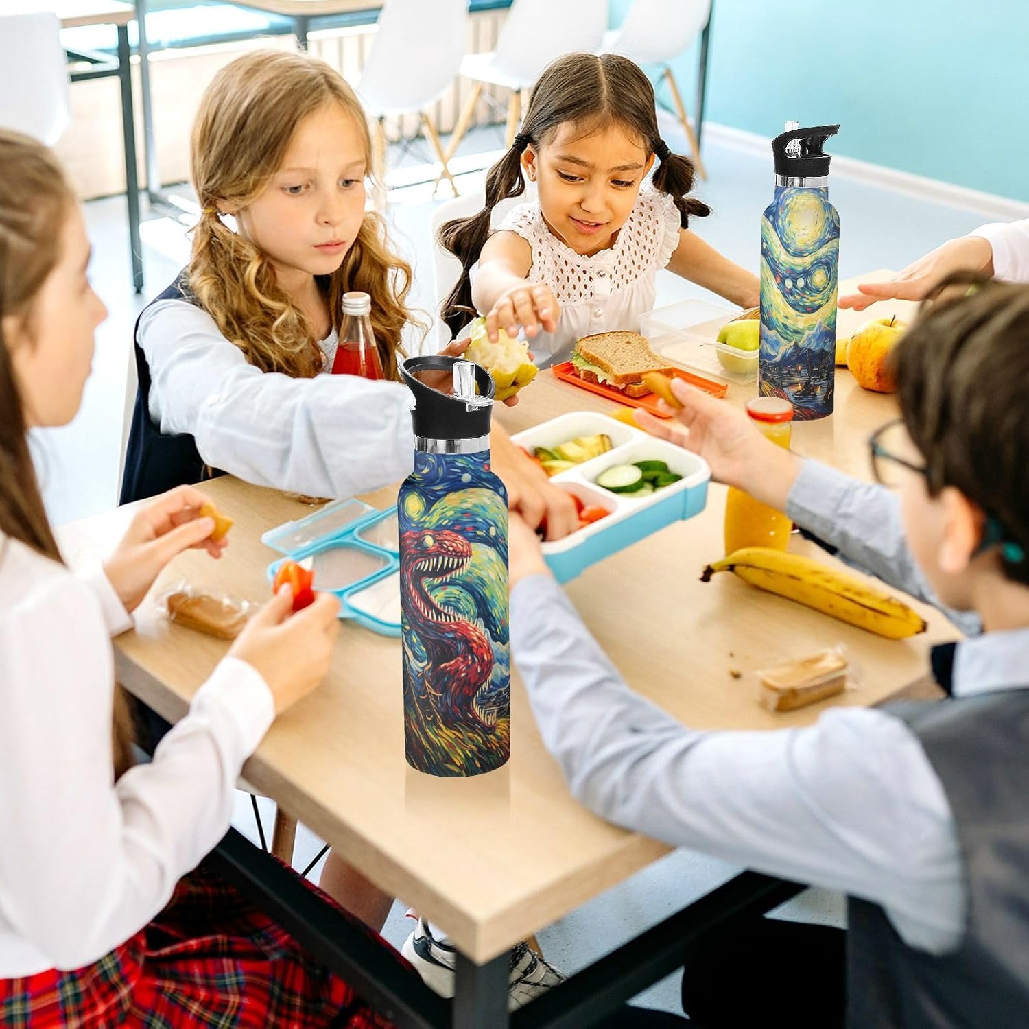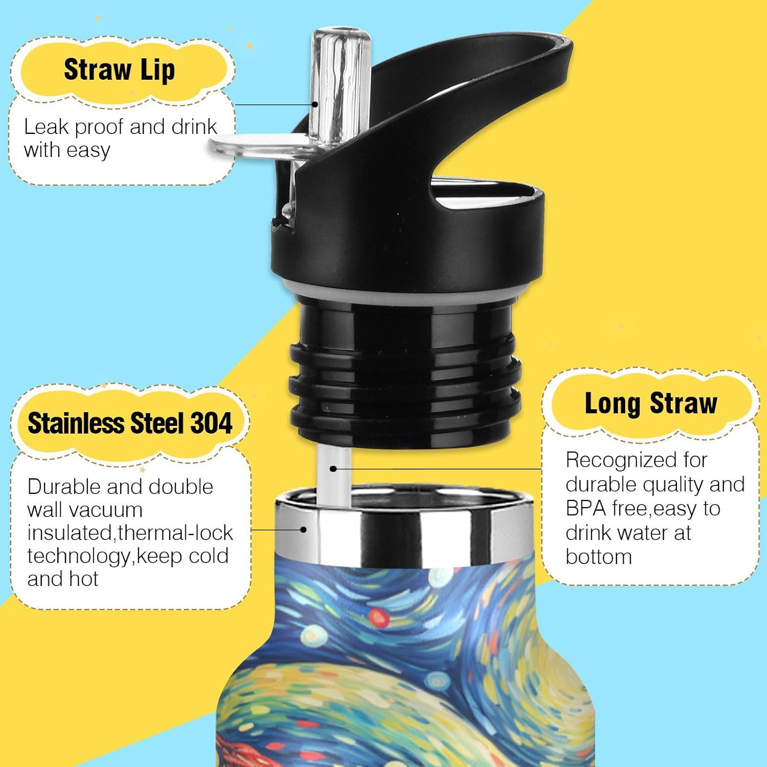1. Materiali Di Alta Qualità e Utilizzo Sicuro: Realizzati in acciaio inossidabile 304 di alta qualità per uso alimentare, PP e silicone. Per garantire che le bevande del tuo bambino rimangano pure, sicure e prive di sostanze chimiche nocive. 2. Tecnologia Di Isolamento Avanzata: Presenta un isolamento sottovuoto a doppia parete con uno speciale strato termoisolante, che mantiene le bevande calde o fredde per lunghi periodi: fino a 10 ore per le bevande calde e 8 ore per quelle fredde. 3. Design Intuitivo: Include un'innovativa cannuccia pieghevole e una valvola di sfiato a prova di perdite, per garantire una bevanda fluida e senza fuoriuscite. Il design rimovibile consente una pulizia igienica completa. 4. Facile Da Trasportare: Dotato di un'impugnatura ergonomica allargata che può contenere comodamente due dita, consentendo ai bambini di trasportare facilmente e in sicurezza la propria bottiglia ovunque. 5. Ideale Per Tutte Le Stagioni e Attività: Progettato perfettamente per soddisfare le esigenze di idratazione dei bambini durante tutto l'anno, adatto per la scuola, lo sport, i picnic, le escursioni, i viaggi e l'uso quotidiano.