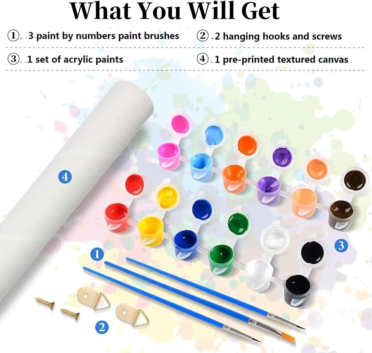【IL KIT DIPINGERE CON I NUMERI INCLUDE】Non è necessario acquistare altri strumenti per iniziare la tua creazione. Il kit di dipingere con i numeri include 1 tela prestampata con texture (senza cornice), 1 set di colori acrilici, 1 set di pennelli (include 3 pezzi), 2 ganci e 1 foglio di istruzioni dettagliate. 【TELA A COLORI HD】Il nostro kit di dipingere con i numeri per bambini utilizza tele colorate ad alta definizione. A differenza delle tele normali, la tela colorata consente di distinguere più facilmente l'area dei numeri e non affatica gli occhi quando si dipinge a lungo. 【NON È RICHIESTA ALCUNA CORREZIONE DEL COLORE】Questo kit di dipingere con i numeri per adulti utilizza pigmenti acrilici sicuri, può essere colorato direttamente, senza bisogno di aggiungere acqua per la miscelazione. I colori acrilici hanno un forte potere coprente e colori brillanti, garantendo che l'opera non sbiadisca a lungo, evidenziando il valore della collezione d'arte. La quantità di pigmento aggiunta è aumentata del 30%, offrendoti maggiore tranquillità. 【PITTURA DIGITALE FAI DA TE】Il processo di creazione di dipinti a olio digitali può rilassare corpo e mente, alleviare lo stress e tenere i bambini lontani dai videogiochi, migliorandone la concentrazione. Une fois ce projet terminé, les enfants auront un sentiment d’accomplissement, ce qui profitera à leur intelligence et fiducia in se stessi. 【SERVIZIO POST-VENDITA ACCURATO】Poniamo grande enfasi sull'esperienza di acquisto dei nostri clienti. Per qualsiasi domanda sui nostri prodotti, non esitate a contattarci inviandoci un'e-mail su Amazon. Risponderemo e risolveremo il vostro problema il prima possibile per garantirvi il massimo supporto durante tutto il processo di pittura.