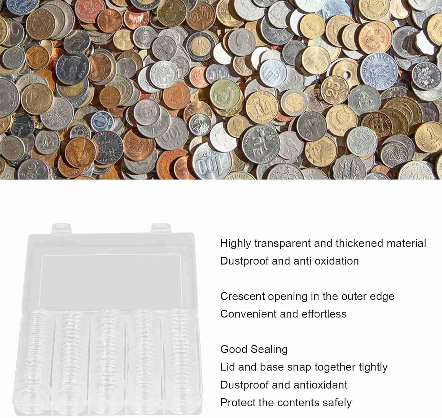 Dimensione DA 17 a 30 mm: Custodia per Raccolta Monete Con 5 Diverse Specifiche per 17 mm, 20 mm, 25 mm, 27 mm E 30 mm, Adatta per conservatore la Maggior Parte Ti Tipi di Monete. Pastigiglia in Schium Eva: La Scatola Portaoggetti è Facele da Separalare gli Anelli di Schium Dai Cuscetti a Schium Eva nella base alle dimensioni della moneta per evitare Che le monete Scivolino e Si Greffino. SIGILLARA Perfetta: Il Contenitore Trasparente per Monete facilita la Conservazione e Lo Scambio Di Monete, il Coperchio e la Base Si Incastrano Saldame, Antipolvere e Antiossidanti, Proteggono Il Contenuto in Modo Sicuro. Quantità Abbastanza: IL set di protezione per monete include 100 capsule per monete, 1 scotala di plastica e 100 guarnizioni in schium eva abbinate, che proteggono le tue monete preferitite. Facile da Aprire: OGni Portacapsule per Monete ha un'pertura a Mezzaluna Sul Bordo Esterno, Che Si apre in Modo Più Comodo e Senza Sforzo.