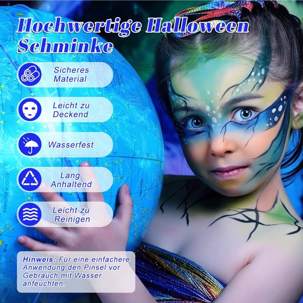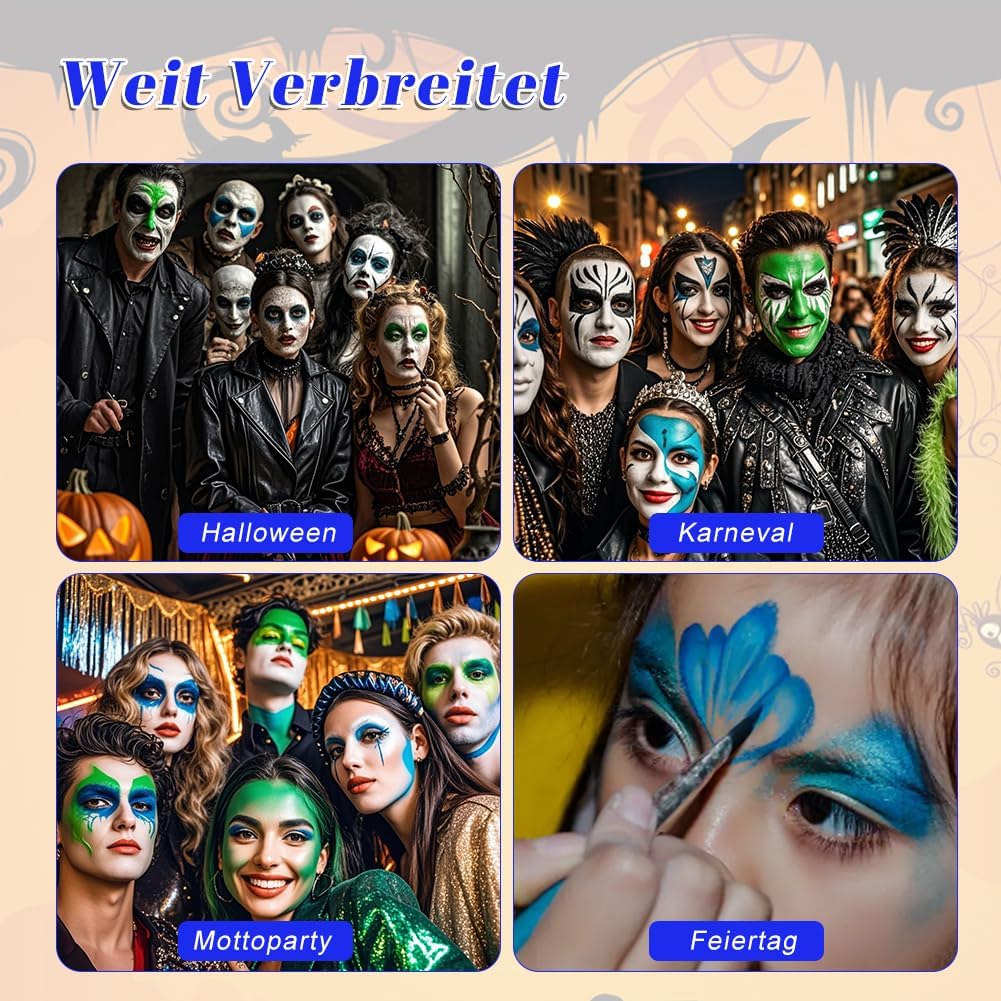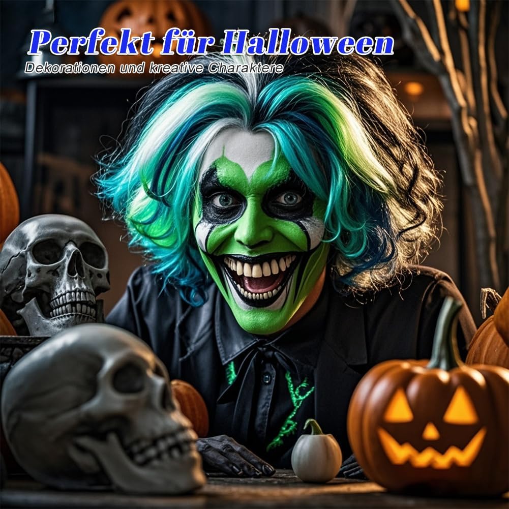 【Set trucco Halloween】 Riceverai tre pennelli bicolore (bicolore verde, bicolore blu e bicolore bianco e nero) e 10 pennelli. Con tutti gli strumenti di cui hai bisogno, puoi liberare la tua creatività e creare un look di Halloween unico. 【Materiali di alta qualità】 Il trucco di Halloween è realizzato con materiali di alta qualità, è sicuro e affidabile e ha una consistenza morbida e fine. Le setole dei pennelli sono morbide, non cadono facilmente e sono resistenti. La morbida spugna è elastica e non si deforma facilmente. 【Cosplay divertente】 Il set di trucchi per Halloween offre colori ricchi e saturi facili da applicare, rendendolo ideale per costumi di Halloween come scheletri, zombi, elfi e mostri. Può anche essere combinato con altri costumi per creare stili diversi e aggiungere più divertimento alle feste di Halloween. Facile da usare: il set per il trucco di Halloween è compatto e portatile, il che lo rende ideale per feste ed eventi. Scegli il colore desiderato e applicalo semplicemente con pennello e spugna. Puoi anche mescolare questi tre colori con altri colori per creare il tuo colore preferito unico. 【Versatile】Il set di trucchi per Halloween è perfetto per Halloween, carnevale, feste di compleanno, feste a tema, cosplay, spettacoli teatrali e altre occasioni. Fa risaltare il tuo look dalla massa e trasuda fascino.