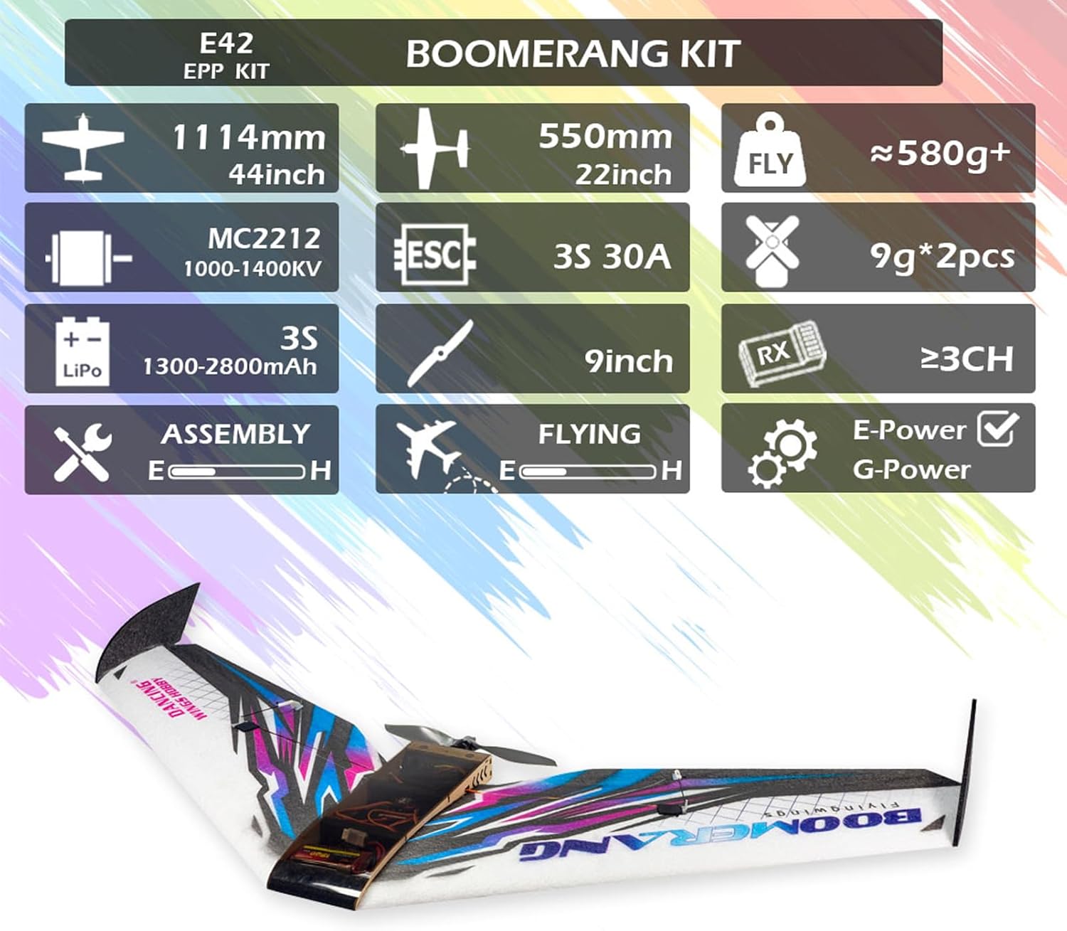 [MATERIALE EPP DUREVOLE] può resistere a cadute e atterraggi violenti, garantendo una lunga durata. [VOLO STABILE E FLUIDO] grazie ad un'apertura alare di 1114 mm e una lunghezza di 550 mm per eccellenti prestazioni di sollevamento e planata. Il kit completo comprende motore MC2212 1020KV, ESC 30A, servo 2*9g ed 9 pollici. Il processo di assemblaggio fai--te dedicato consente la personalizzazione e l'apprendimento. NOTA: Trasmettitore, batteria, colla e colla non inclusi.