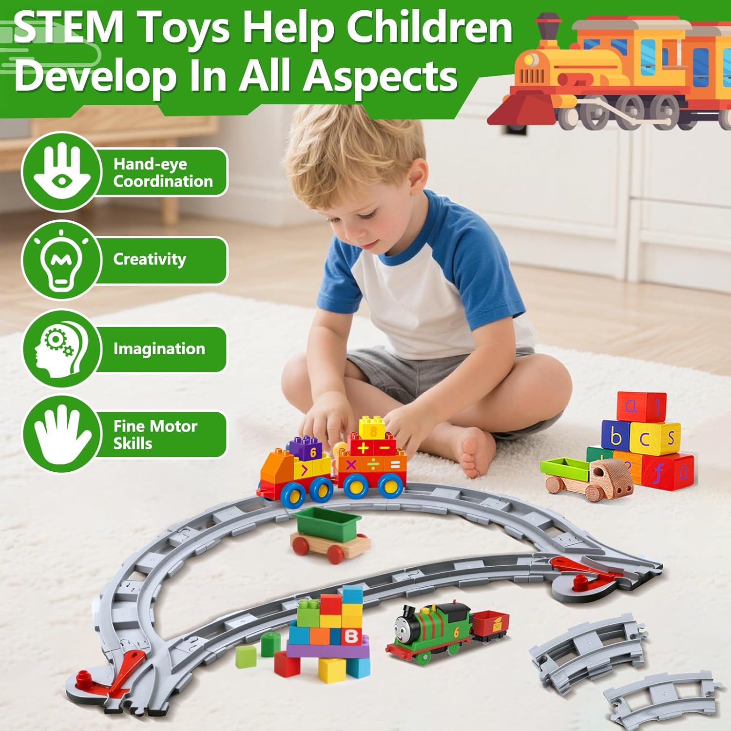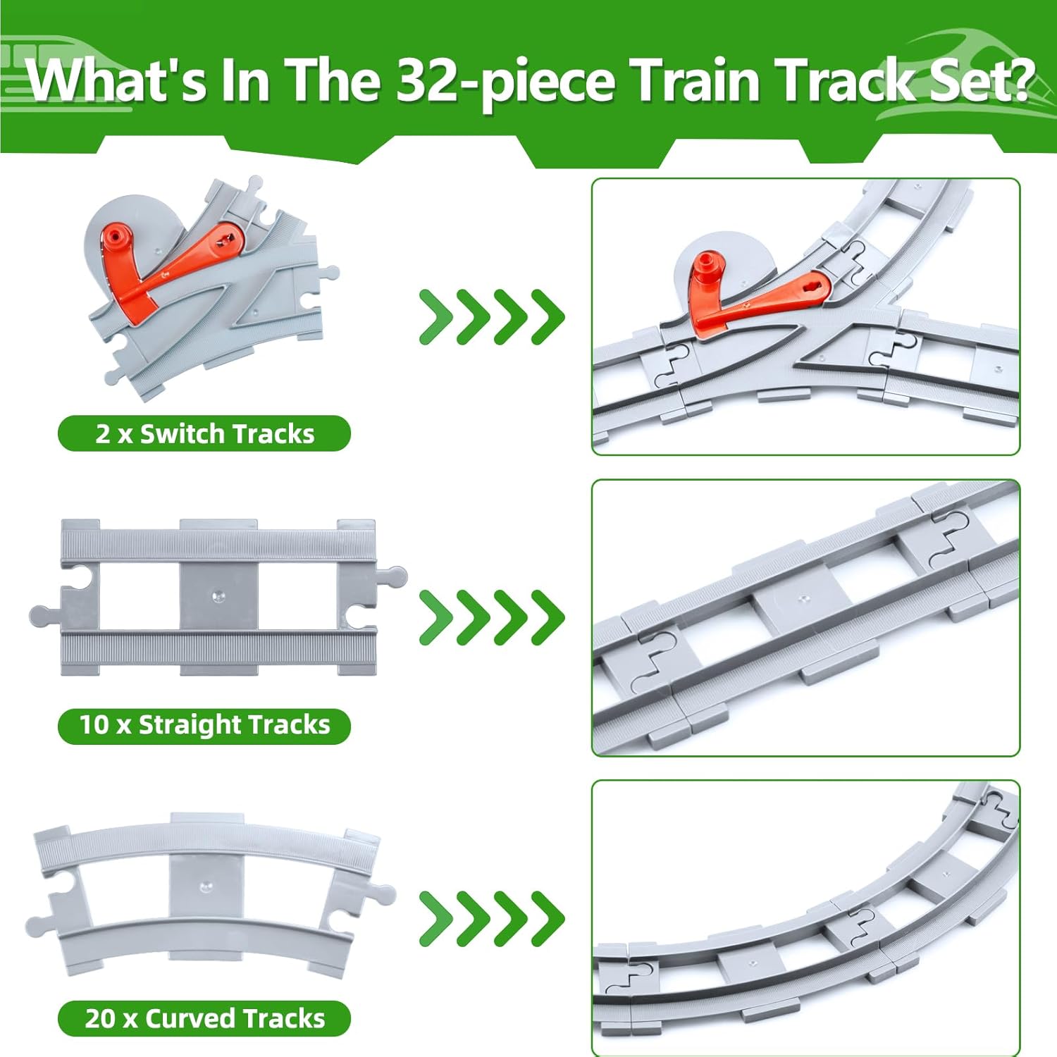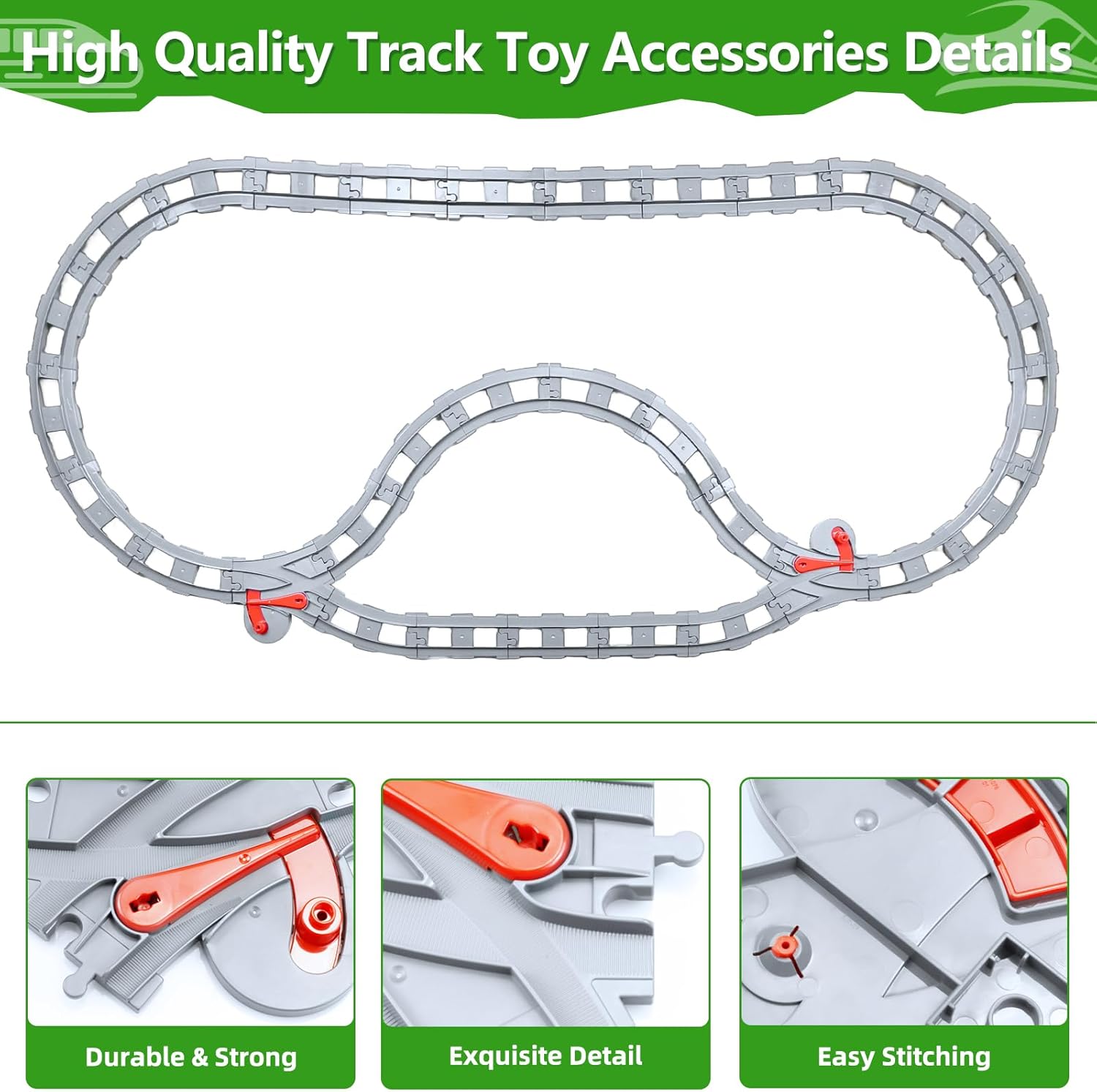 【Design altamente compatibile】 Accessori per binari ferroviari da 32 pezzi, inclusi 10 binari dritti, 20 binari curvi, 1 custodia e 2 set di componenti per scambi. Completamente compatibili con gli assortimenti di binari standard sul mercato, aiutano gli utenti ad ampliare i set di blocchi da costruzione esistenti e a creare scenari di binari più complessi. 【Materiali sicuri ed ecologici】 Realizzato in plastica ABS per uso alimentare, ha superato la certificazione CE UE, è atossico e inodore, resistente alle cadute e all'usura e adatto al contatto diretto con i bambini. Questo set di giocattoli è dotato di una custodia per riporre facilmente gli accessori disordinati. 【Gli accessori per binari ferroviari stimolano la creatività】 La modalità di costruzione aperta consente ai bambini di progettare liberamente il tracciato dei binari secondo la loro immaginazione e di allenare la loro consapevolezza spaziale e il pensiero logico combinando binari dritti e curvi. 【Combinazione di apprendimento e intrattenimento basati su scenari】 Lo smontaggio e il rimontaggio ripetuti promuovono la pazienza e la concentrazione, soddisfacendo le esigenze di sviluppo cognitivo dei bambini dai 3 ai 12 anni. Adatto all'interazione genitore-figlio in famiglia o alle attività di gruppo all'asilo. 【Un regalo fantastico per bambini dai 3 anni in su】La confezione contiene 32 set di binari, adatti come regali per la Festa dei Bambini, compleanni, Natale e altre celebrazioni, adatti a bambini e bambine.
