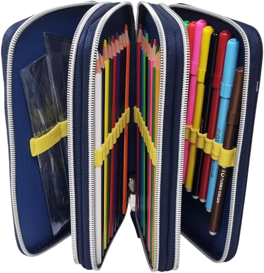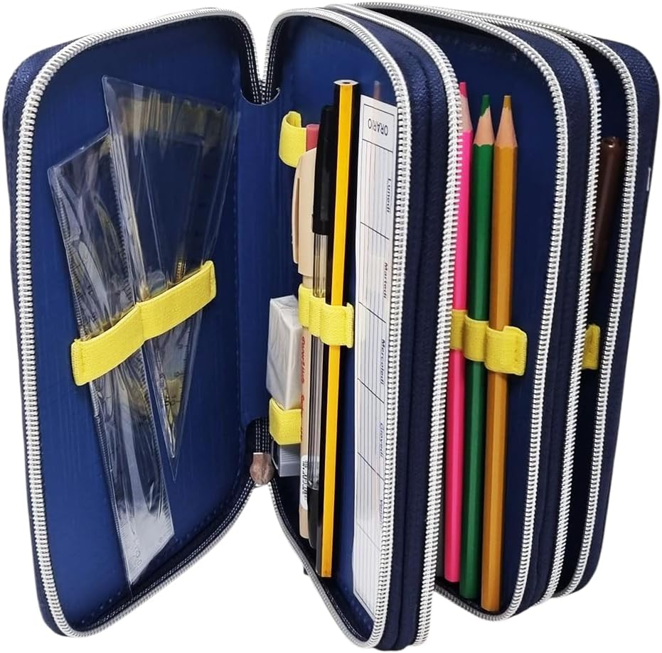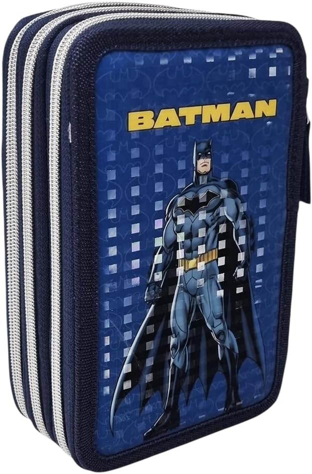 Astuccio Scuola Batman 42 pz 3 Scomparti 18 colori Giotto, 18 pastelli, 1 gomma da cancellare, 1 temperino, 1 righello 1 matita, 1 penna rossa, 1 penna blu. Dimensioni: 20 x 12,5 x 6,5 cm.