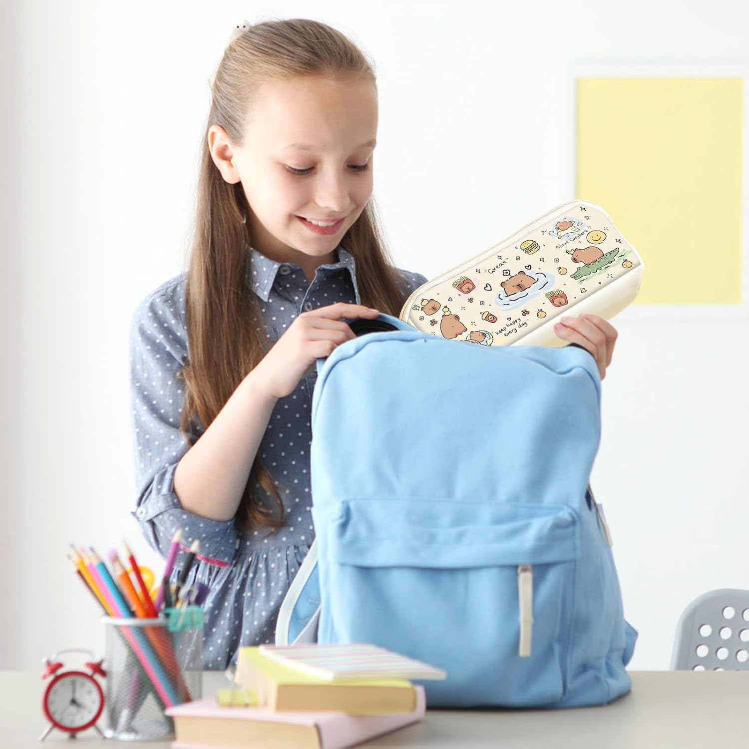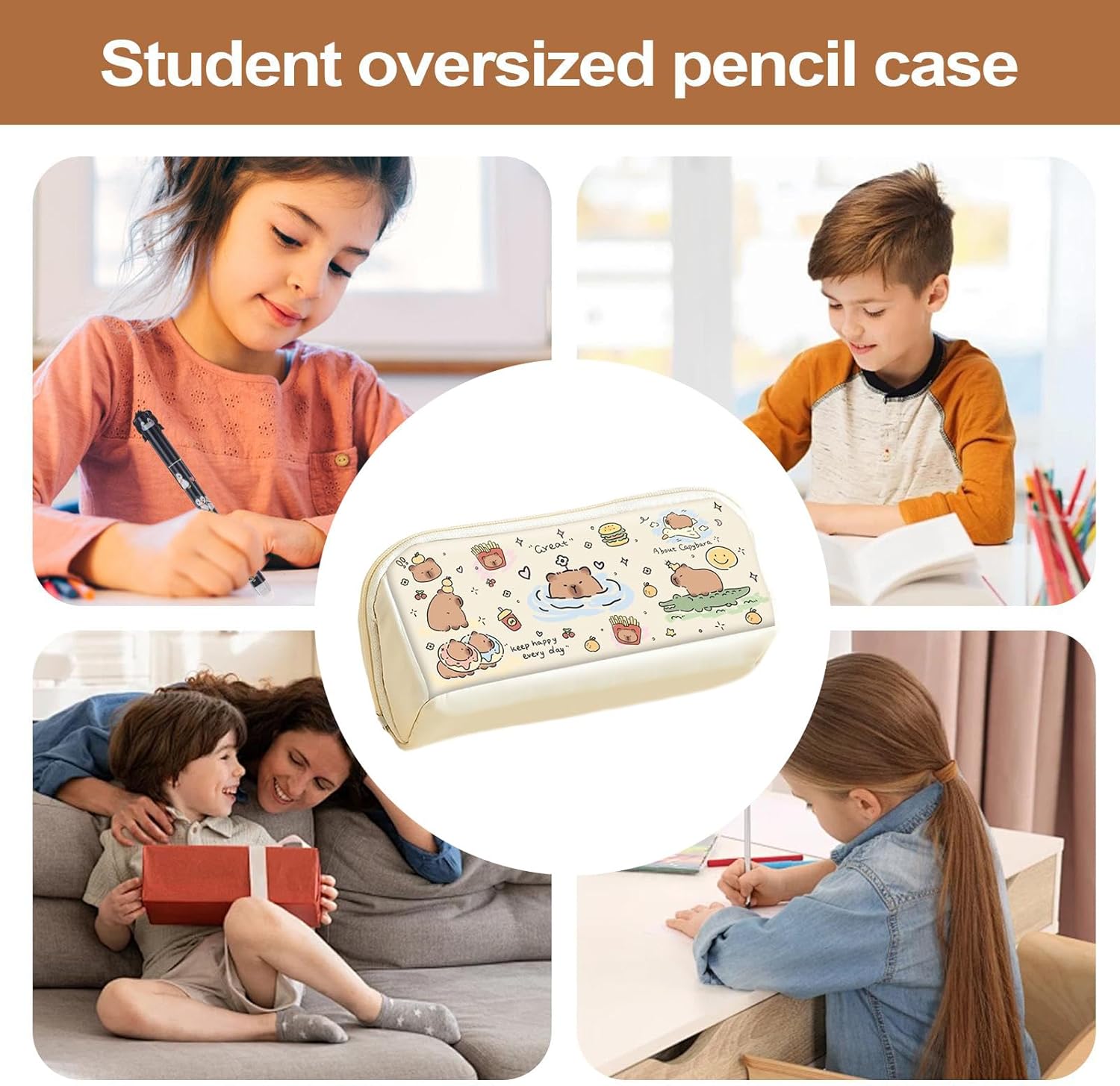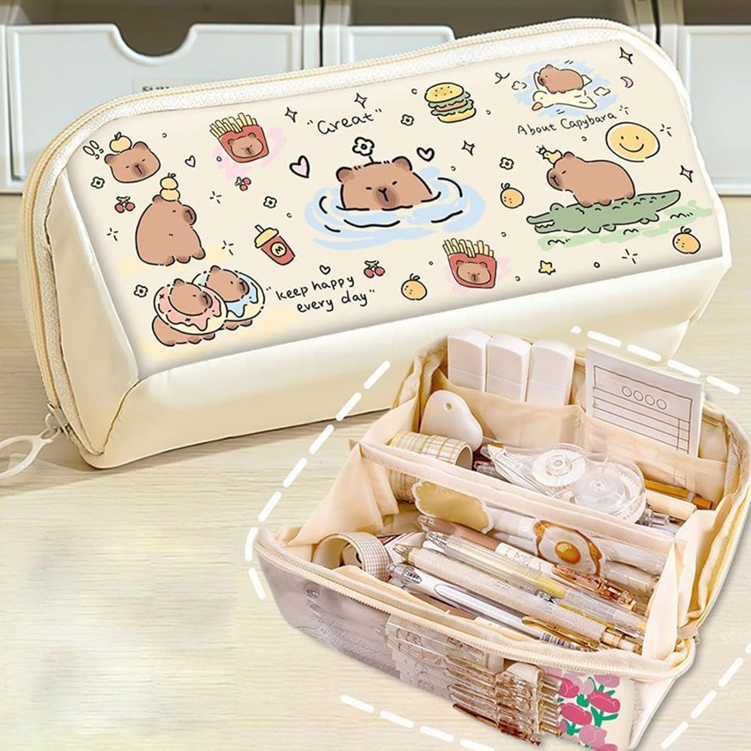 Effetto pelle double face: l'astuccio a forma di prisma con texture in pelle su entrambi i lati combina eleganza estetica con funzionalità adatte all'uso quotidiano per un look sofisticato e una durata pratica Layout salvaspazio: il design ben studiato a doppio scomparto garantisce un'organizzazione efficiente della cancelleria per la scuola e l'arte. Consente agli studenti di accedere rapidamente ai propri oggetti mantenendo sempre in ordine i propri oggetti. Protezione del materiale resistente: la speciale tecnologia di laminazione garantisce una protezione duratura dai graffi e previene la penetrazione delle penne, ideale per l'uso frequente della scrivania Fascino giovanile Capybara: l'allegra illustrazione di Capybara con espressioni accattivanti combina il funzionale portapenne con un'atmosfera rilassante, appositamente progettata per gli adolescenti e convince per il suo aspetto contemporaneo Comfort portatile: con dimensioni ergonomiche per una mobilità facile da trasportare e si adatta perfettamente alle tasche laterali degli zaini, ideale per l'uso quotidiano in viaggio e in viaggio
