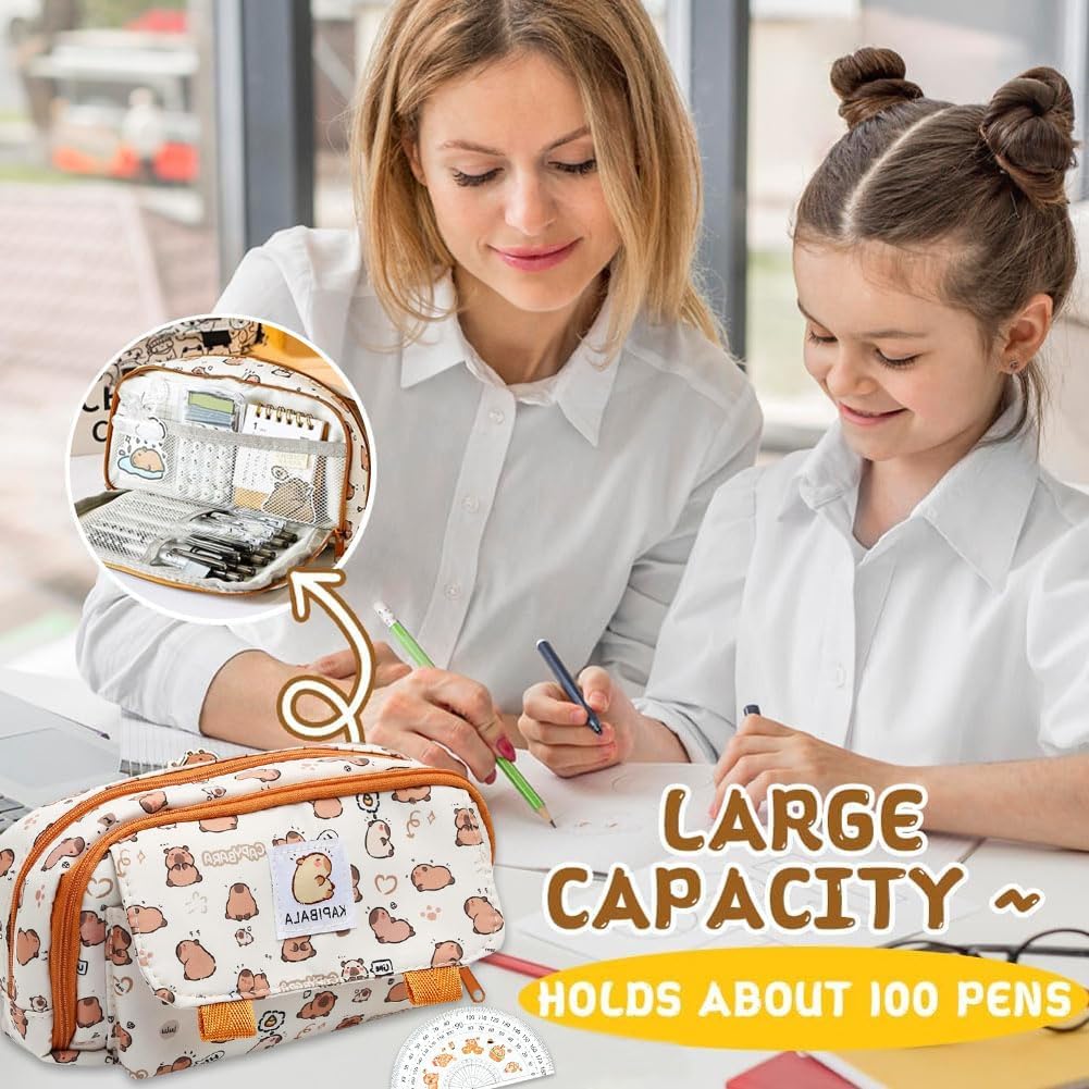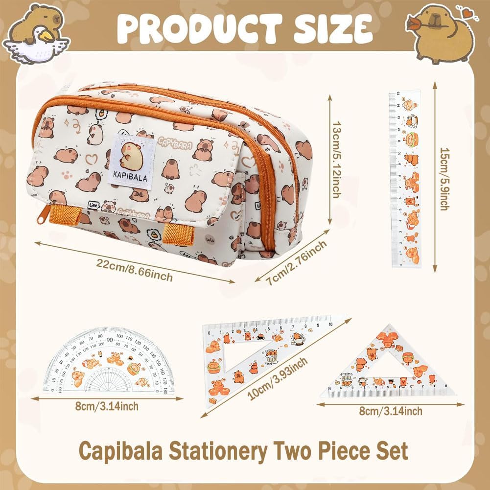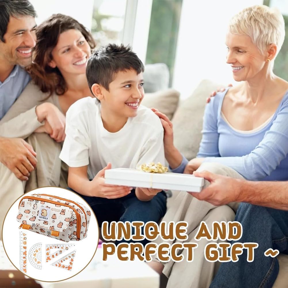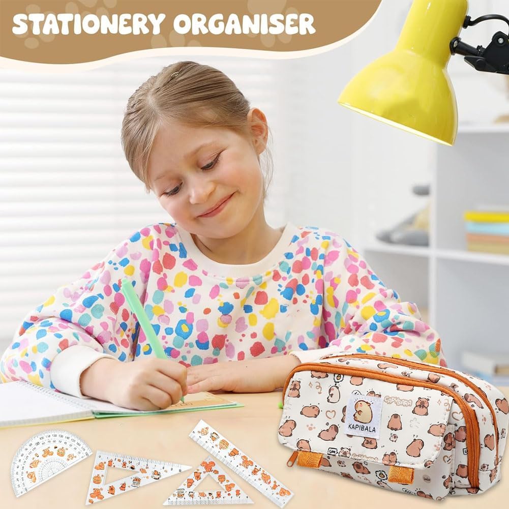 Capybara Astuccio Scuola Bambini: simpatico astuccio con più scomparti con cerniera e design in tessuto morbido che offre spazio per penne, gomme, righelli e altro ancora Capybara Righello Set accessori da disegno: contiene righello da 15 cm e goniometro con motivi Capybara abbinati, ideale per lezioni di matematica o momenti di disegno creativi Set di cancelleria con motivo animale, per bambine e ragazzi: il design uniforme Capybara garantisce un buon umore nella vita scolastica e porta un'organizzazione elegante su qualsiasi scrivania Pratico e portatile per la scuola e i viaggi: leggero e compatto si adatta perfettamente a qualsiasi zaino per la scuola elementare o come custodia da viaggio Idea regalo per fan di Capybara per bambini adolescenti: fantastico set di accessori Capybara per compleanni, inizio scuola, Natale o semplicemente come piccola sorpresa per gli amanti dei capybara
