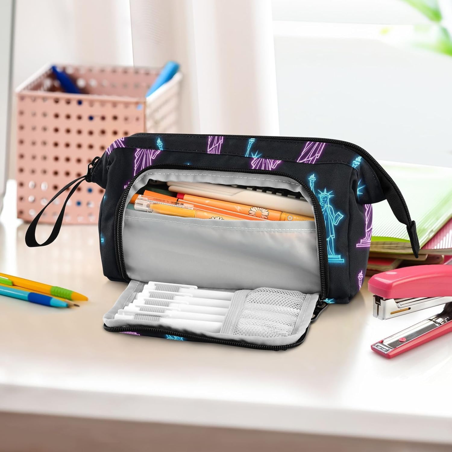 Materiale adeguato: questo robusto astuccio organizer è realizzato in robusto tessuto di nylon, di lunga durata, pratico, resistente all'usura, resistente ai graffi, facile da lavare e pulire. Con cerniera in metallo liscio, può aprirsi e chiudersi facilmente. (Non adatto a bambini di età inferiore ai 3 anni!) Grande capacità: 24 x 9,5 x 15 cm. Dotato di 1 grande scomparto, 1 comoda tasca laterale e 2 tasche interne, Pencil Bags è davvero un must have di dimensioni generose. La tasca principale può organizzare fino a 40-60 penne, matite o pennarelli, anche gomme, righelli, calcolatrici, nastri, foglietti adesivi, pennelli, cosmetici possono essere riposti facilmente. Con 5 matite schiaffeggiate sulla tasca laterale, le penne spesso utilizzate possono essere fissate. Due tasche interne possono contenere oggetti facilmente persi come carte, chiavi e contanti. Design portatile e conveniente: con peso leggero, corpo piccolo e piegatura manuale, il nostro astuccio organizer è facile da trasportare in borsa o tenere a portata di mano. L'apertura superiore e l'apertura laterale offrono scelte per voi per prendere o mettere le vostre necessità in esso. Puoi vedere chiaramente il tuo articolo dall'alto e trovare le tue penne, matite, pennarelli e pennelli usati di frequente dal lato. Scenario applicabile: l'astuccio non è solo un astuccio, ma può anche essere utilizzato per altri scopi. È adatto per occasioni come studio, ufficio, gite, viaggi, uscite e così via. Inoltre, può essere utilizzato come astuccio per penne, matite o pennelli, borsa per il trucco, ufficio personale e custodia per forniture scolastiche. Materiale lavabile: l'intero astuccio è lavabile. il modo corretto di lavare è a mano; il lavaggio in lavatrice non è supportato. Non aggiungere candeggina durante la pulizia.