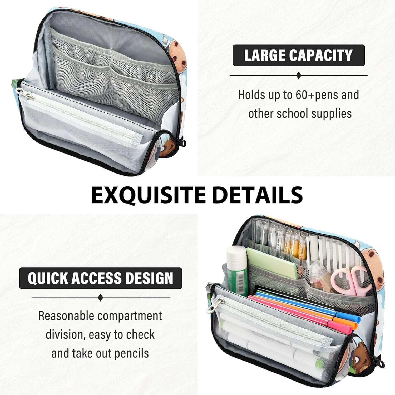 Funzionale design magnetico a scatto: ripiegare la borsa e lasciare che il magnete integrato lo mantenga stabile: la custodia con cerniera per il trucco si trasforma in un elegante ed efficiente organizer da scrivania in pochi secondi Qualità che puoi sentire: il nylon resistente offre ai bambini una struttura leggera ma resistente, mantenendo il contenuto al sicuro rendendo la pulizia semplice e senza problemi Spazio massimo di archiviazione: gli astucci scolastici per ragazze utilizzano un layout interno intelligente con tasche multiple per contenere tutto, dagli strumenti di scrittura ai piccoli accessori in ordine Un sacchetto, molti scopi: l'astuccio per ragazze passa facilmente da un astuccio per la scuola, un astuccio per il trucco o un porta attrezzi da viaggio, ideale per studenti, professionisti e creativi Ideale per occasioni speciali: le borse organizer da viaggio offrono un tocco personale con stampe vivaci e personalizzazione opzionale, adatte per laurea, compleanni o rientro a scuola