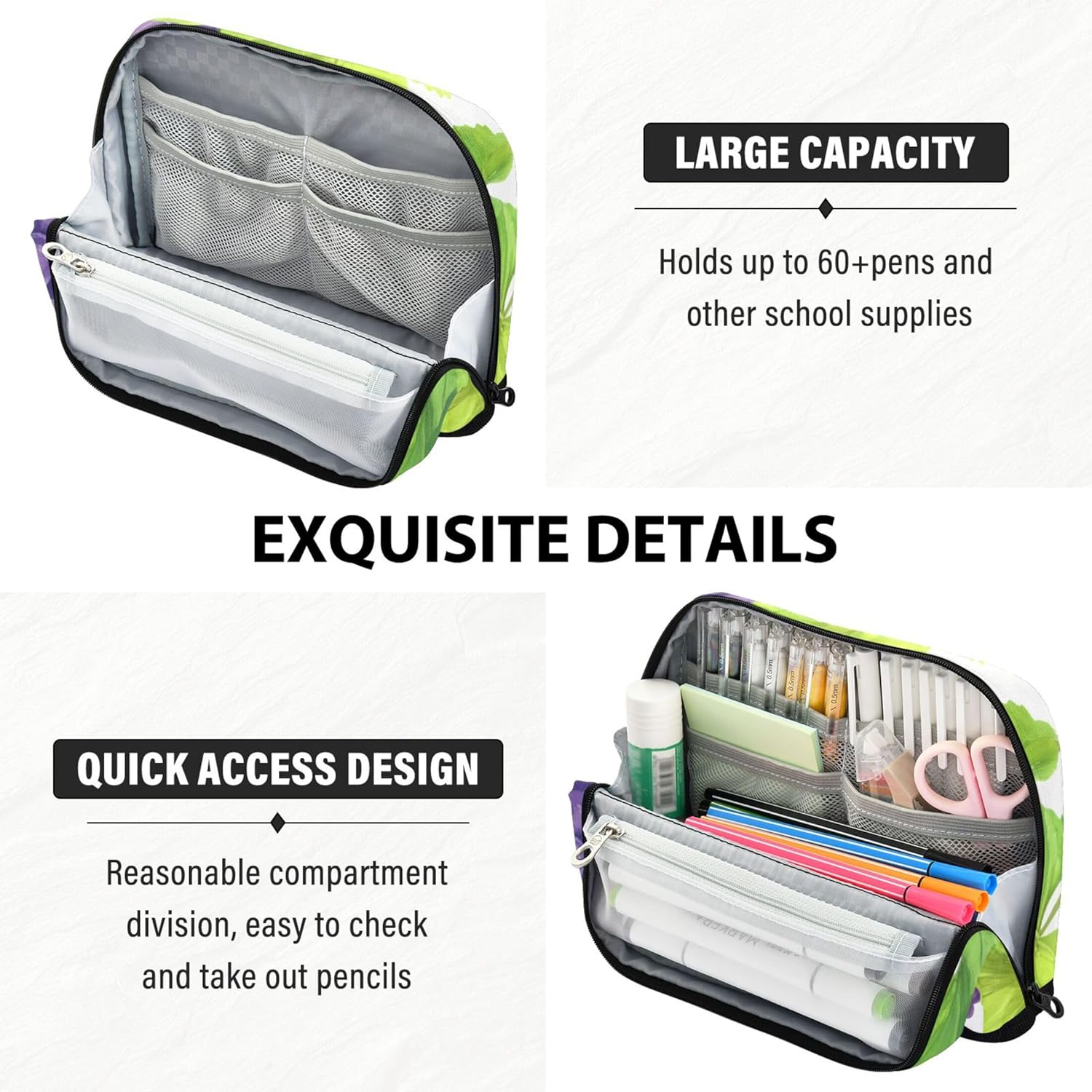 Innovativa base pieghevole: progettata per piegarsi e bloccarla in posizione, il portamatite per ragazze diventa immediatamente un contenitore indipendente, adatto per organizzare forniture mentre si lavora o si studia Selezione intelligente del tessuto: i simpatici astucci sono realizzati in nylon robusto che offre flessibilità e protezione, garantendo che gli strumenti quotidiani rimangano al sicuro senza aggiungere ingombro Grande capienza: dispone di uno scomparto principale, una tasca in rete con cerniera e una tasca aperta per organizzare penne, matite, gomme, temperamatite e foglietti adesivi Multiuso: l'astuccio da ufficio funziona come astuccio per penne, astuccio per il trucco, kit da viaggio o organizer per ufficio, ideale per scuola, lavoro, gite e uso quotidiano Progetta a modo tuo: il simpatico astuccio con cerniera supporta modifiche personalizzate come testo personalizzato o opere d'arte caricate, rendendolo un'idea regalo eccezionale per bambini e adulti creativi
