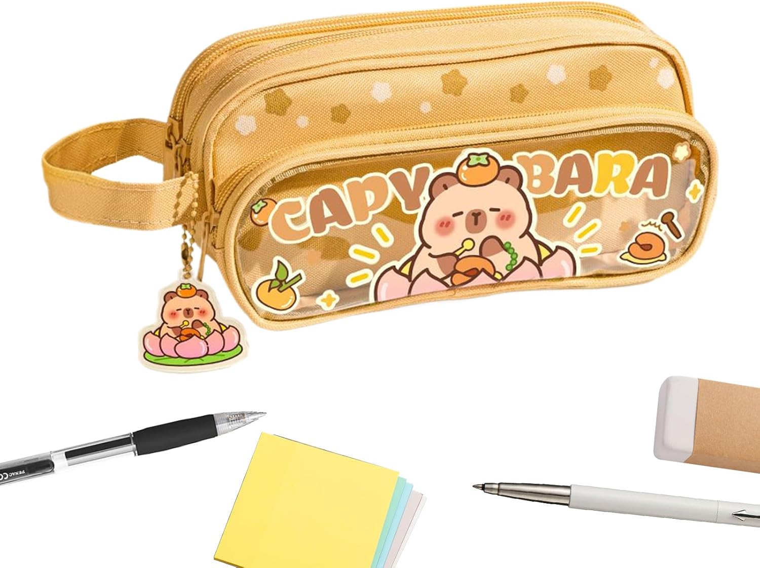 Buona resistenza: realizzato in materiale resistente, questo astuccio può resistere all'usura quotidiana ed è sicuro per i bambini. Offre una durata duratura e un'esperienza inodore per le esigenze quotidiane della scuola e dell'utilizzo. Comfort: con manico leggero e impugnatura morbida, questo astuccio è ideale per l'uso quotidiano scolastico e le gite. La maneggevolezza a misura di bambino consente di trasportare facilmente penne e accessori durante le attività quotidiane. Controllo visivo istantaneo: la parte anteriore trasparente mostra i contenuti a colpo d'occhio, combina l'aspetto moderno con un ordine efficiente per una facile organizzazione e una maggiore facilità d'uso. Simpatici motivi animali: colori tenui e adorabili motivi di orso capybara rendono questo astuccio accattivante. Ispira i bambini a mantenere l'ordine regolare e aumenta la gioia di imparare grazie al design visivamente accattivante. Ripartizione efficiente: il design a 3 livelli può contenere 100 penne. Mantiene organizzati i materiali scolastici e migliora le prestazioni di apprendimento. Righelli e accessori possono essere facilmente integrati e riposti