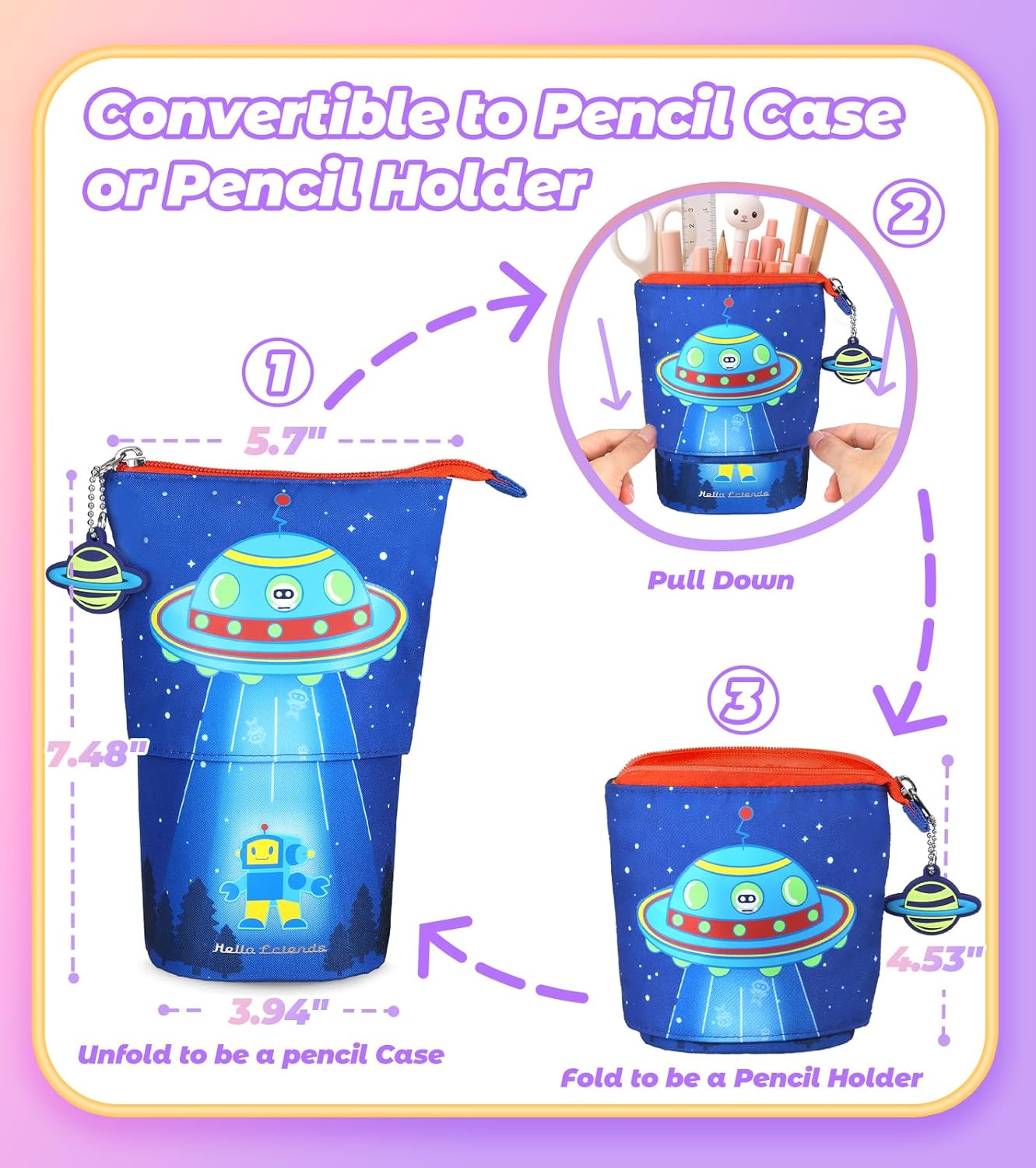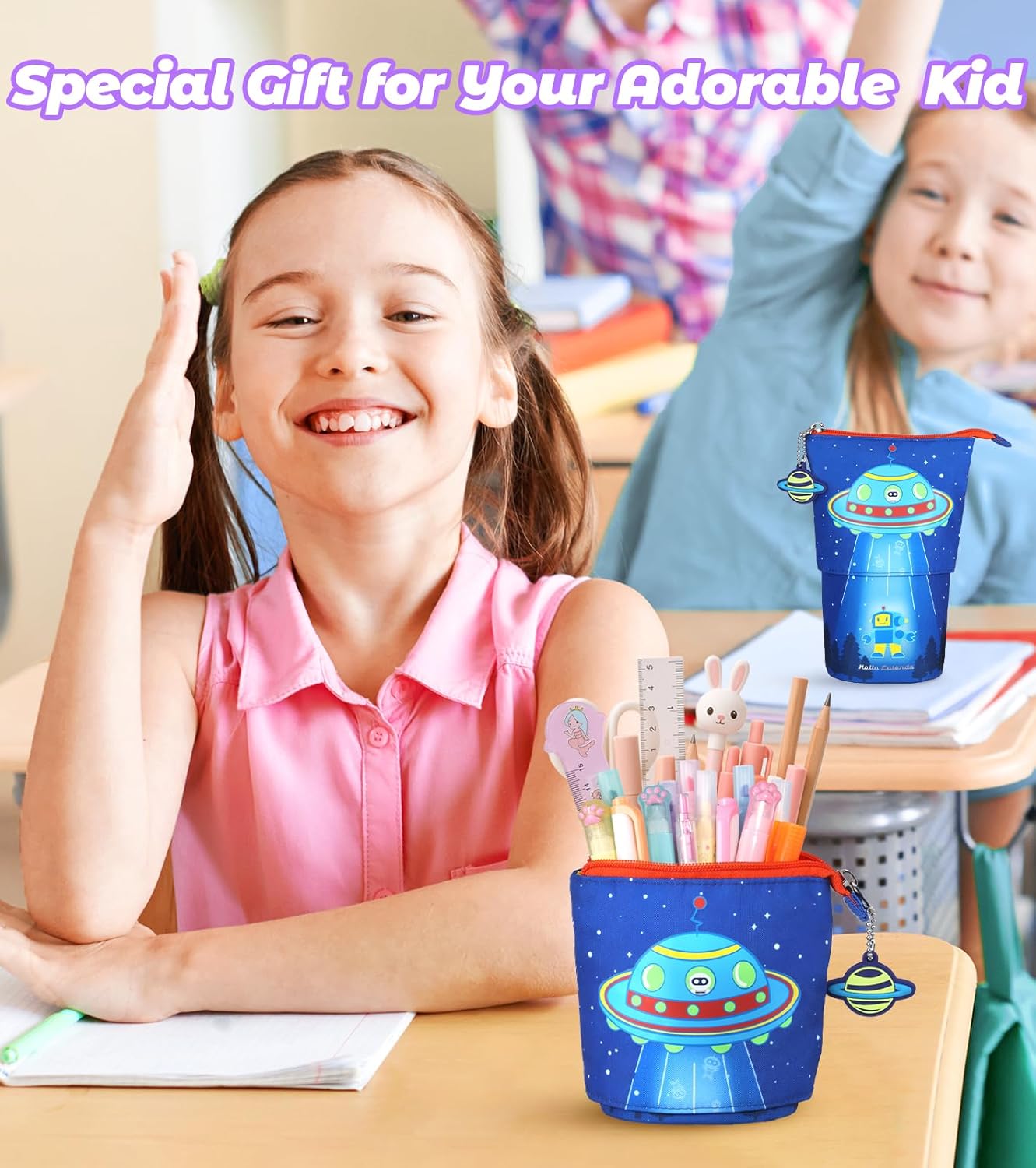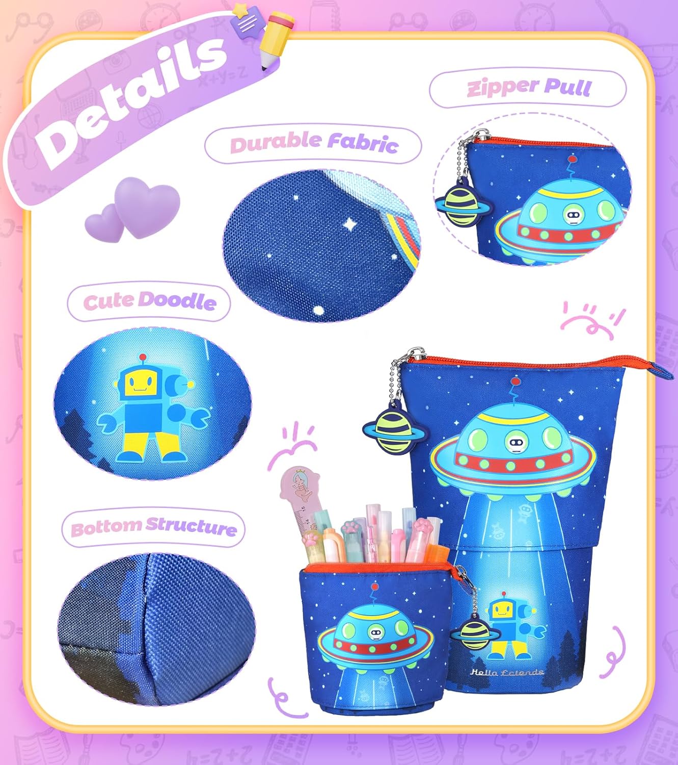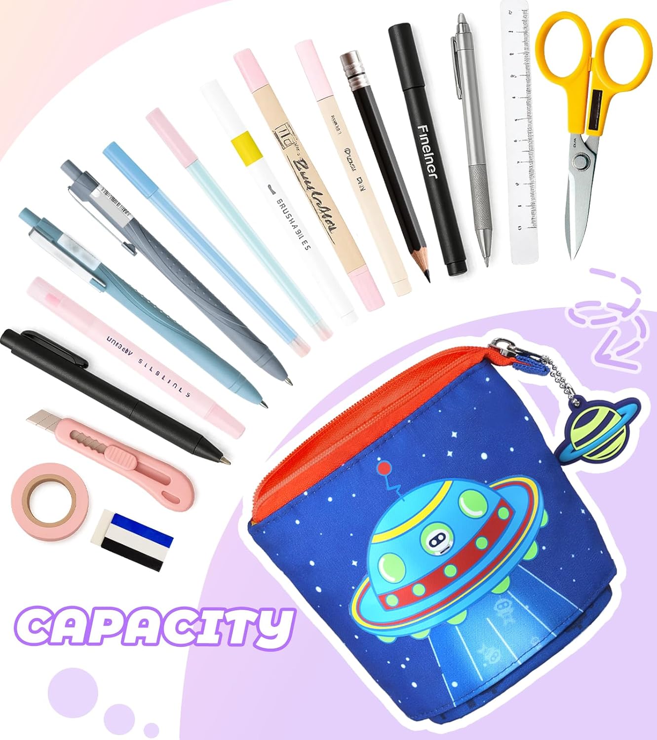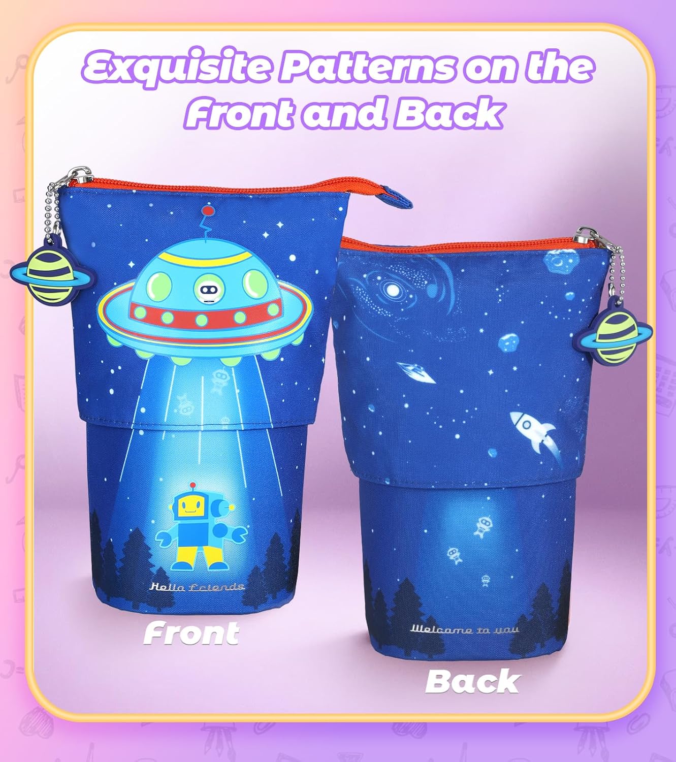 Novità astuccio in piedi: con il suo design blu intenso, decorato con astronavi, pianeti e stelle, questo astuccio è sia fresco che accattivante. Il suo design divertente è perfetto per i bambini, rendendolo un delizioso compagno per la scuola o attività creative Retrattile e conveniente: progettato con una caratteristica elastica facile da usare, questo astuccio si trasforma senza sforzo in un portapenne in piedi. Non è solo un astuccio, è anche un portapenne, mantenendo gli oggetti organizzati e facilmente accessibili durante l'uso Espanso e spazioso: il design espandibile offre molto spazio per riporre decine di penne, matite, pennarelli e altri articoli di cancelleria, è perfetto per tenere tutto in ordine Premium e robusto: realizzato in tela resistente e leggera, questo astuccio è resistente a polvere, graffi e usura. Le cuciture rinforzate assicurano che possa resistere all'uso quotidiano. Una robusta cerniera in metallo garantisce un'apertura e una chiusura fluide, aggiungendo alla sua facilità d'uso e durata Elementi essenziali per la scuola: una pratica aggiunta al materiale scolastico, perfetto per l'uso quotidiano, la stagione del rientro a scuola. È abbastanza versatile per riporre articoli di cancelleria, forniture artistiche, piccoli giocattoli o qualsiasi altro oggetto quotidiano, rendendolo un regalo divertente e pratico per i bambini