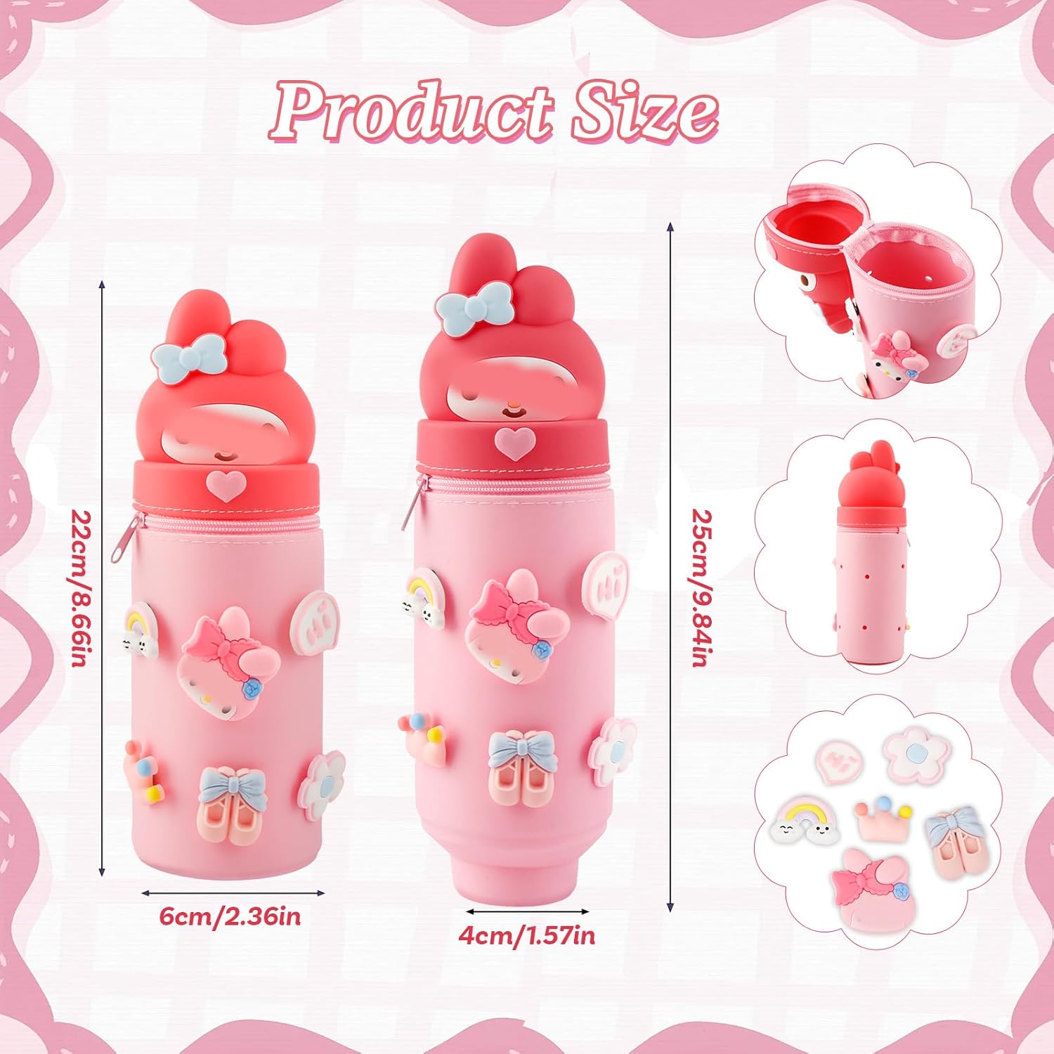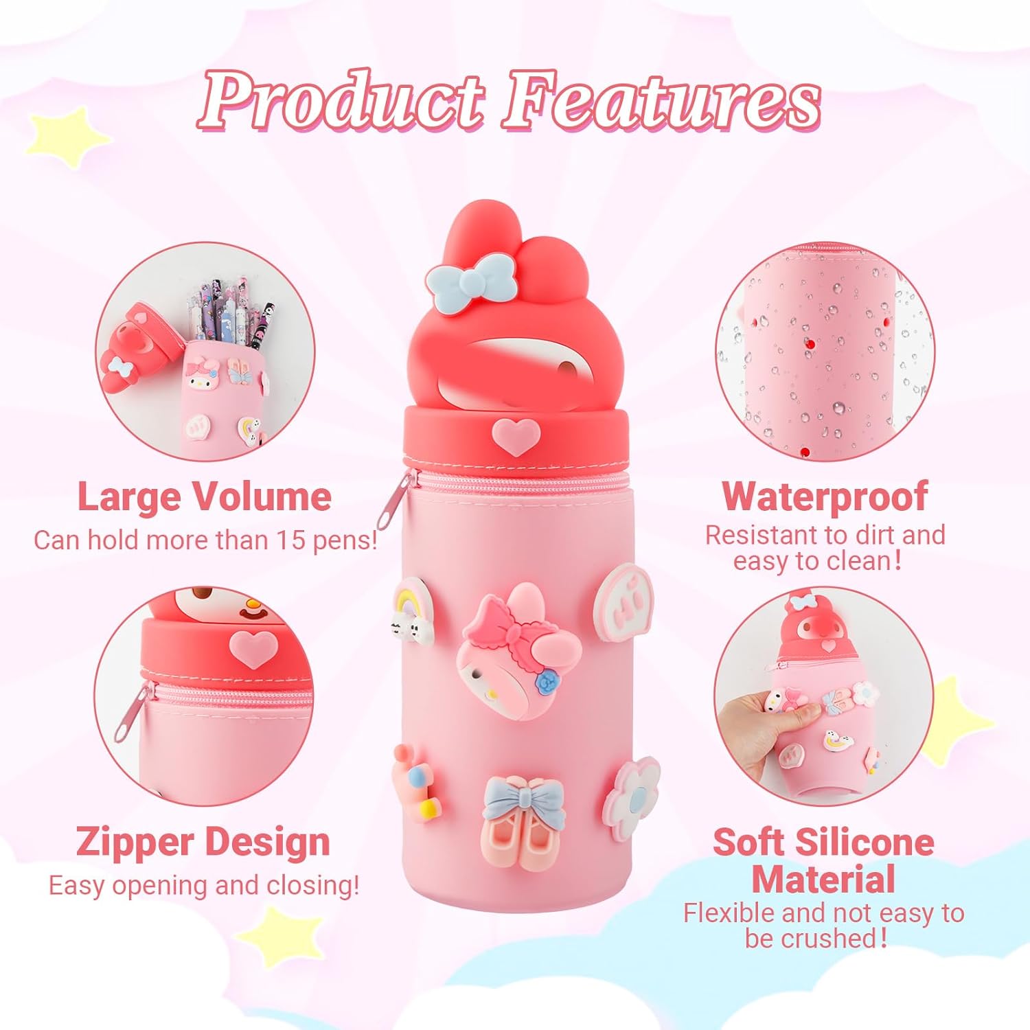 【Design telescopico innovativo】Il nostro Kuromi Astuccio, con il suo esclusivo design cilindrico elasticizzato, si adatta in modo flessibile alla lunghezza della matita (22-25 cm di altezza). Perfetto per matite colorate, pennarelli o pennelli da trucco: basta tirarlo verso l'alto o spingerlo! 【Silicone di alta qualità e facile da pulire】Portapenne 2 in 1 Realizzato in silicone morbido e inodore: resistente agli strappi, lavabile ed ecologico. La superficie liscia può essere pulita con acqua e rimane permanentemente indeformabile, ideale per le mani dei bambini! 【Multifunzionale 2 in 1】kuromi Astuccio 2 in 1,Astuccio + portapenne in uno! Grazie alla sua base stabile, organizza le penne sulla scrivania o diventa un pratico astuccio per la scuola, l'ufficio o i viaggi. 【Ampia capacità】Con un'altezza di 22 cm e un diametro di 6 cm, offre spazio per oltre 20 penne, righelli, pennelli o cosmetici. La robusta cerniera protegge il contenuto da eventuali perdite. 【Ampiamente usato】 Questi simpatici astucci possono essere facilmente infilati nella tua tasca quotidiana, ma possono contenere più penne, matite o altri strumenti di scrittura di cui potresti aver bisogno, così come bei regali per autori, amici e compagni di classe. Ritorno a scuola per compleanni o altri eventi importanti.