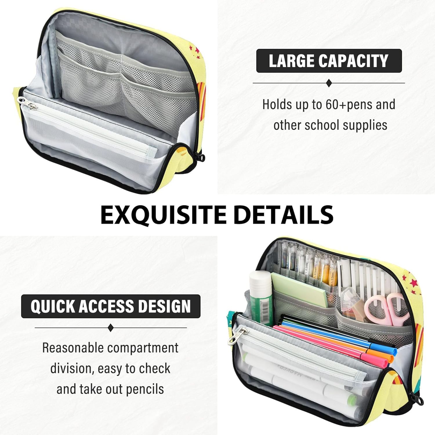 Versatile funzionalità in piedi: la custodia in tela con cerniera si apre piatta e si ripiega in modo sicuro per creare un contenitore autoportante, combinando portabilità con comodità sulla scrivania Progettato per la resistenza: dai banchi di scuola alle borse da viaggio, l'astuccio per ragazze resiste a attrito e sporco, con nylon a trama fitta che fornisce affidabilità a lungo termine Soluzione di archiviazione efficiente: le borse per matite e giocattoli sono dotate di una grande sezione centrale e tasche extra, che lo rendono facile da riporre e individuare piccoli articoli per la scuola o l'ufficio Ideale per casa, scuola o viaggio: organizza cosmetici, cavi, penne e altri piccoli oggetti con astuccio per il trucco per matite, una soluzione compatta e utile per la vita in movimento Ideale per occasioni speciali: l'astuccio per matite scolastiche offre un tocco personale con stampe vivaci e personalizzazione opzionale, ideale per lauree, compleanni o rientro a scuola