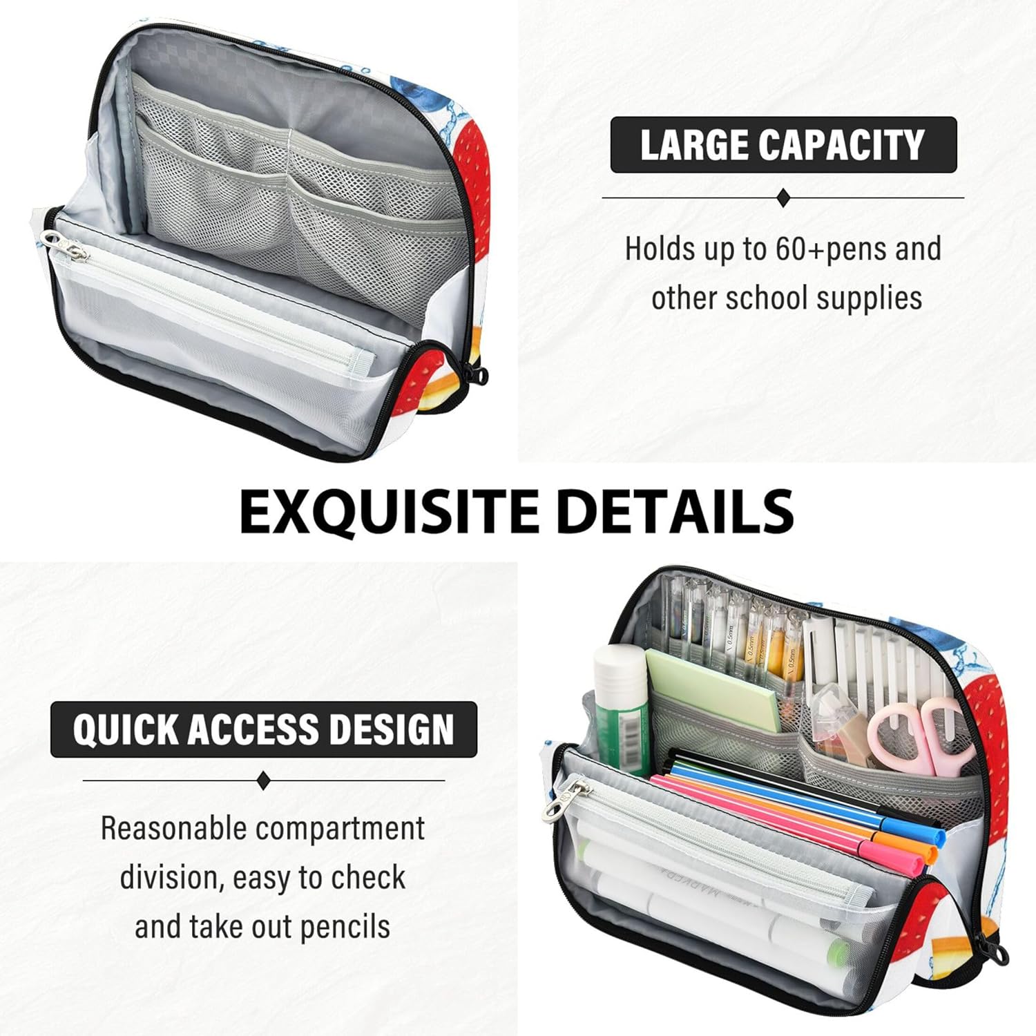 Rimane in posizione verticale per un facile accesso: il materiale scolastico per ragazze si piega in una base stabile utilizzando pulsanti magnetici, trasformandosi in un portapenne verticale che mantiene i tuoi oggetti essenziali visibili e raggiungibili Resistente all'usura e lavabile: l'organizzazione e lo stoccaggio in classe sono dotati di nylon di poliestere di alta qualità che resiste a graffi e macchie, offrendo allo stesso tempo un facile lavaggio a mano per una freschezza a lungo termine Interno pulito e spazioso: progettato per comodità, l'organizer per matite colorate separa i tuoi oggetti utilizzando una sezione principale, una tasca in rete con cerniera e una tasca aperta per un rapido recupero degli oggetti Progettato per molteplici utilizzi: sia che tu stia andando a lezione o per un viaggio, l'astuccio carino si adatta facilmente come astuccio per il trucco, astuccio per penne o organizer per la giornata lavorativa Elegante e personalizzato: le borse organizer da viaggio si distinguono per stampe divertenti e caratteristiche personalizzabili, che le rendono ideali per regali premurosi in ogni occasione