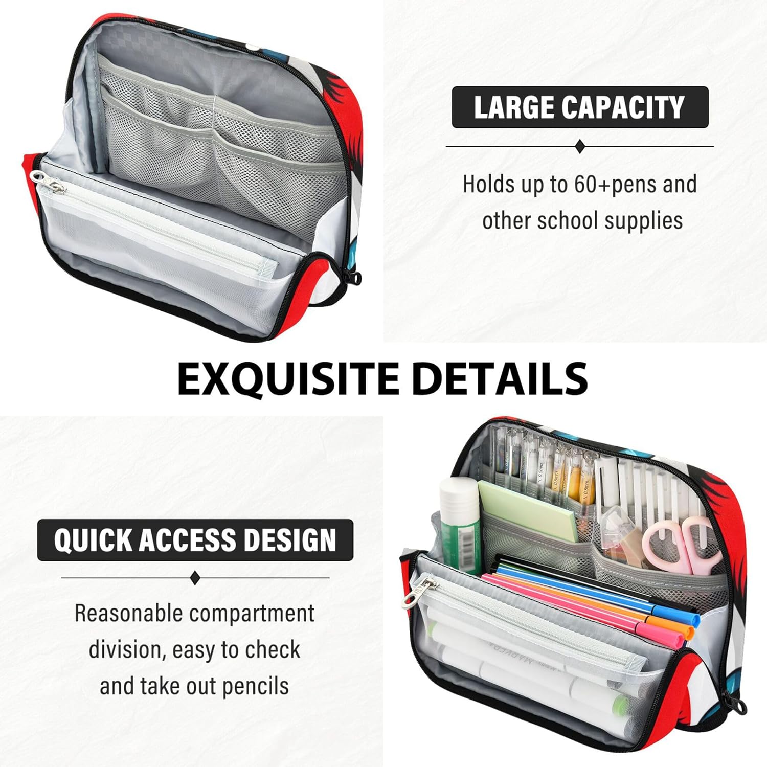 Pratico design autoportante: l'astuccio per ragazze si trasforma facilmente da una custodia con cerniera a un contenitore verticale da scrivania, aiutandoti a individuare rapidamente penne, strumenti o accessori a colpo d'occhio Materiale affidabile: grazie al suo nylon impermeabile e antigraffio, i sacchetti per matite rimangono ordinati e intatti, ideali per stili di vita in movimento o studenti attivi Layout intelligente per riporre: tieni le tue forniture in ordine: il portamatite per ragazze include uno scomparto principale, una tasca in rete con cerniera e uno slot aperto per separare e accedere agli oggetti con facilità Un sacchetto, molti scopi: astucci con cerniera si spostano facilmente tra la custodia per la scuola, il trucco o il porta attrezzi da viaggio, ideali per studenti, professionisti e creativi Eleganti e personalizzati: i sacchetti con cerniera si distinguono per stampe divertenti e caratteristiche personalizzabili, che lo rendono adatto per regali premurosi in ogni occasione