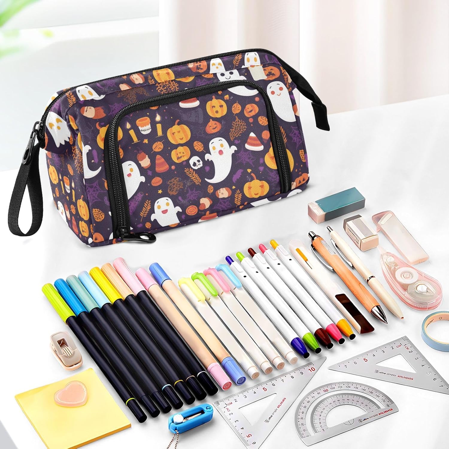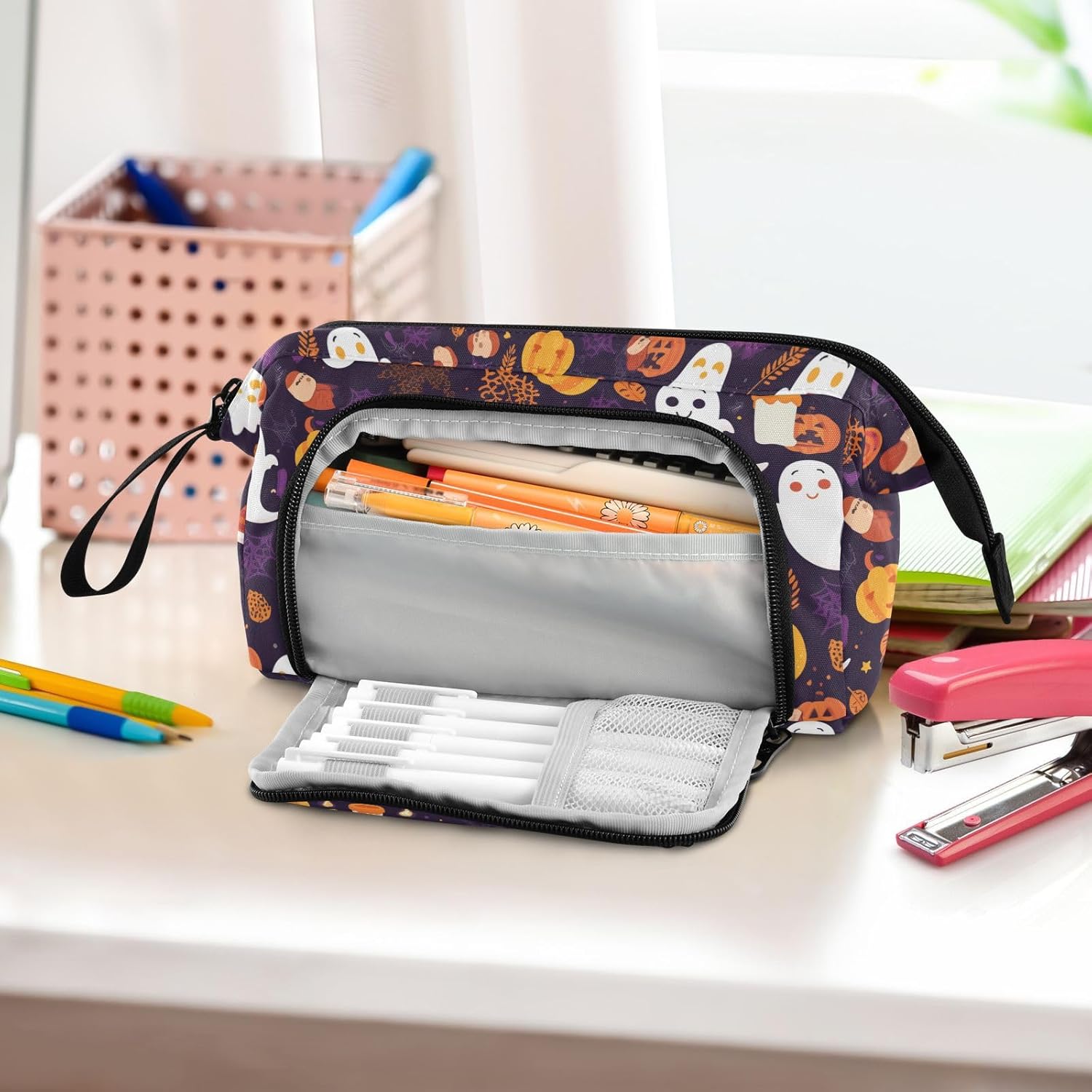 Materiale di lunga durata: realizzato in tessuto di nylon resistente, cerniera forte e resistente. Più robusto, leggero, resistente ai graffi, facile da pulire. (Non adatto a bambini di età inferiore ai 3 anni!) Grande capacità: 24 x 9,5 x 15 cm. L'astuccio per la scuola dispone di una grande capacità. Il grande scomparto centrale consente di inserire almeno 40-60 penne e può ospitare altri oggetti di cancelleria come penne, appunti, forbici, nastro, gomme, righelli, temperamatite, ecc. Due tasche interne sono adatte per le tue piccole necessità che facili da perdere, come carte, chiavi, contanti, ecc. Facile da usare e trasportare: l'astuccio può aprirsi attraverso la cerniera superiore e la cerniera laterale. Dalla tasca superiore, è possibile accedere facilmente a calcolatrici, regole, pennelli, forbici, strumenti per il trucco e alcuni oggetti più grandi di cui hai bisogno direttamente. Dalla tasca laterale, puoi prendere o mettere penne, matite, pennelli che ti piacciono sugli scomparti per penne. Multi funzioni: il nostro prodotto non è per la scuola e l'ufficio, ma anche per cosmetici e altre piccole necessità. Gli astucci possono essere utilizzati come astuccio per pennelli per gli amanti della pittura, borsa per il trucco per donne, borsa per medicine per la famiglia, borsa 3C per prodotti elettronici, borsa da viaggio per te stesso. Struttura lavabile: l'intero astuccio è lavabile. Si consiglia il lavaggio a mano, non è consentito il lavaggio in lavatrice. Non utilizzare candeggina per la pulizia.